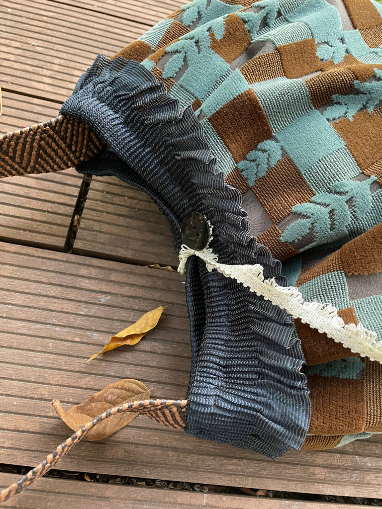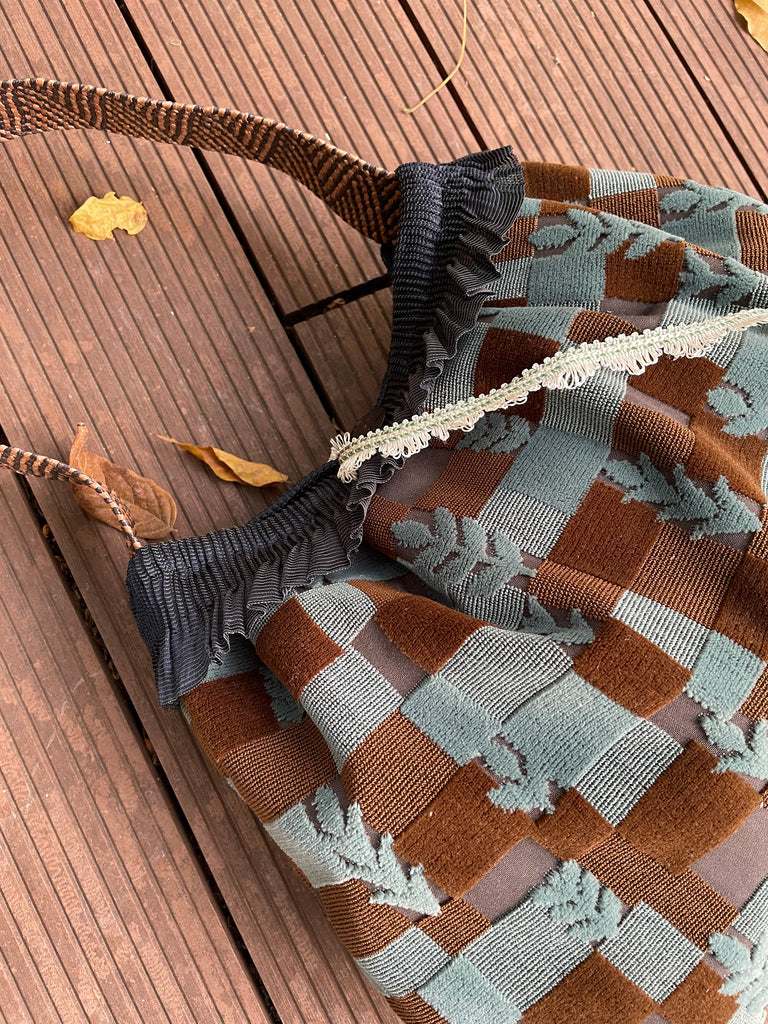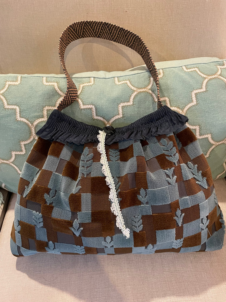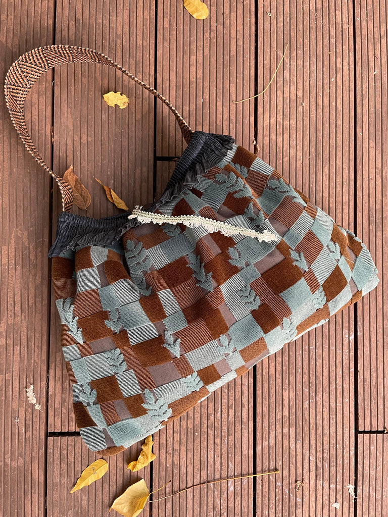 Borsa di grandi dimensioni, davvero capiente, cucita interamente a mano con tessuto da arredamento, doppiato, in modo da garantirne tenuta e consistenza. Il tessuto esterno è a quadrotti di velluto, marrone e avio, con disegni di piccole foglie stilizzate. La bordura in alto è plissettata, blu scuro, mentre il manico, piatto e comodissimo è in cordone leggermente elasticizzato. La borsa misura 43 cm di larghezza per 29 di altezza .