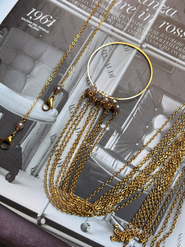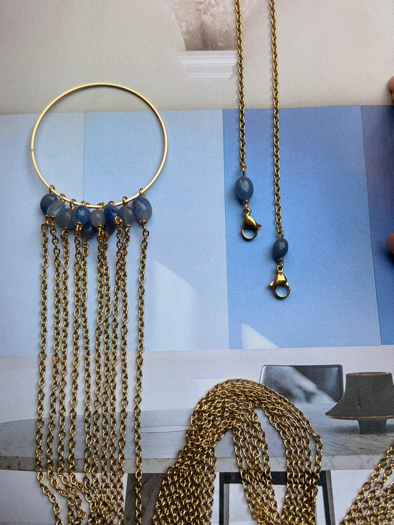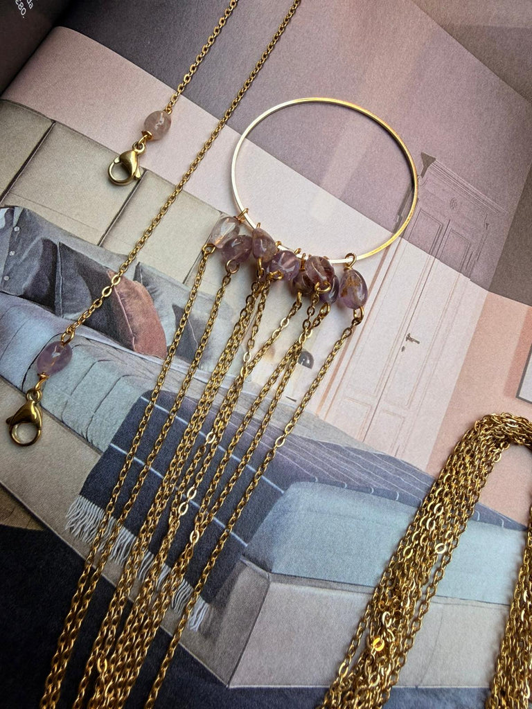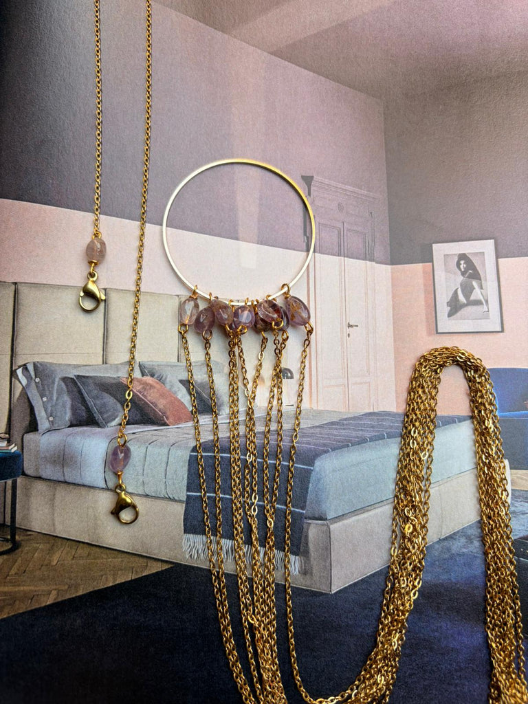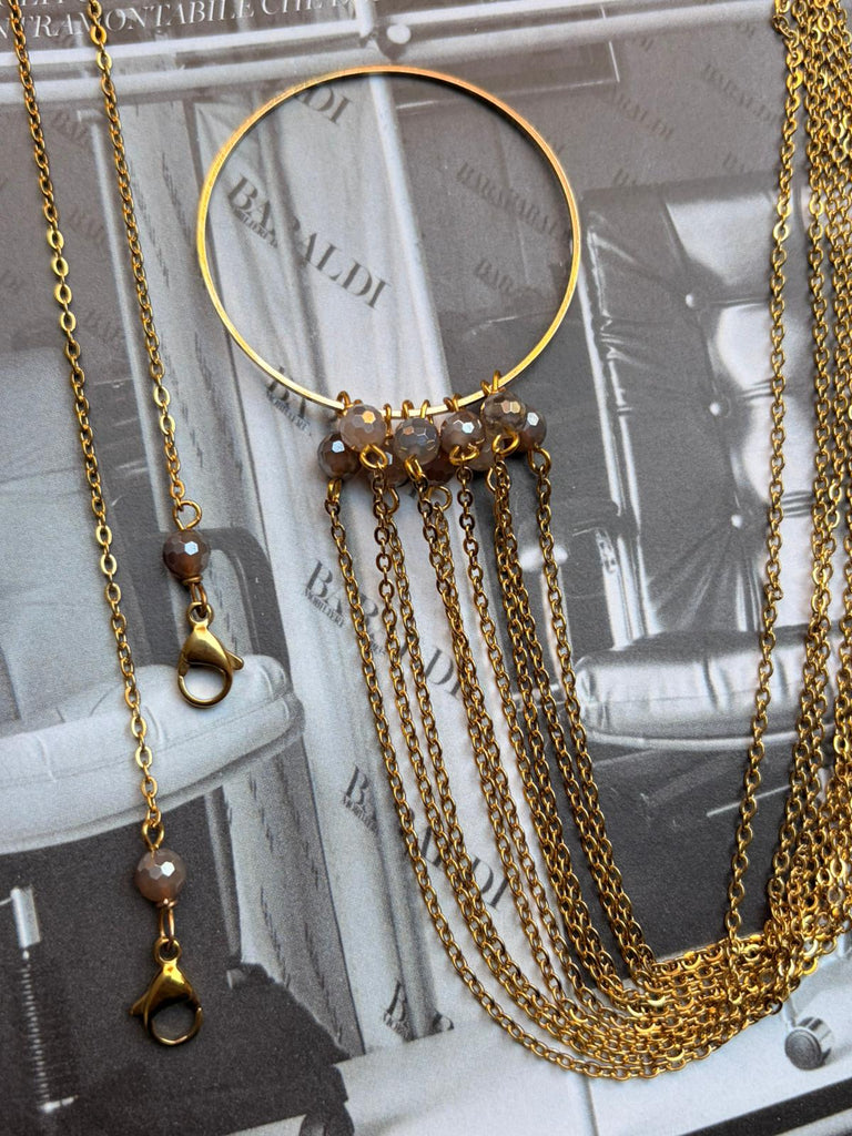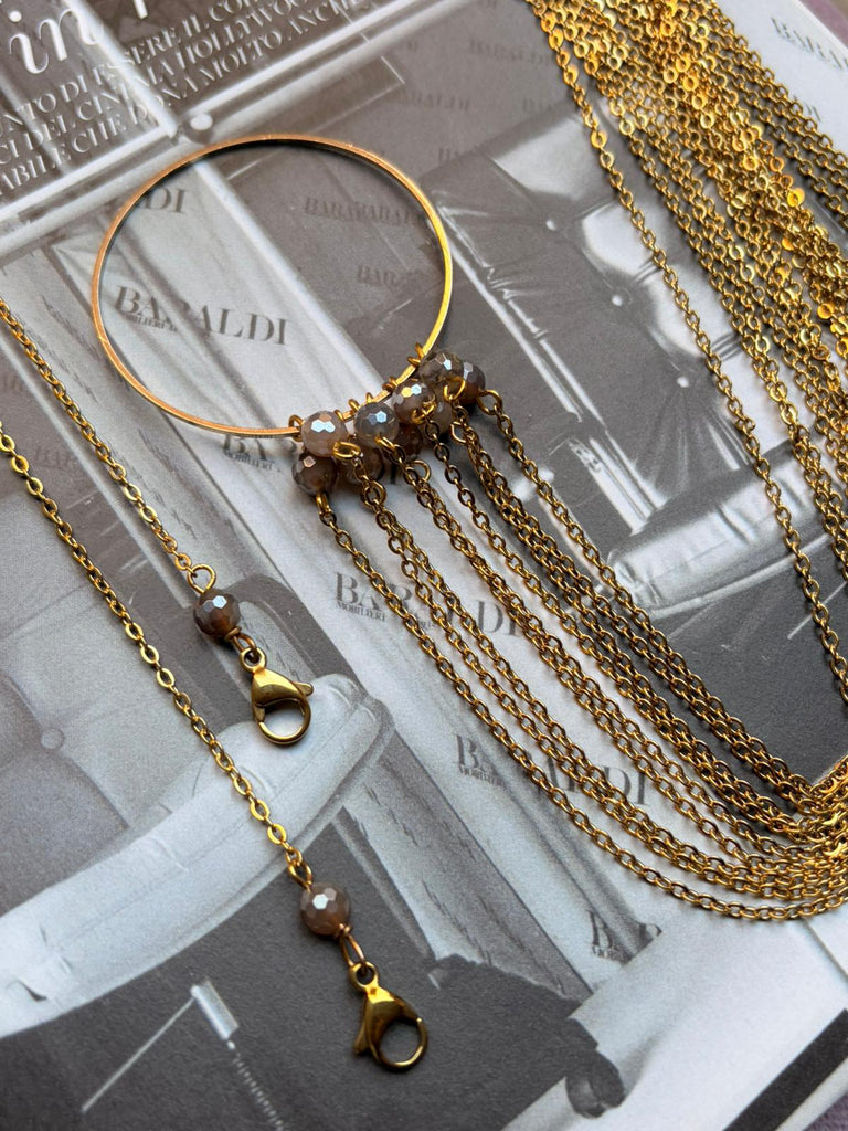 Una collana un po’ magica che si trasforma da corta, se indossata a sciarpa, a lunga, se indossata a cravattino. È costruita con tante catenine dorate impreziosite da piccole pietre dure ad una estremità, collegata ad un cerchio dorato. Una di queste catenine, però, ha due moschettoni alle estremità e questo consente di indossare la collana in un modo totalmente diverso. Staccando, infatti, questa catenina e allacciandola al cerchio, questa forma un girocollo, mentre tutte le altre catenine scendono davanti. Realizzabile in altri colori su richiesta.