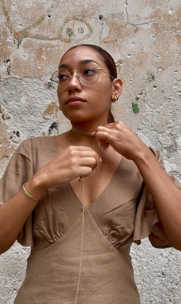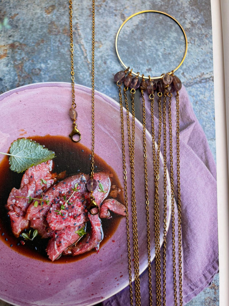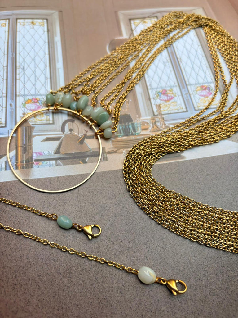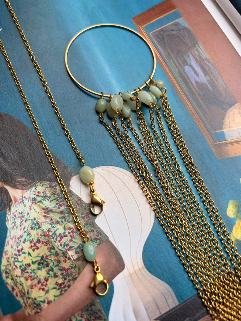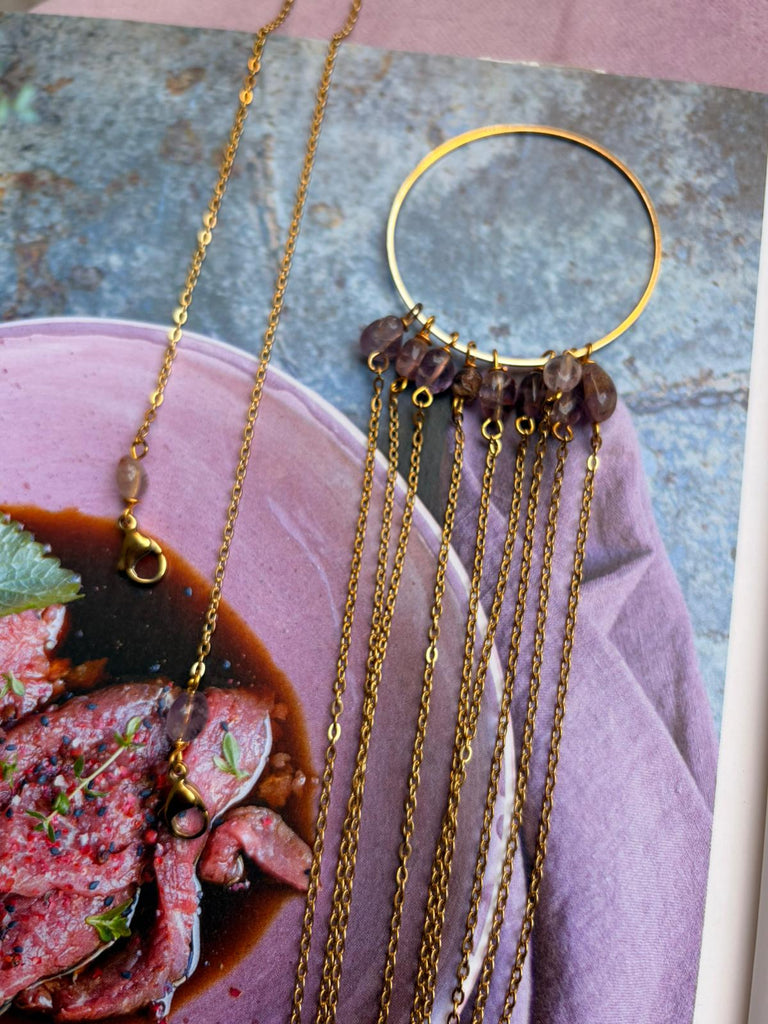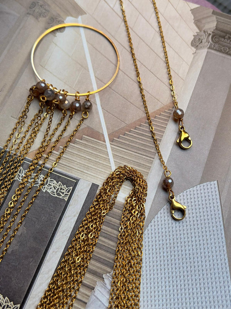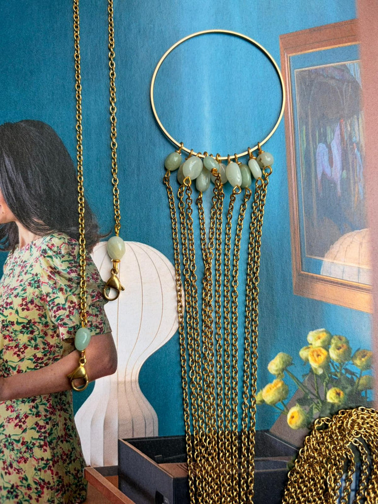 Una collana un po’ magica che si trasforma da corta, se indossata a sciarpa, a lunga, se indossata a cravattino. È costruita con tante catenine dorate impreziosite da piccole pietre dure ad una estremità, collegata ad un cerchio dorato. Una di queste catenine, però, ha due moschettoni alle estremità e questo consente di indossare la collana in un modo totalmente diverso. Staccando, infatti, questa catenina e allacciandola al cerchio, questa forma un girocollo, mentre tutte le altre catenine scendono davanti. Realizzabile in altri colori su richiesta.