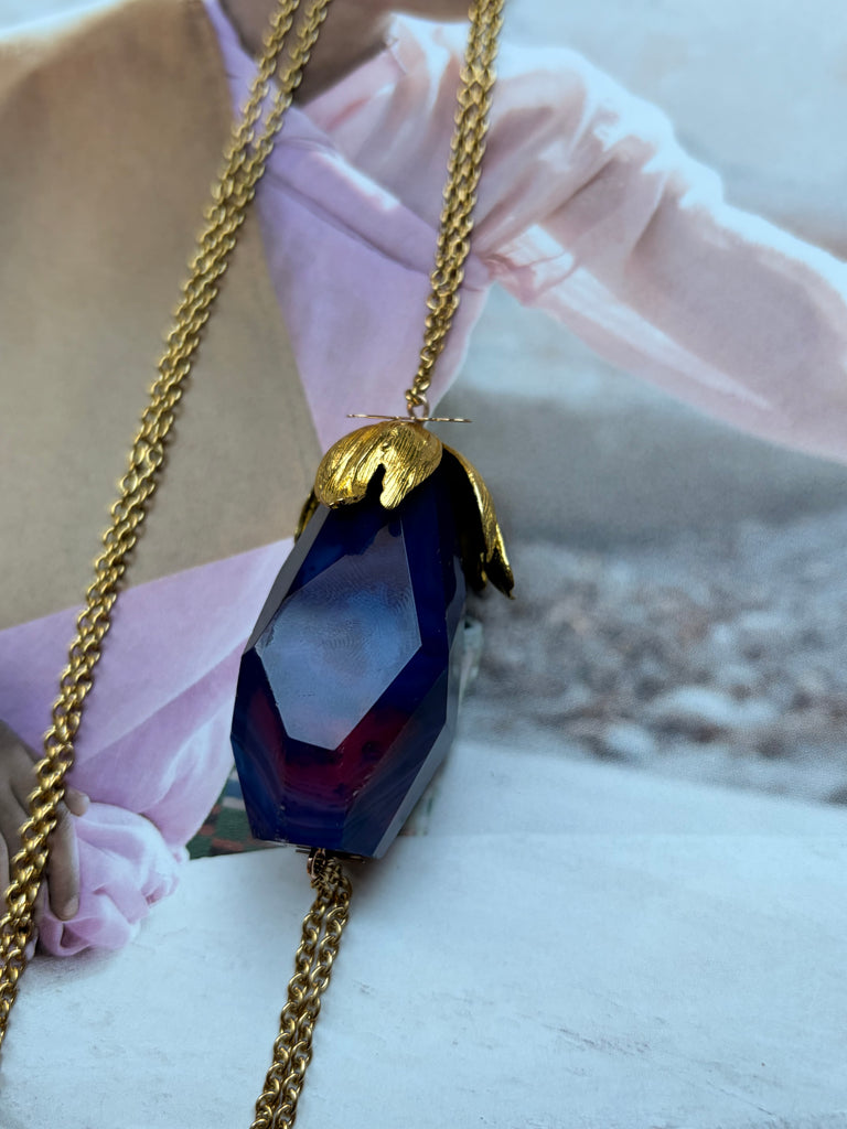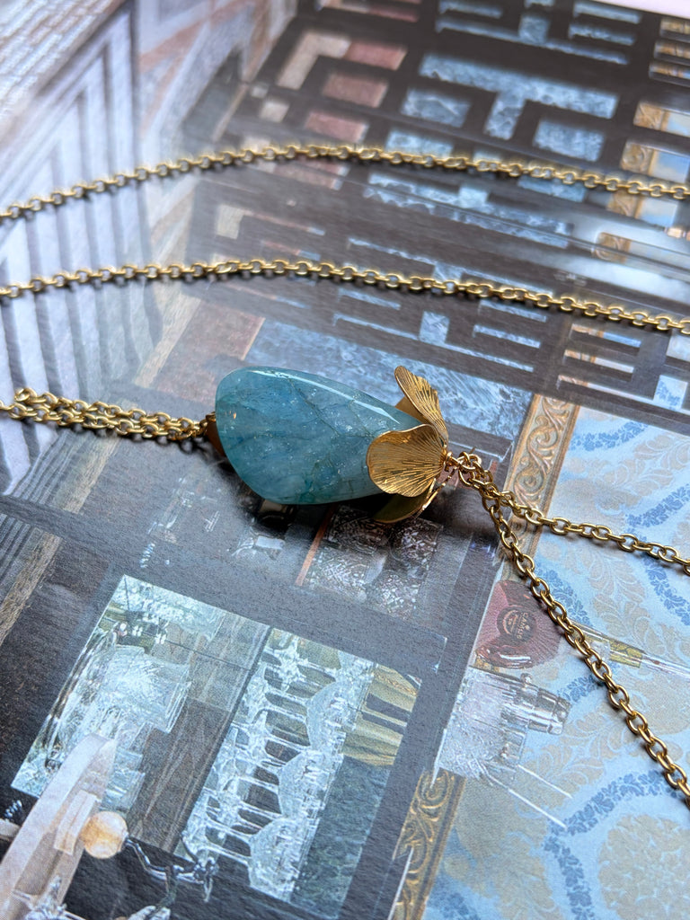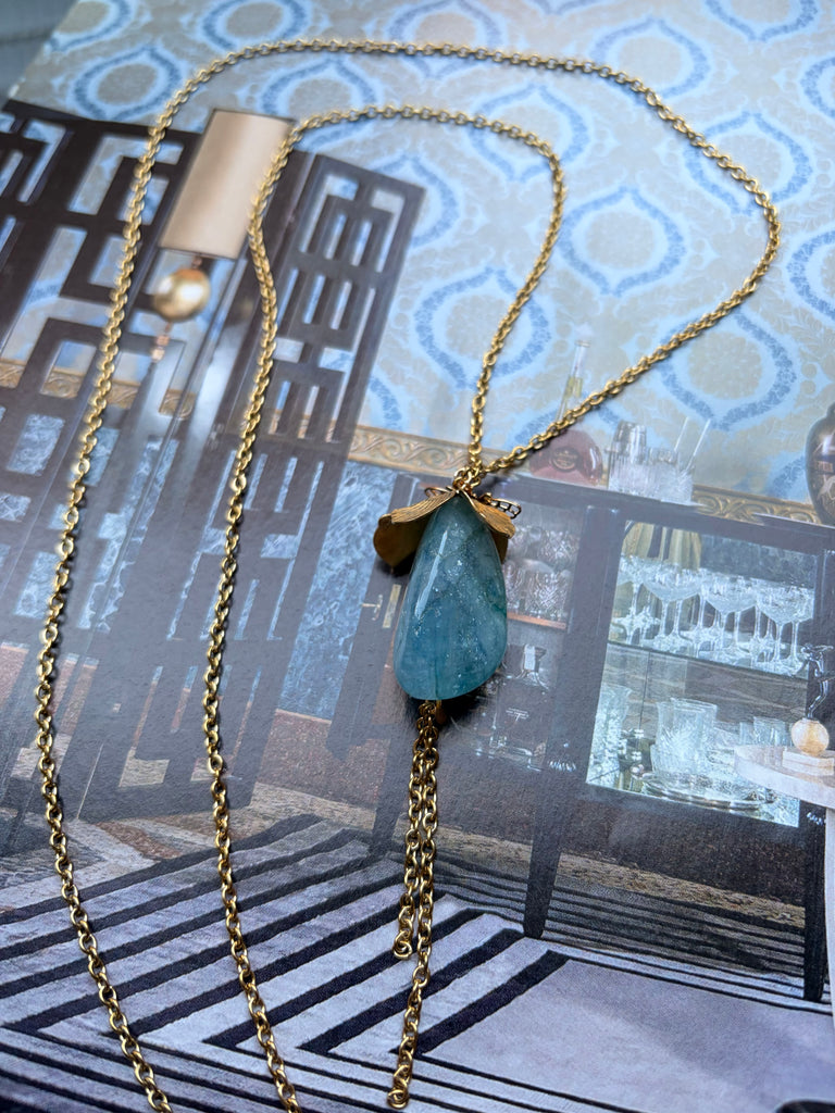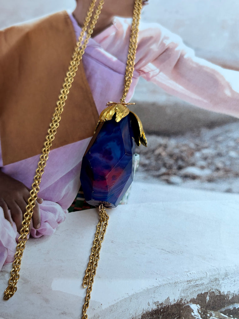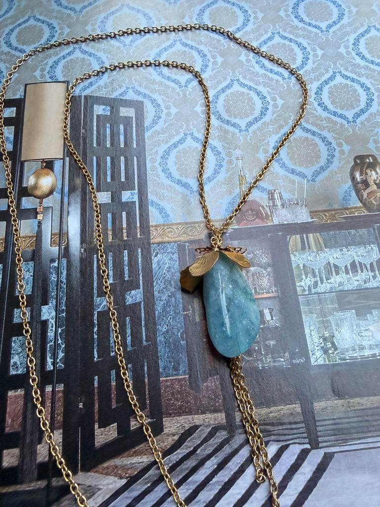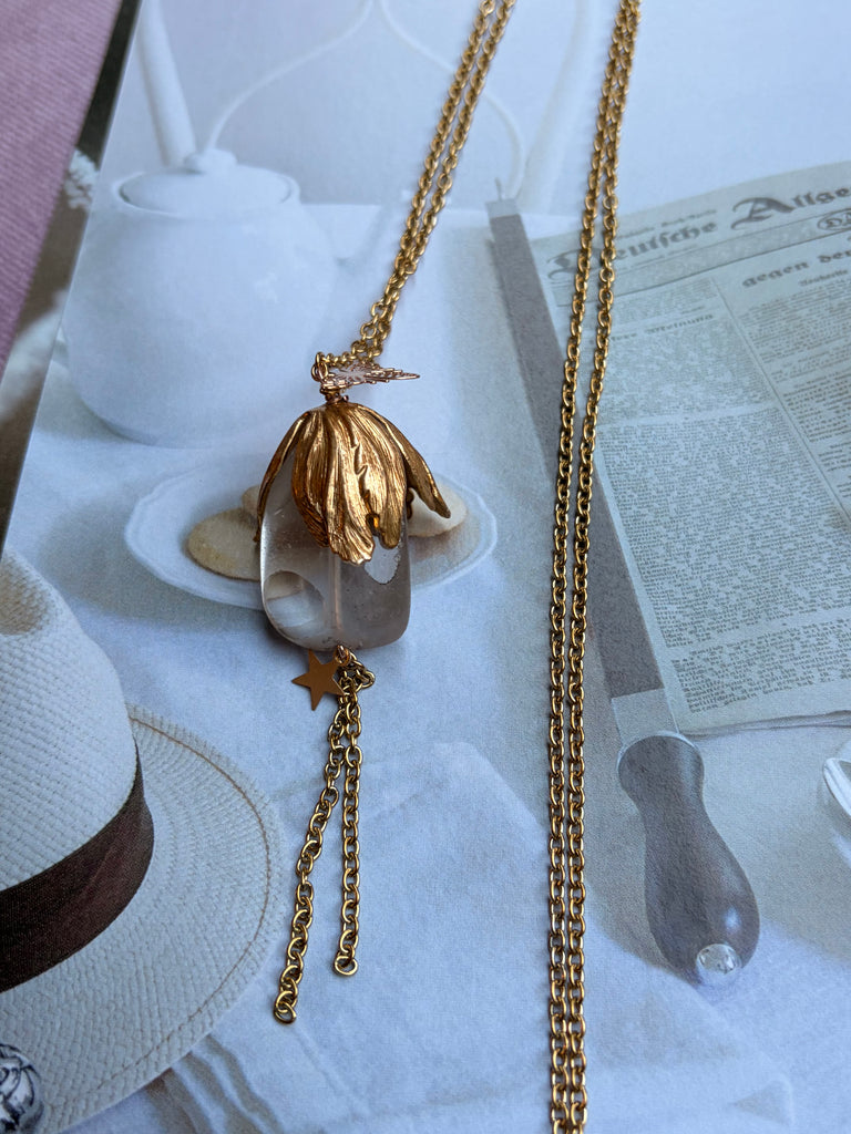 Una collana lunga, lineare ed elegantissima, adatta per impreziosire uno stile semplice e raffinato. Una lunga catenina in acciaio termina con una pietra dura, incastonata in un bocciolo dorato dalla forma sempre diversa. Piccoli charms decorano lo stile asciutto. Due piccole catenine pendono, poi, sotto la pietra. Per realizzare questa mini collezione abbiamo scelto pietre sempre diverse e sempre molto particolari, scegliete la vostra!