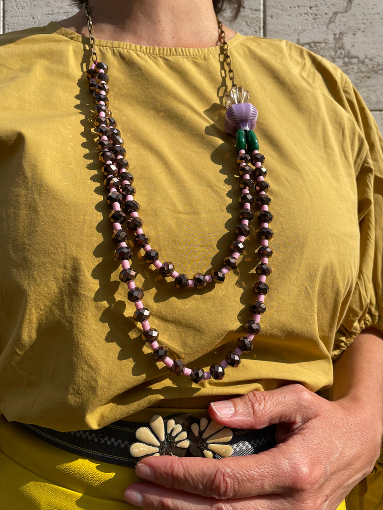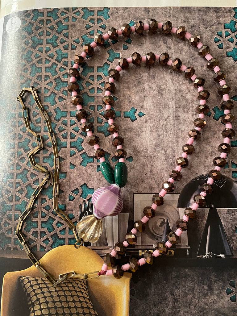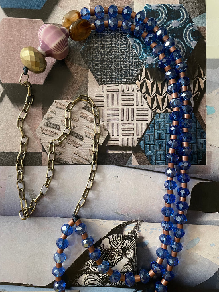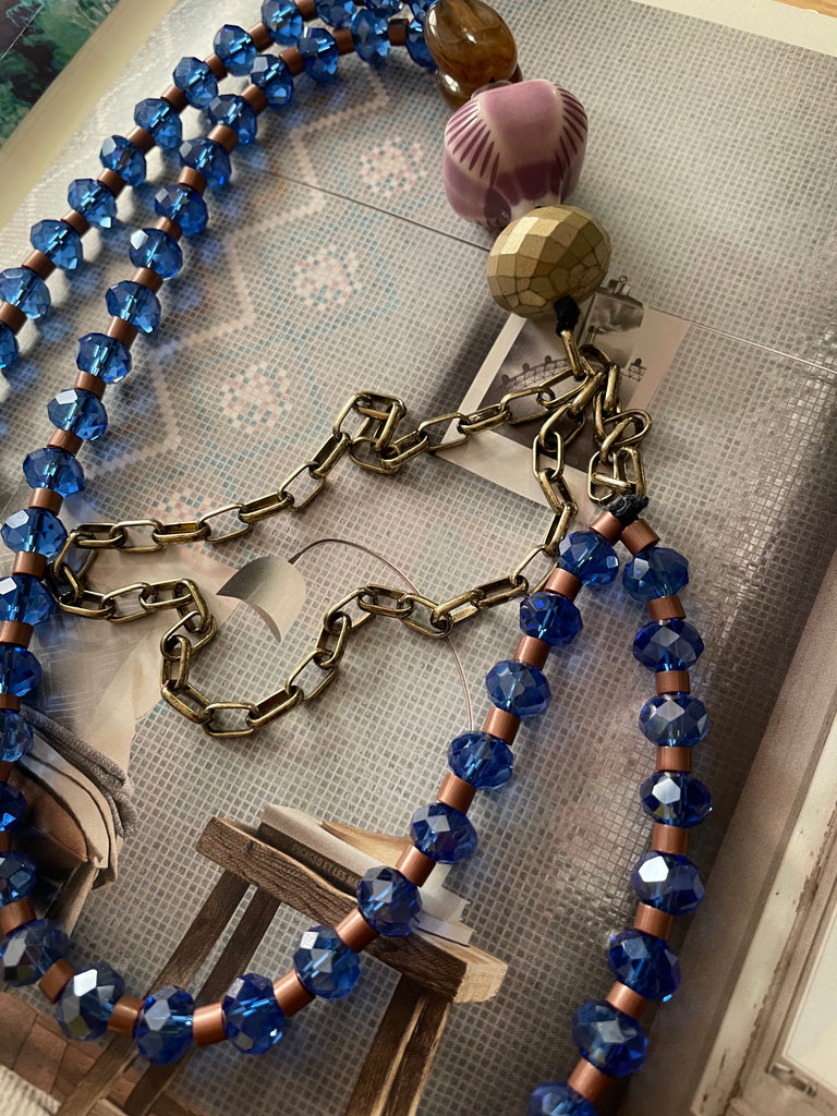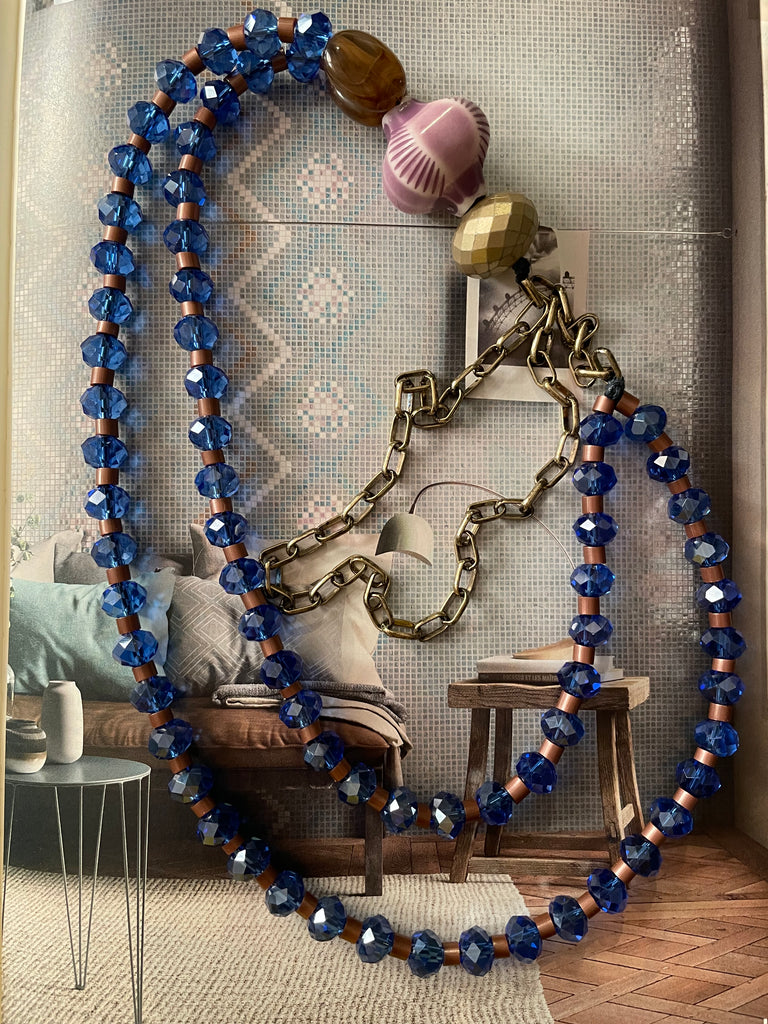 Collana lunga e comoda, costituita da una catena a maglie rettangolari di ottone brunito nella parte dietro al collo e da due giri di cristalli sfaccettati nella parte davanti. I cristalli sono separati da piccoli pezzi di silicone colorato e a contrasto, mentre, nella parte laterale, si trovano delle grandi pietre di resina molto d’effetto. La collana misura circa 80 cm di lunghezza.