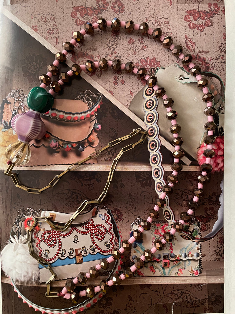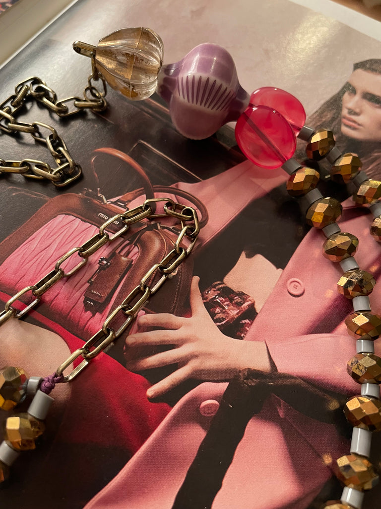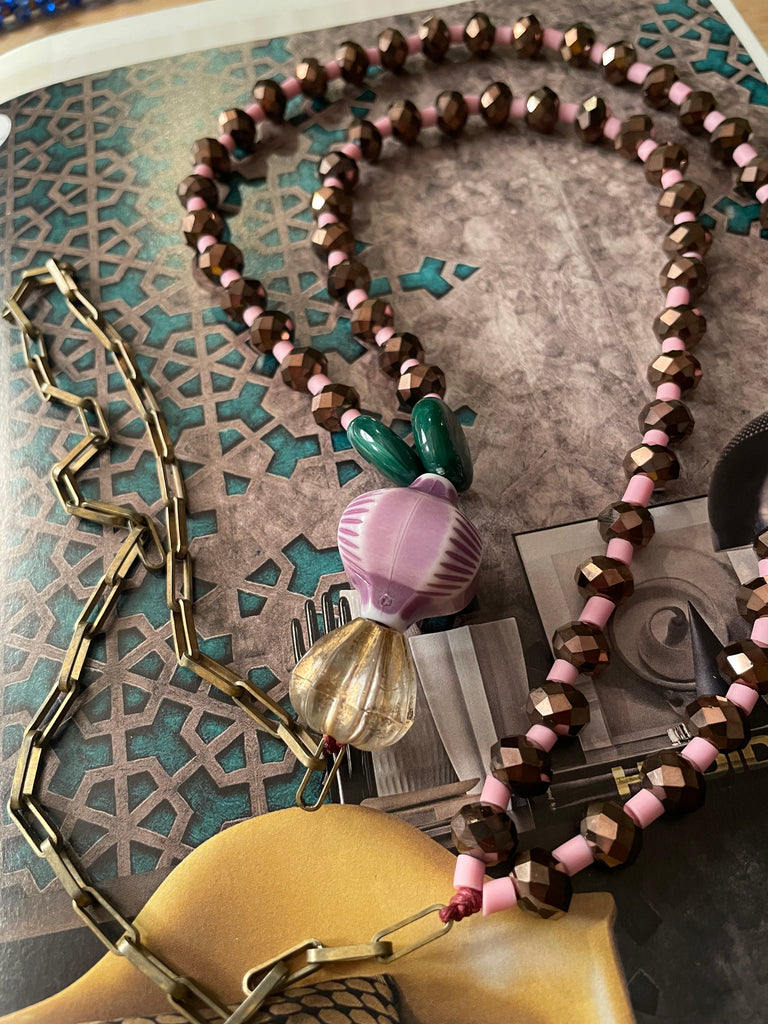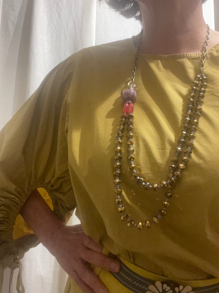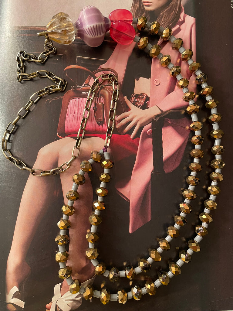 Collana lunga e comoda, costituita da una catena a maglie rettangolari di ottone brunito nella parte dietro al collo e da due giri di cristalli sfaccettati nella parte davanti. I cristalli sono separati da piccoli pezzi di silicone colorato e a contrasto, mentre, nella parte laterale, si trovano delle grandi pietre di resina molto d’effetto. La collana misura circa 80 cm di lunghezza.