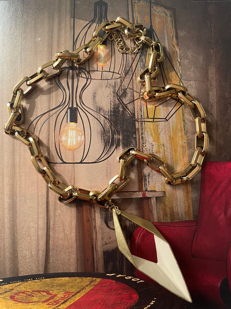 Collana a girocollo morbido composto da una catena con una splendida maglia ovale, da cui pende, centralmente, un grande rombo in ottone smaltato color avorio. Il girocollo - in ottone - misura dai 47 ai 53 cm di lunghezza (è regolabile) mentre il ciondolo in sè misura 8 cm di lunghezza.