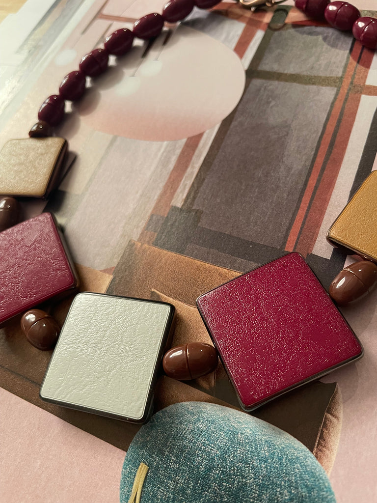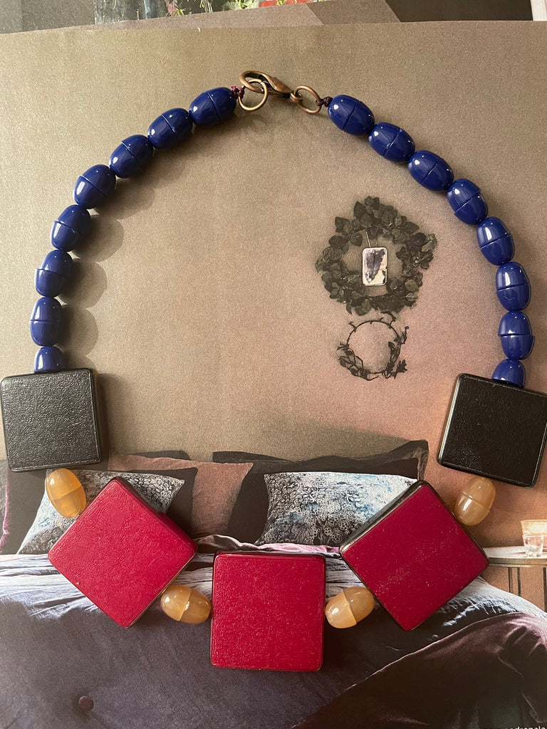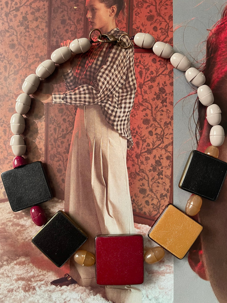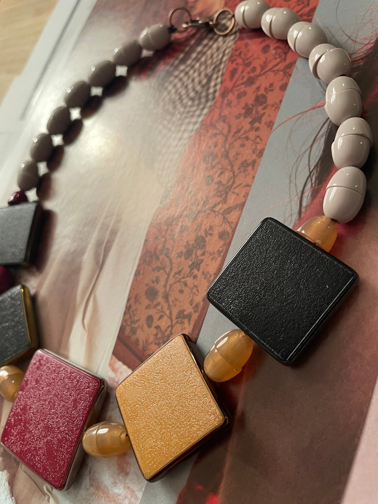 Collana girocollo totalmente in resina, formata da semisfere bombate e accoppiate che si intervallano con forme piatte e quadrate. Le combinazioni di colore sono bellissime e sempre nuove, non esiste una collana uguale all’altra. Misurano 48 cm di lunghezza e si chiudono, dietro la nuca, con un moschettone in ottone che si aggancia ad un anello