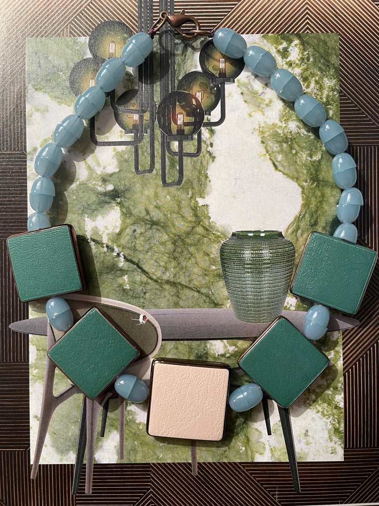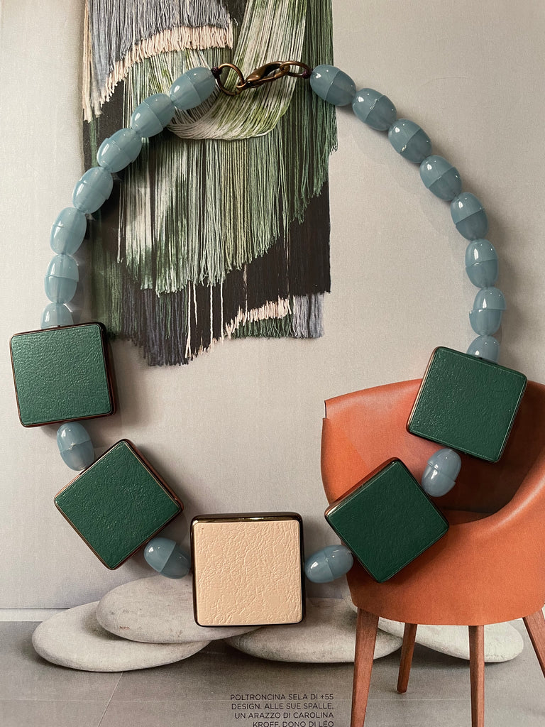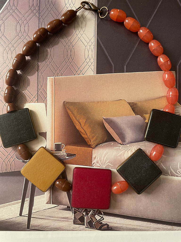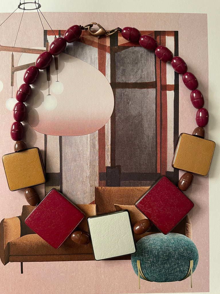 Collana girocollo totalmente in resina, formata da semisfere bombate e accoppiate che si intervallano con forme piatte e quadrate. Le combinazioni di colore sono bellissime e sempre nuove, non esiste una collana uguale all’altra. Misurano 48 cm di lunghezza e si chiudono, dietro la nuca, con un moschettone in ottone che si aggancia ad un anello
