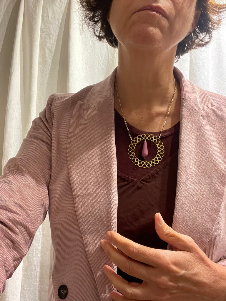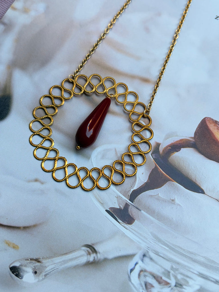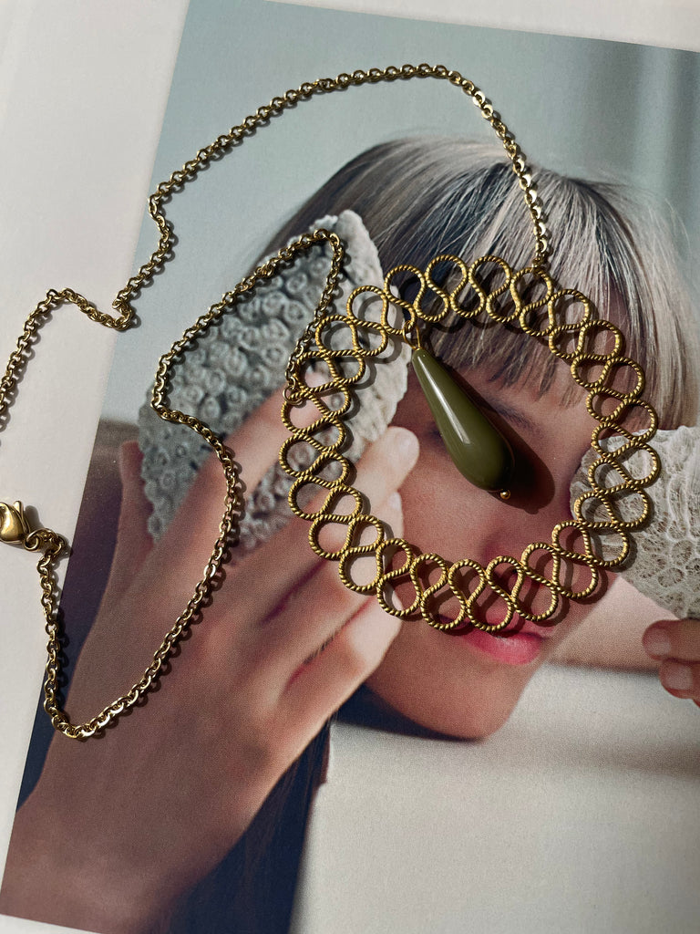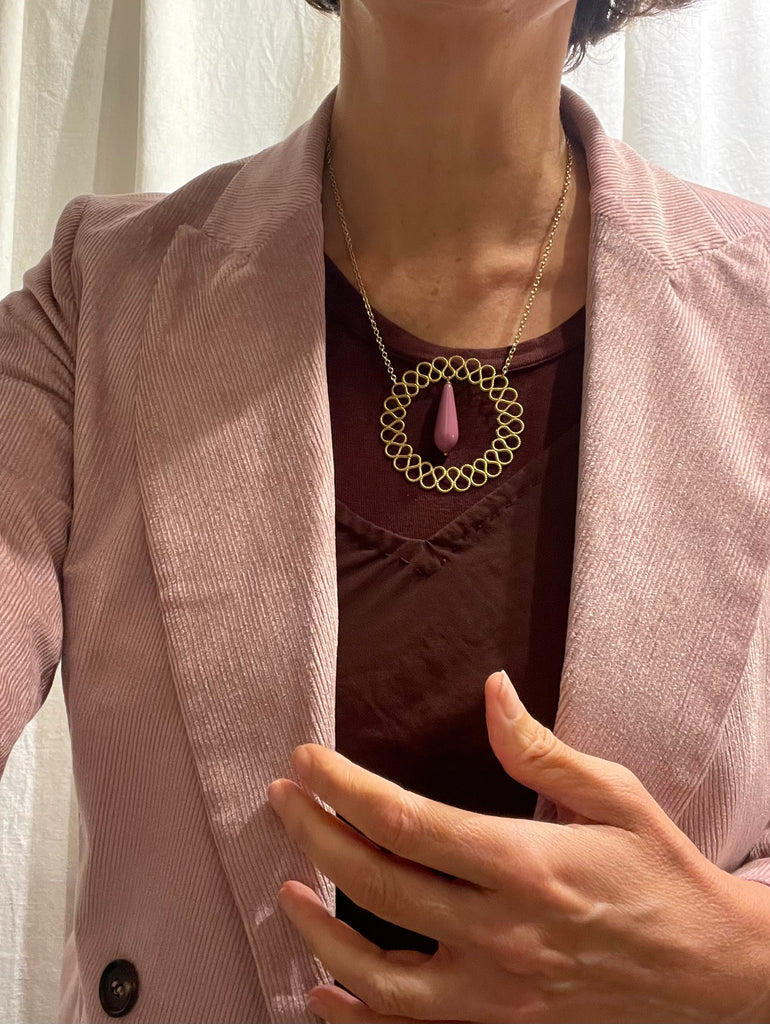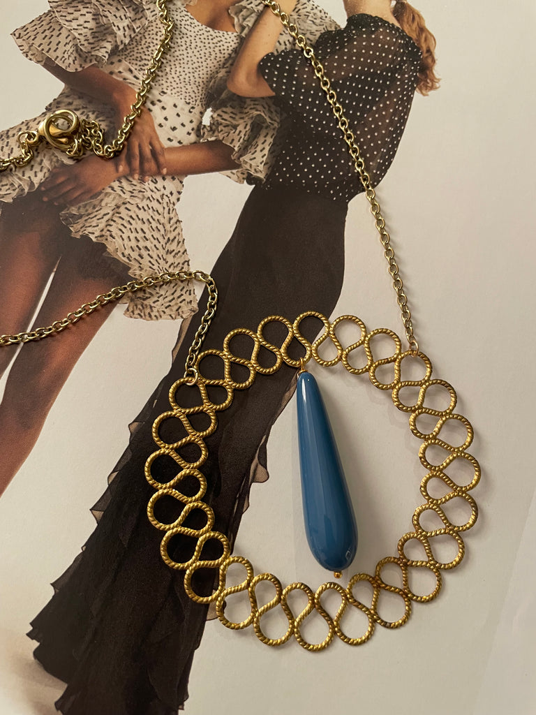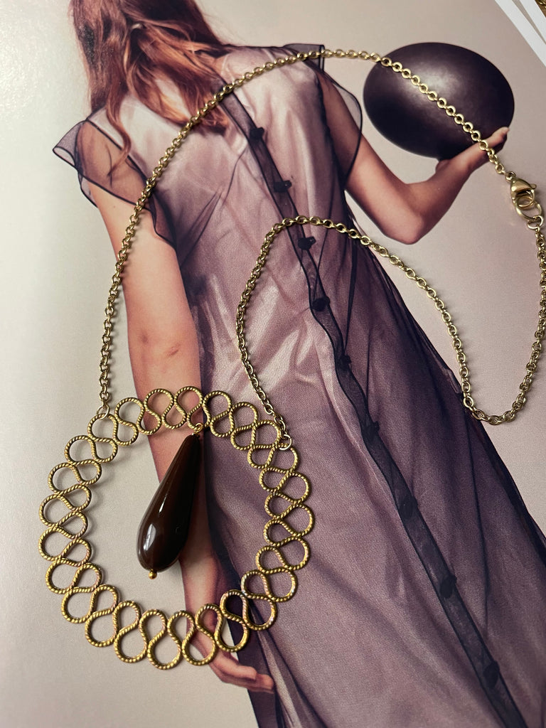 Collana molto semplice e lineare, che tuttavia si impreziosisce nella parte centrale, grazie a un motivo circolare dorato in ottone grezzo, dentro al quale pende una goccia in resina colorata. La particolarità della collana sta anche nel fatto che il pendente sta come un po’ sospeso, “tirato” verso l’alto dalle due catenine. La collana misura 50 cm di lunghezza mentre il pendente può essere piccolo (6 cm di diametro) o grande (7 cm di diametro).