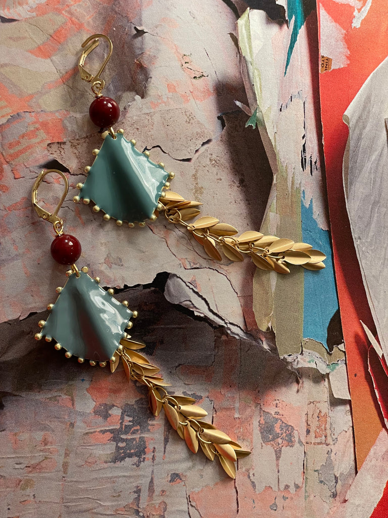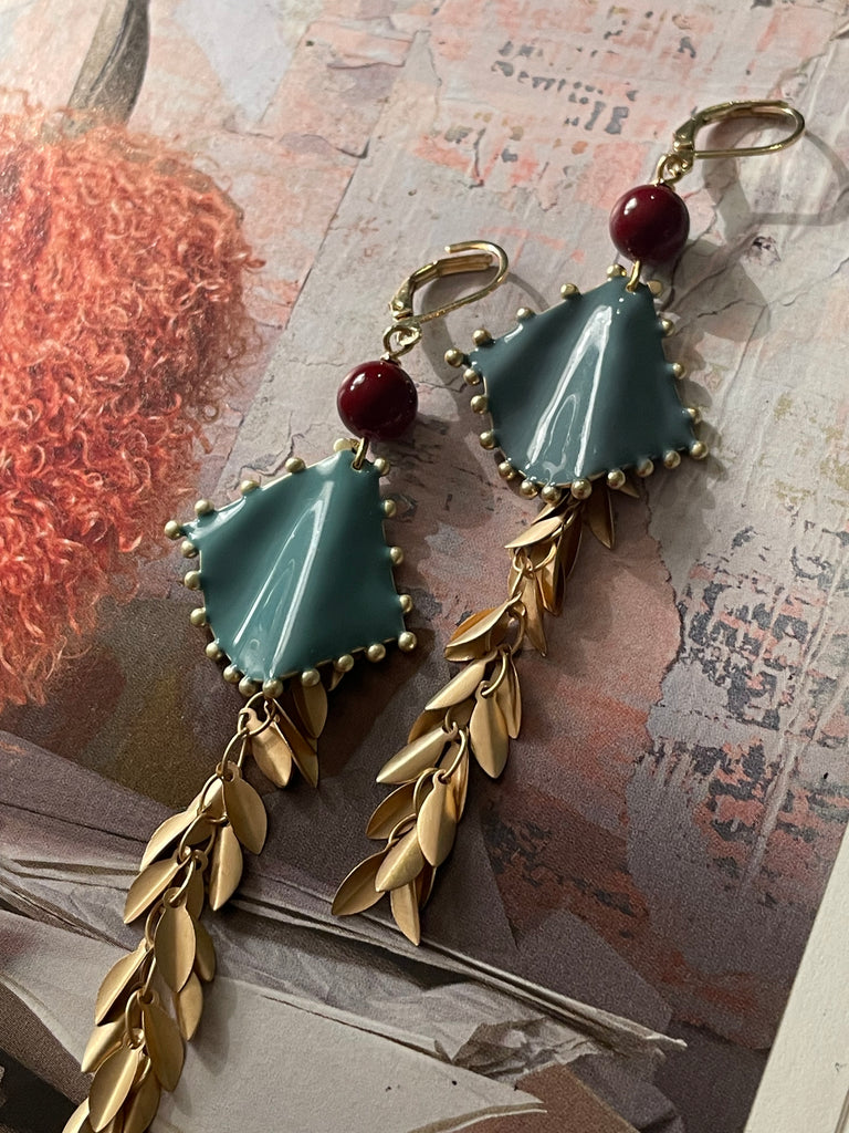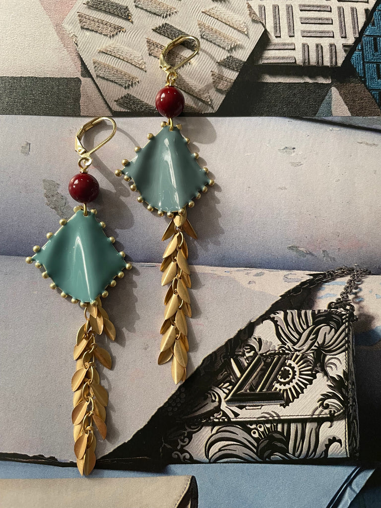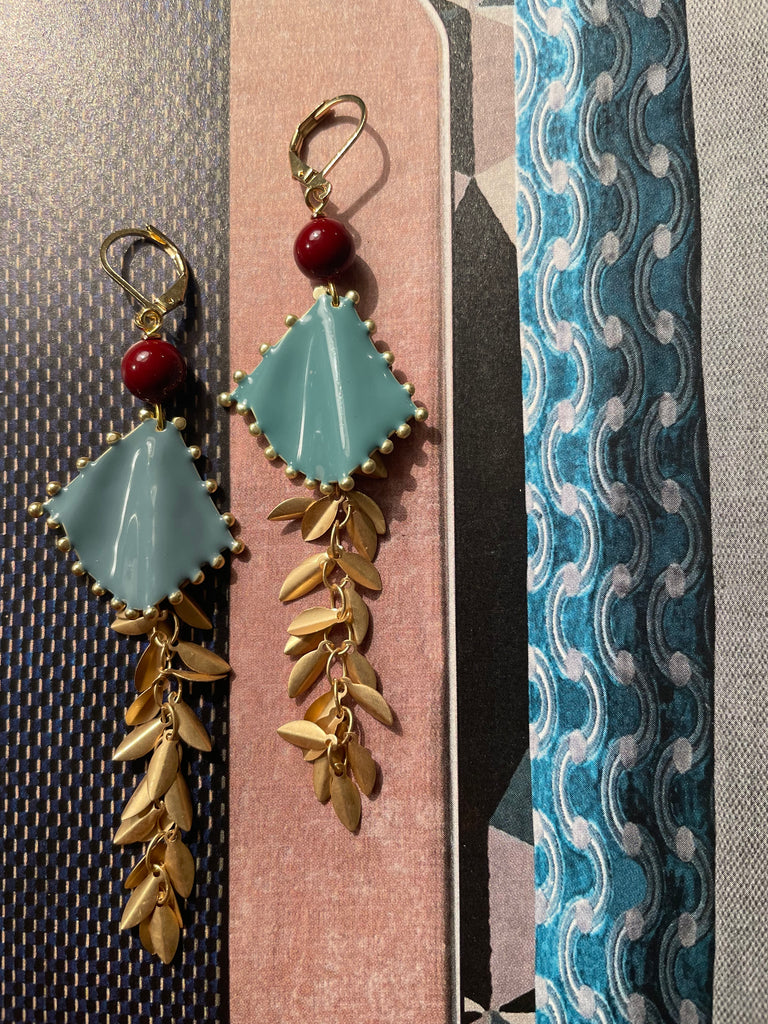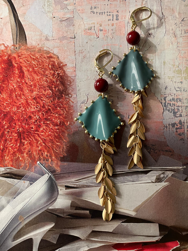 Orecchini pendenti, lunghi e sbarazzini, un po’ giocosi. Nella parte alta una pietra in vetro smaltato bordeaux, dalla quale pende un motivo anch’esso smaltato, in azzurro carta da zucchero, bordato di piccole puntine rotonde d’oro. Fa da sfondo una catenina a mille foglioline satinate. Gli orecchini sono lunghi circa 10 cm e in continuo movimento una volta che sono indossati. Rigorosamente anallergici