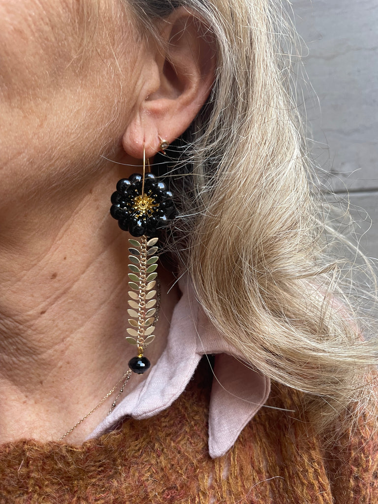 Orecchini con fiore grande nero e catena a foglie