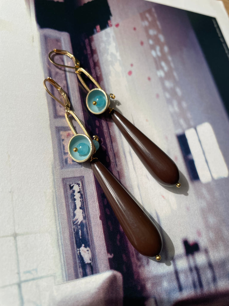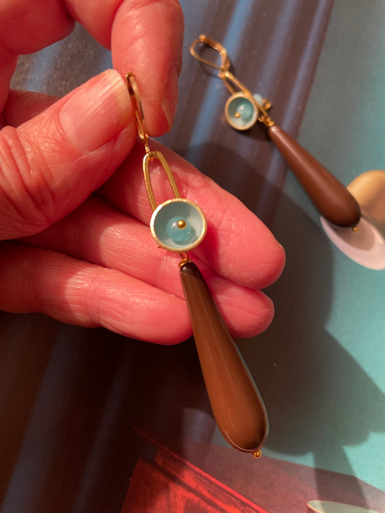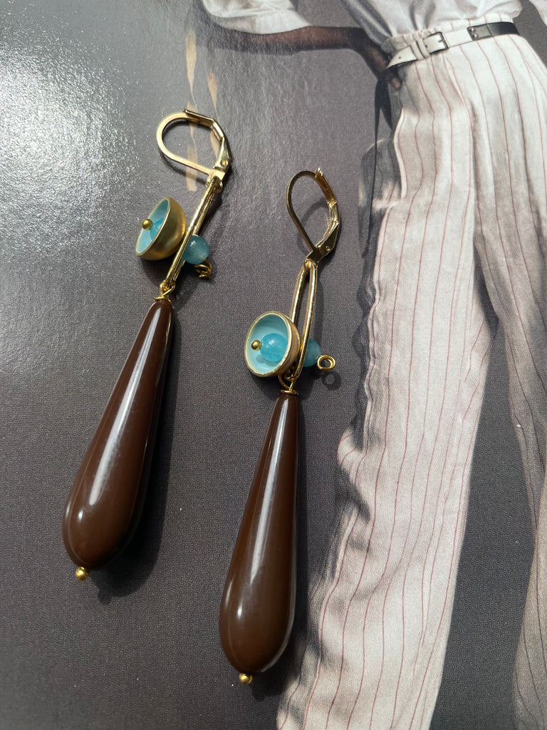 Orecchini lunghi, pendenti, formati da una lunga goccia in resina sovrastata da un anello in metallo piatto dorato. Nell’anello è incastonato un motivo concavo in metallo smaltato, contenente una piccola pietra dura. Misurano circa 7 cm di lunghezza