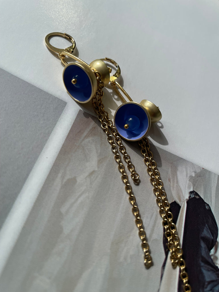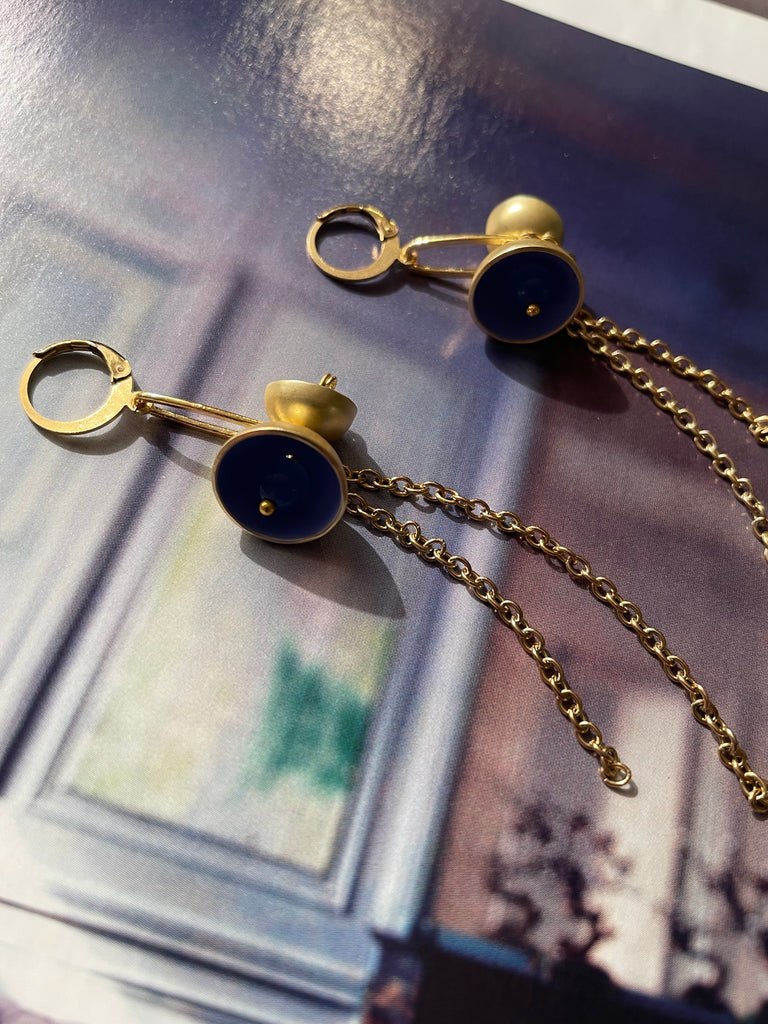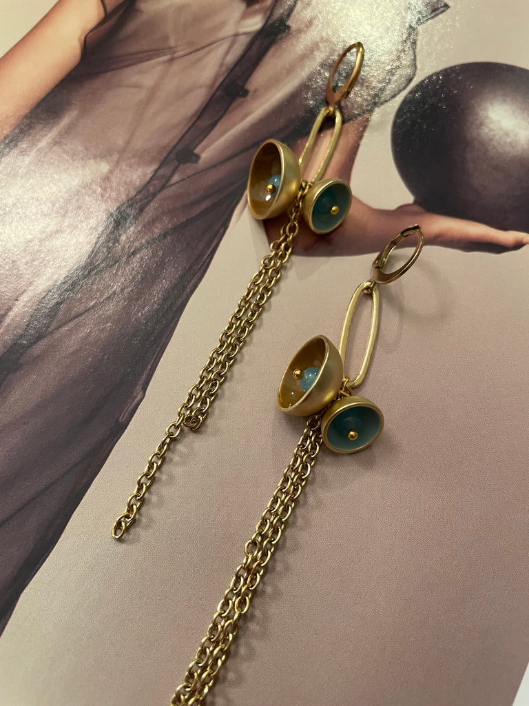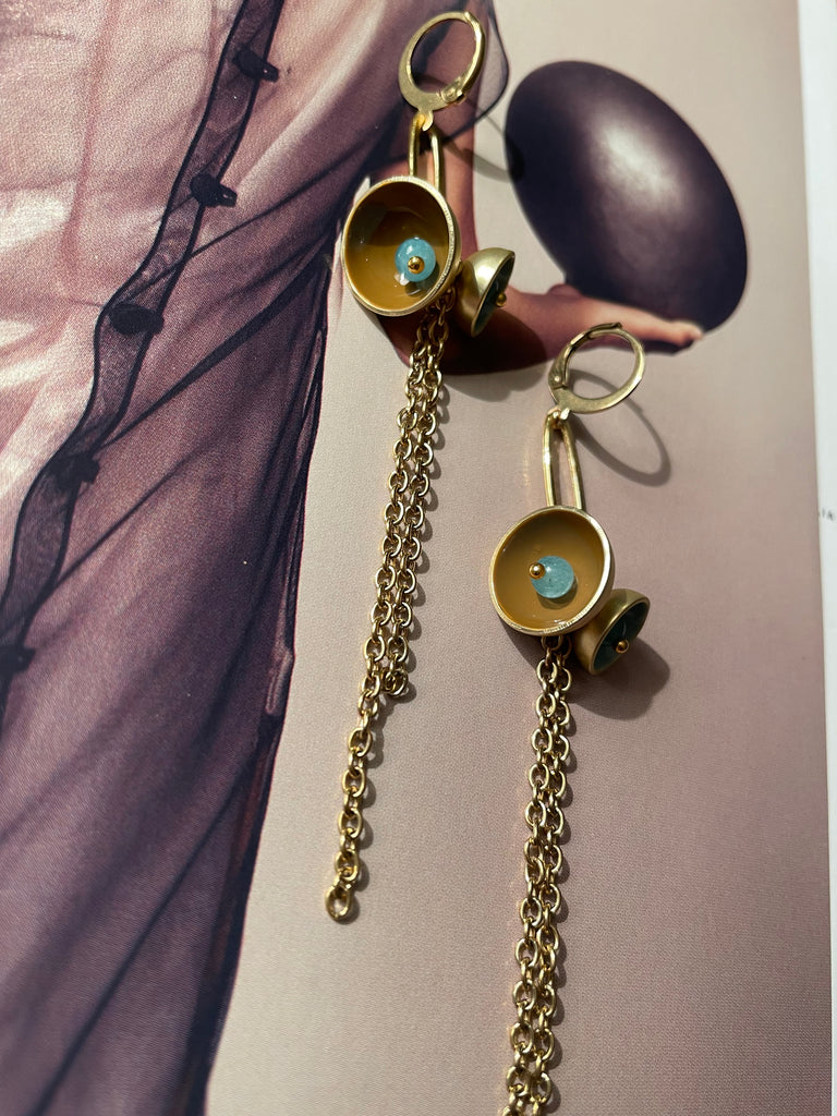 Orecchini lunghi, pendenti, formati da una doppia catenina svolazzante sopra la quale vi sono due motivi concavi in metallo smaltato, entrambi contenenti una piccola pietra dura. Nella parte alta, un anello ovale dorato e piatto. Misurano circa 11 cm di lunghezza
