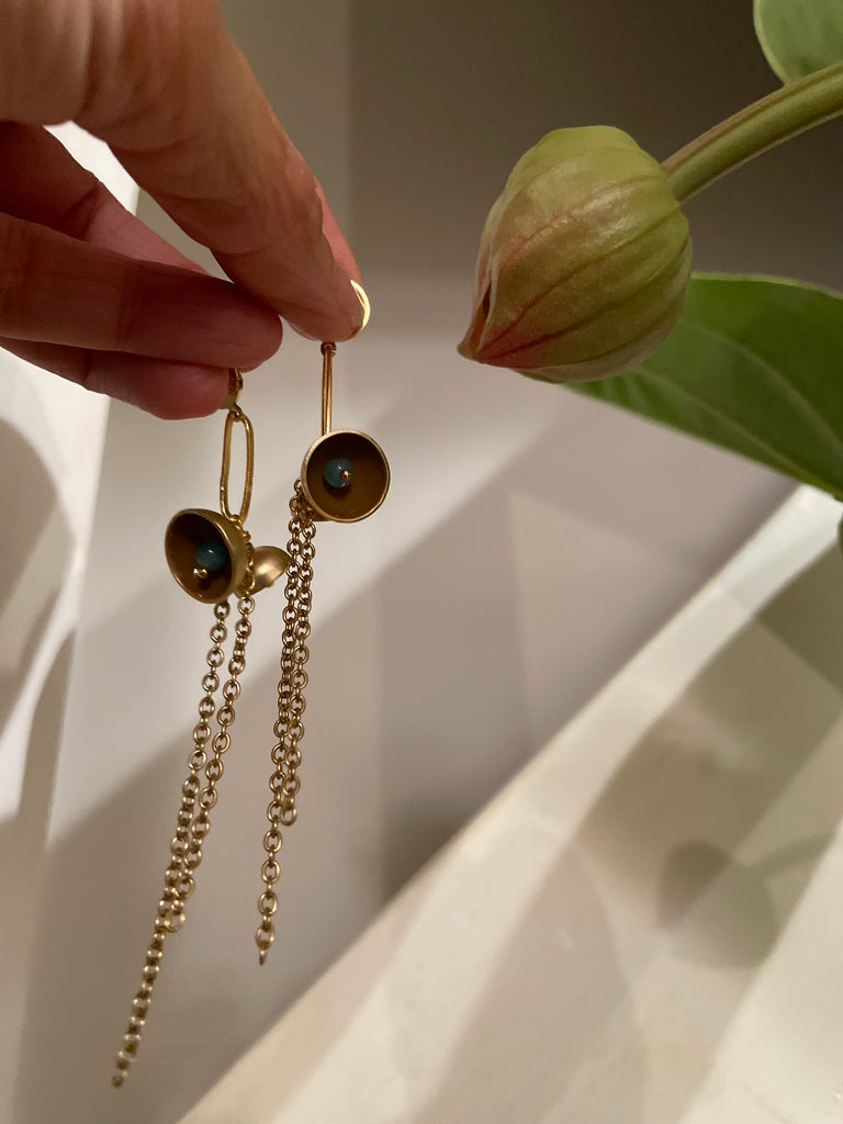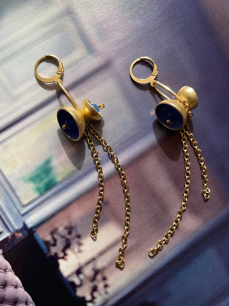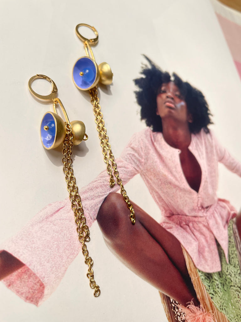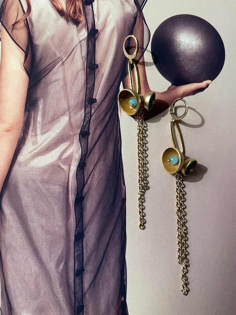 Orecchini lunghi, pendenti, formati da una doppia catenina svolazzante sopra la quale vi sono due motivi concavi in metallo smaltato, entrambi contenenti una piccola pietra dura. Nella parte alta, un anello ovale dorato e piatto. Misurano circa 11 cm di lunghezza