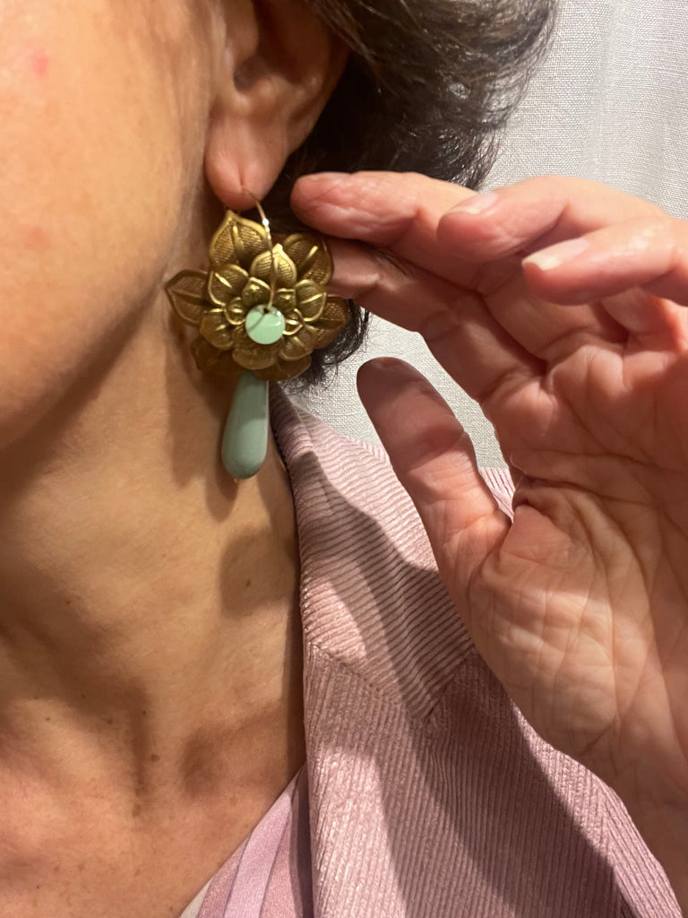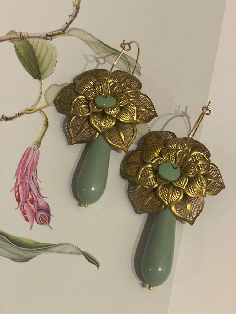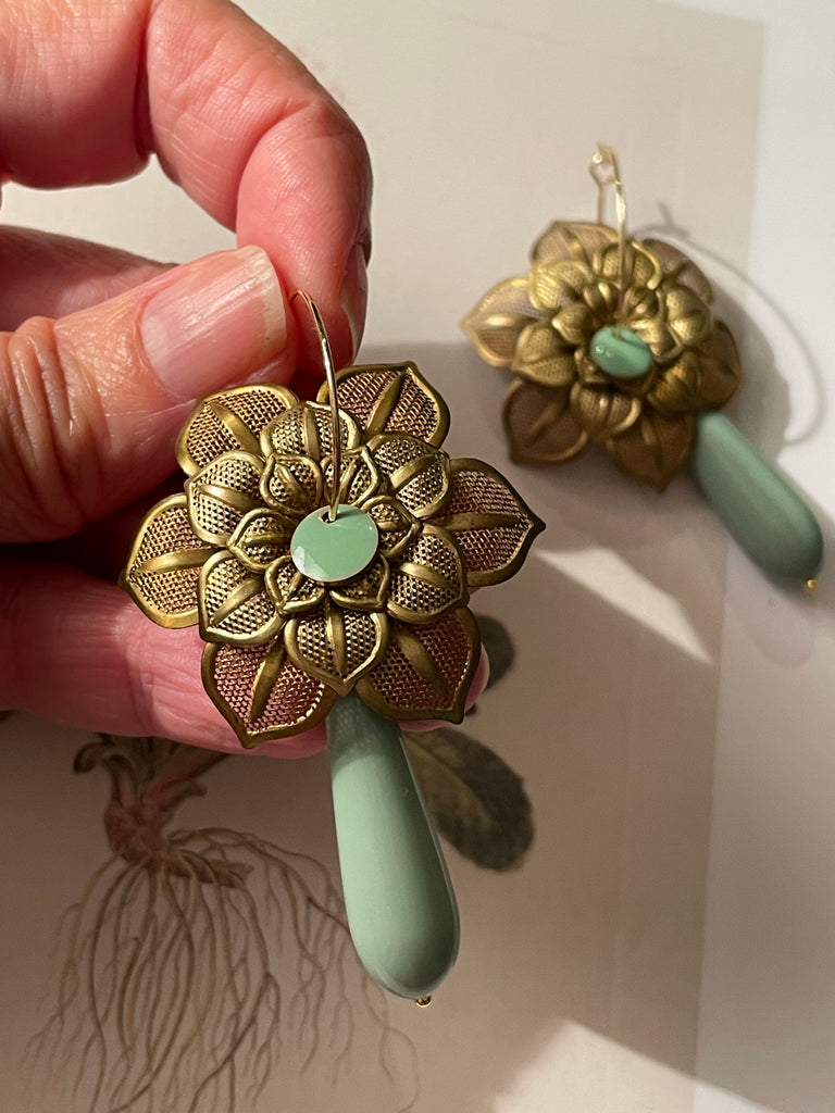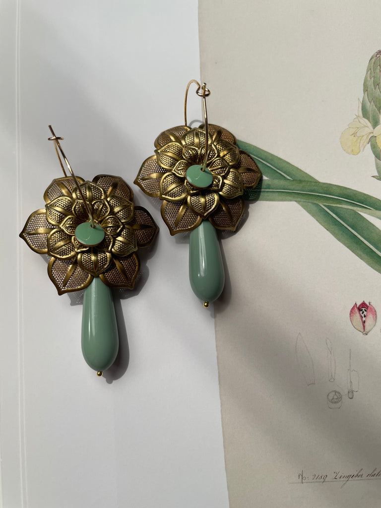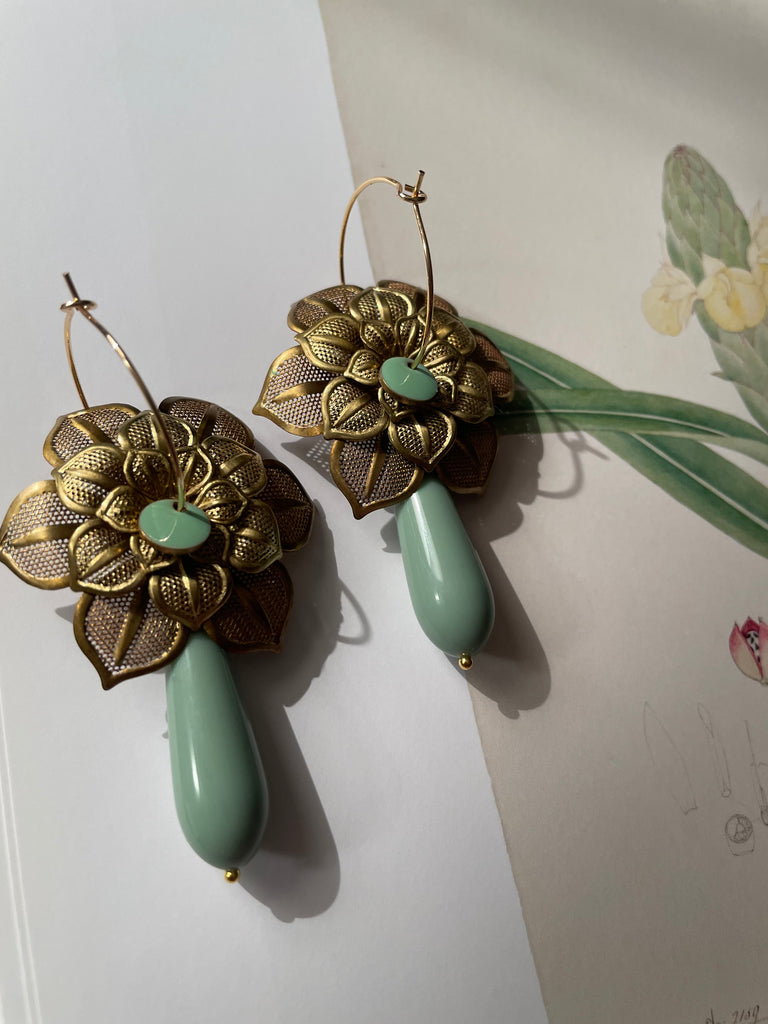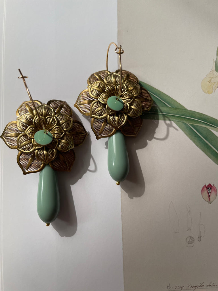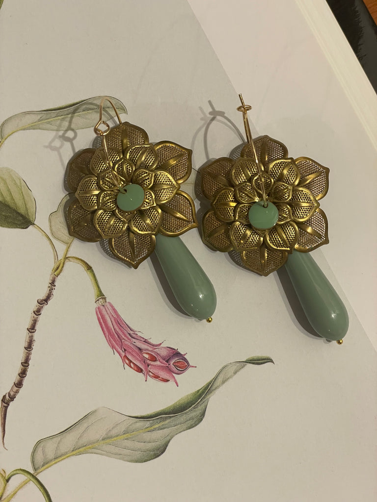 Orecchini piuttosto grandi ma dal design aggraziato. Il motivo principale è dato da un grande fiore in filigrana, a 3 livelli sovrapposti. L’insieme è completato da un tondo smaltato e da una lunga goccia in resina. Misurano circa 7 cm di lunghezza e sono rigorosamente anallergici.