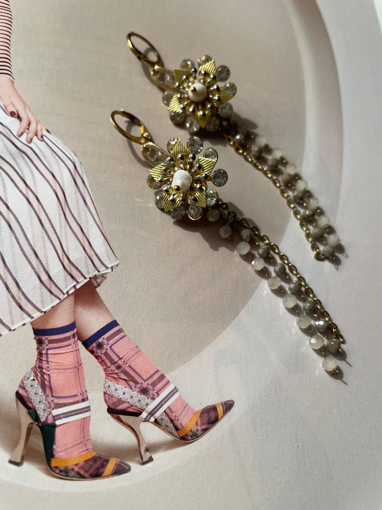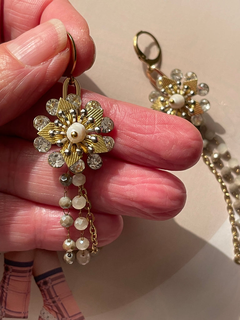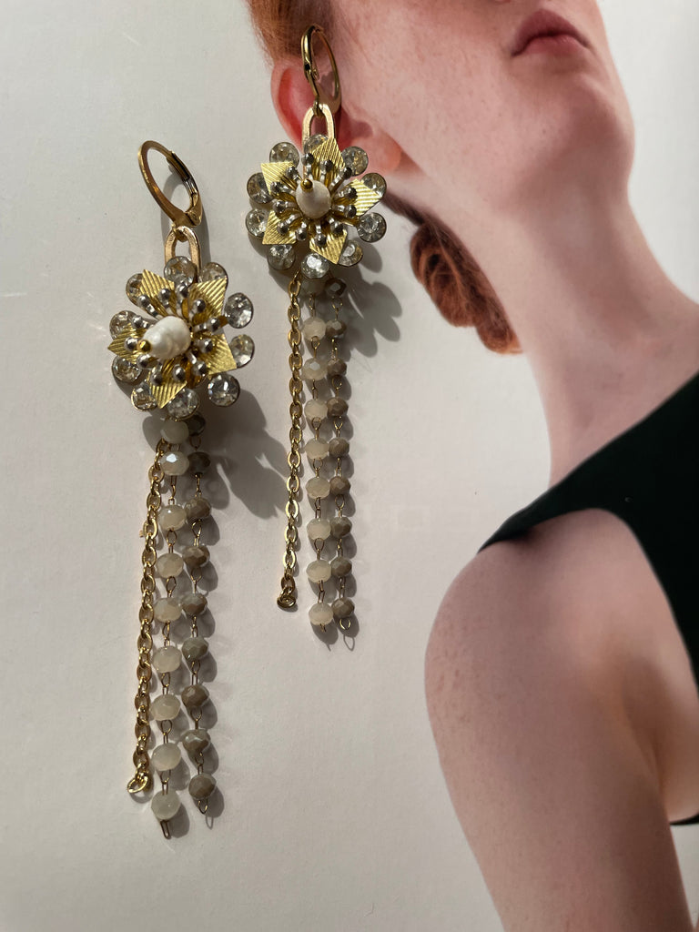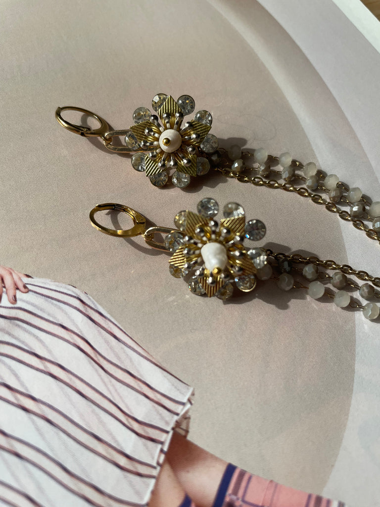 Orecchini pendenti con tripla catenella in cristallini e fiore in metallo argentato con strass. Nella parte centrale del fiore, una piccola perla di fiume. Misurano circa 8 cm di lunghezza e sono rigorosamente anallergici.