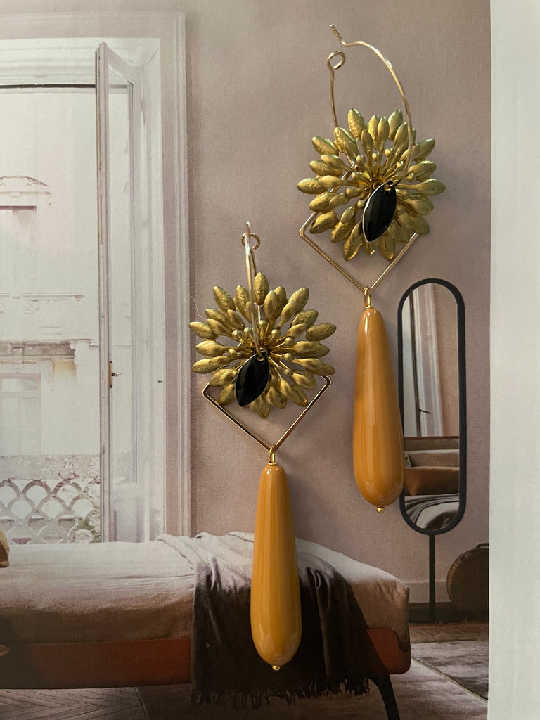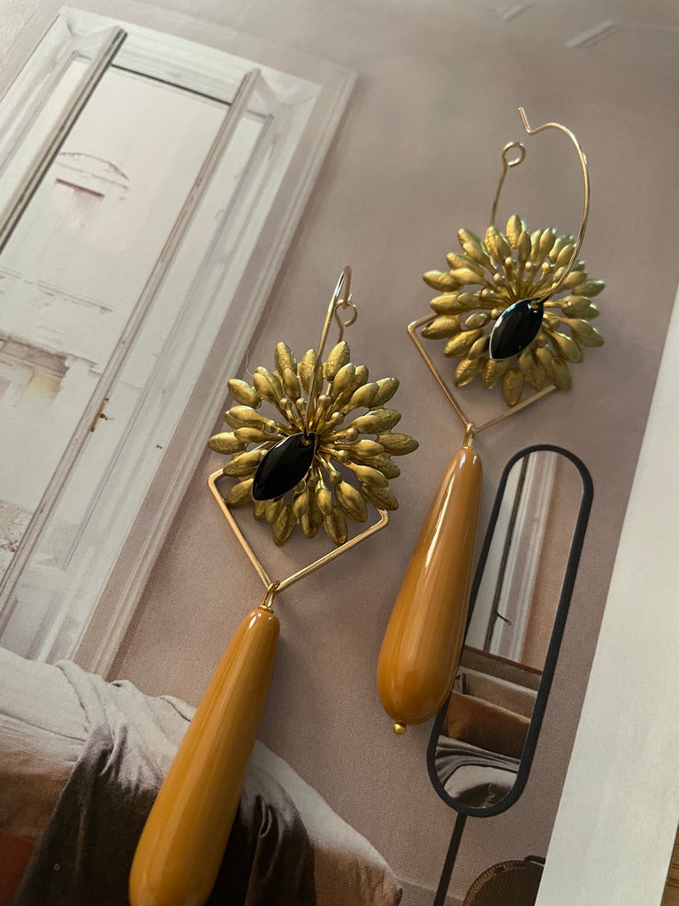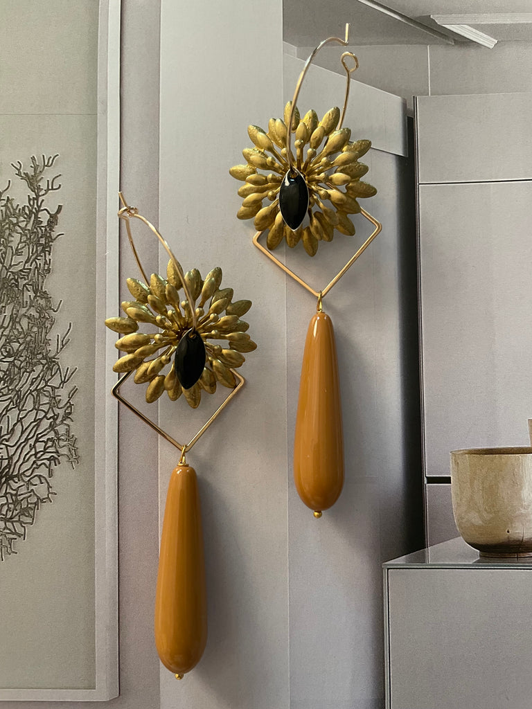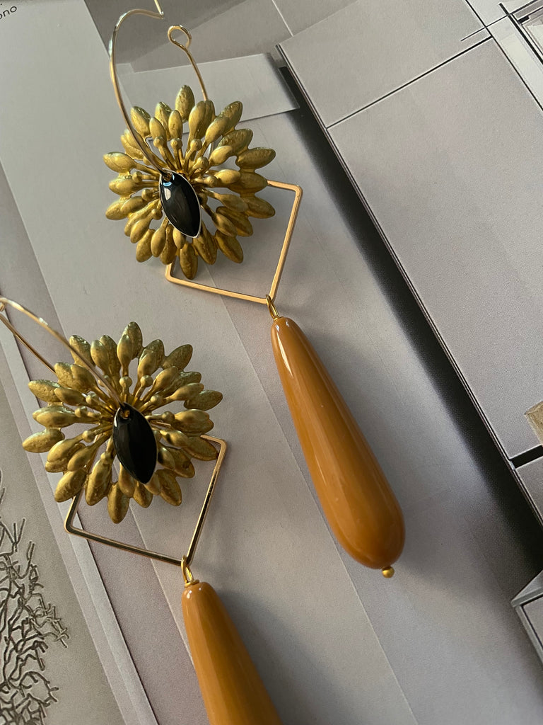 Coppia di orecchini con grande fiore dai petali appuntiti, in ottone, lavorato su tre livelli, dal quale pende una lunga ma leggera goccia in resina. Nella parte centrale del fiore emerge uno smalto nero a due punte. Gli orecchini sono lunghi circa 6 cm e sono rigorosamente anallergici.