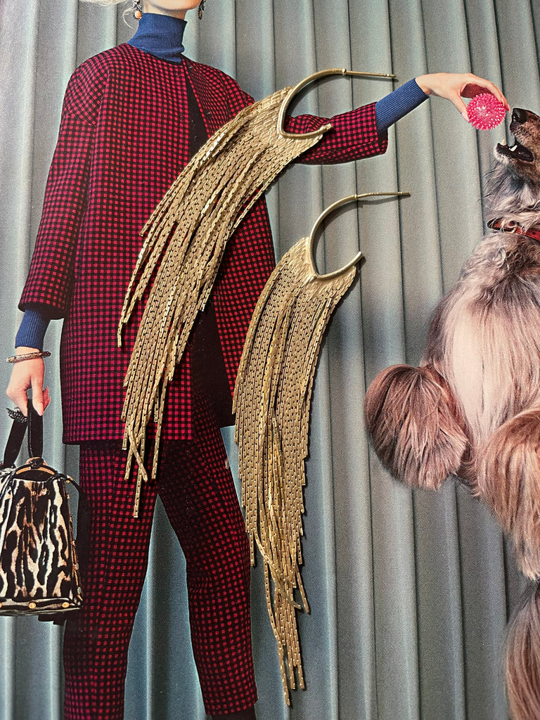 Coppia di orecchini dorati con frange pendenti. Lunghezza di 11 cm.