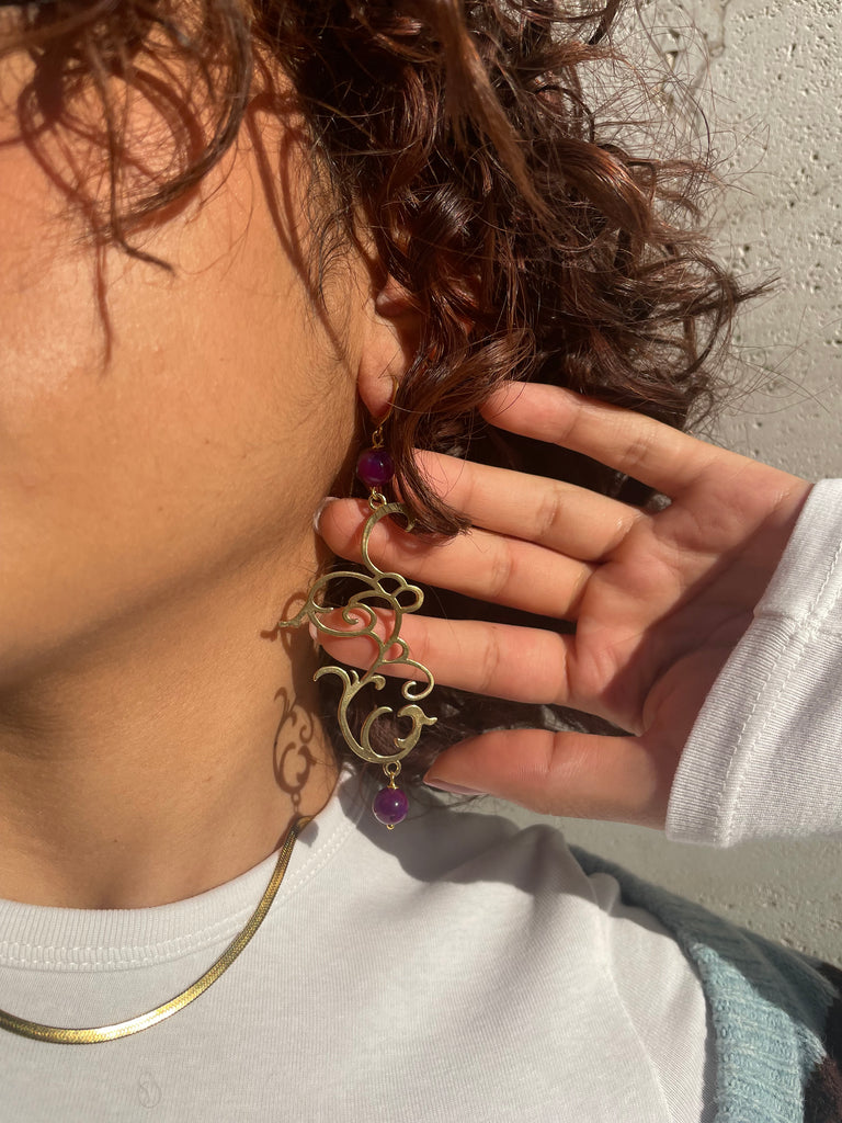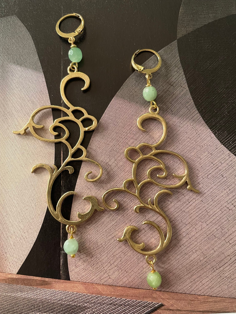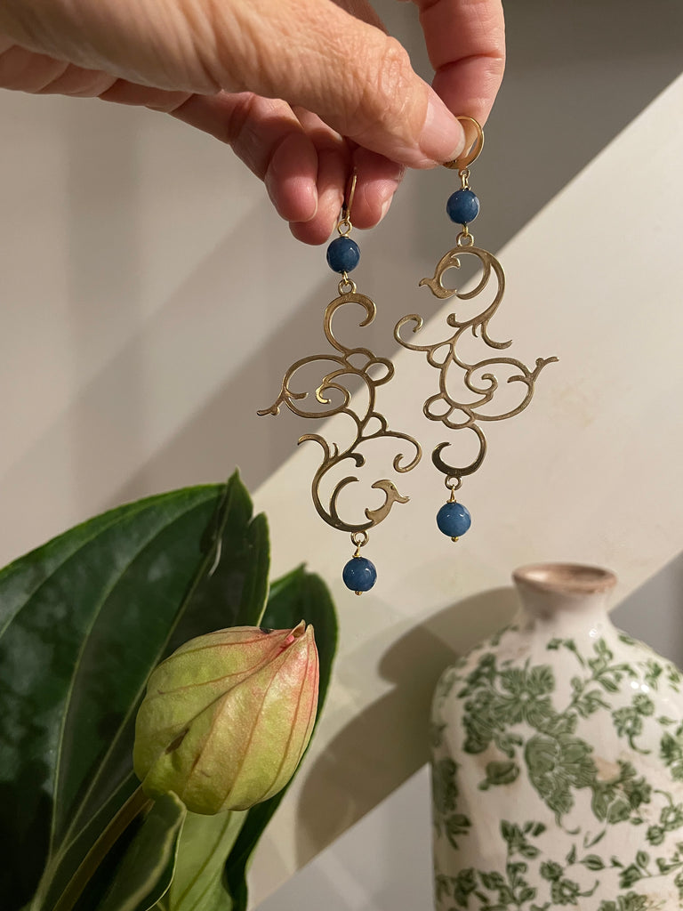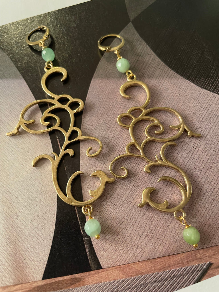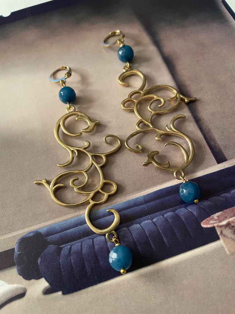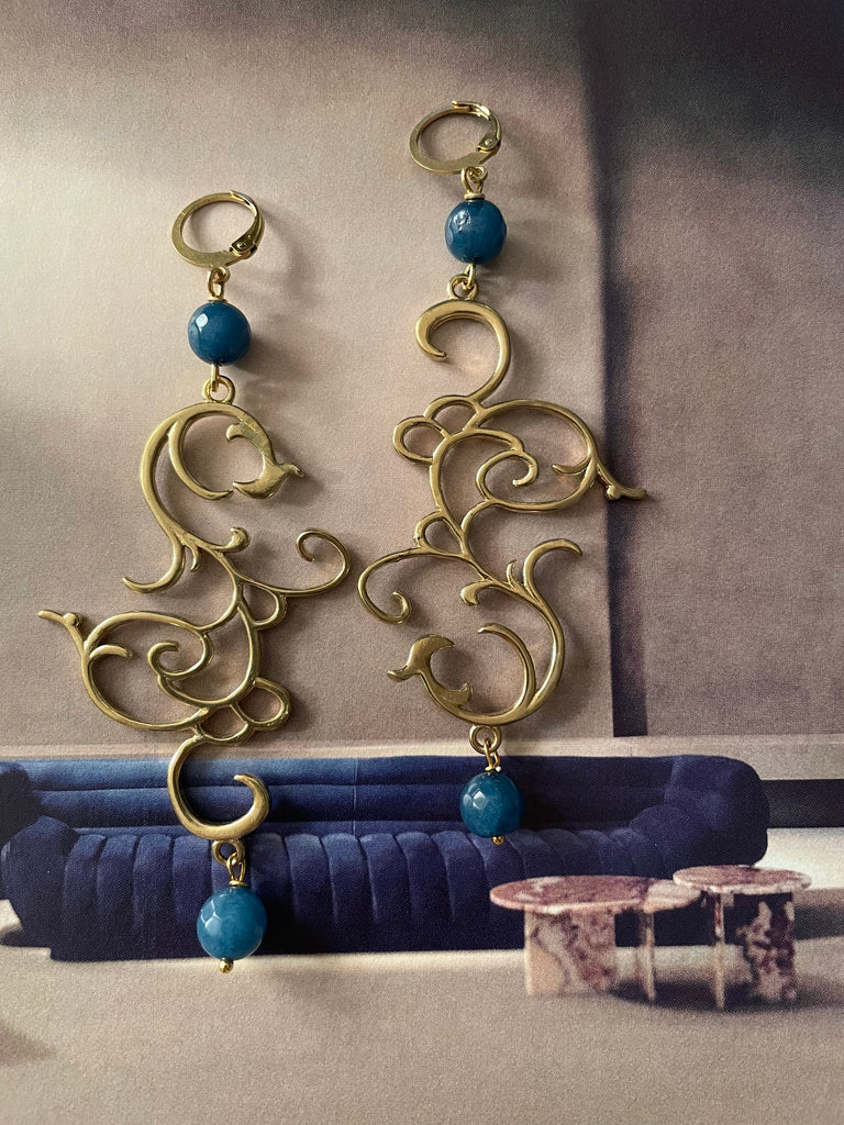 Orecchini estremamente particolari, leggeri ma un po’ barocchi nel loro disegno…. arzigogolato. I motivi a fregio sono coronati da due pietre dure. Misurano circa 8 cm di lunghezza e sono rigorosamente anallergici.