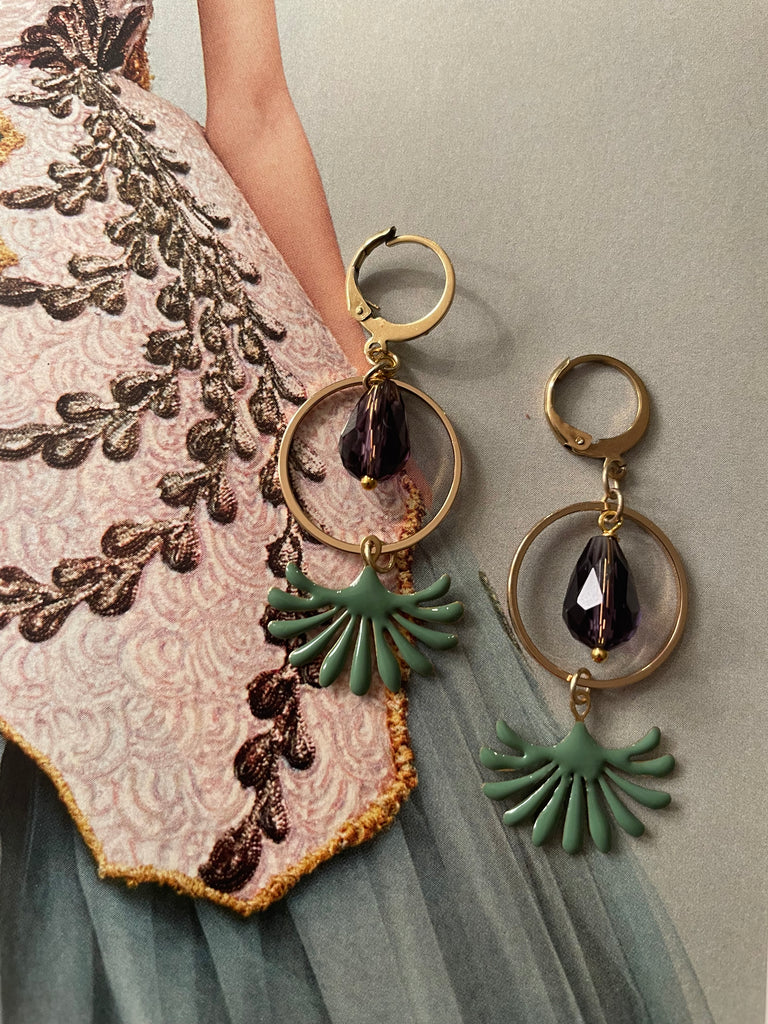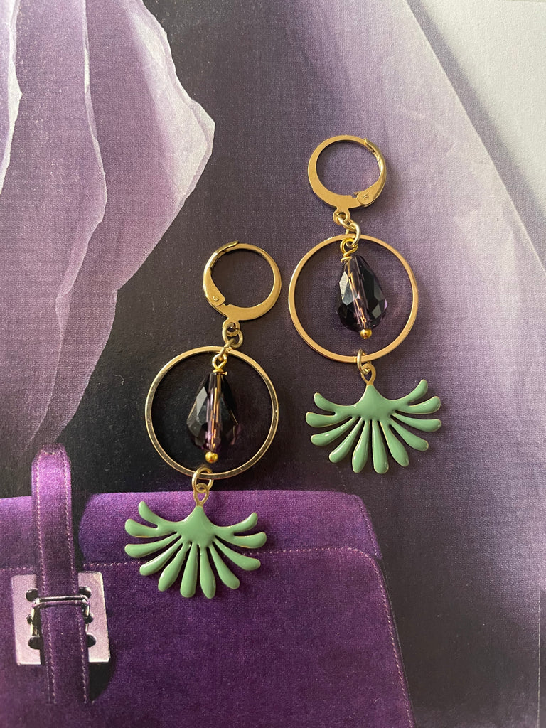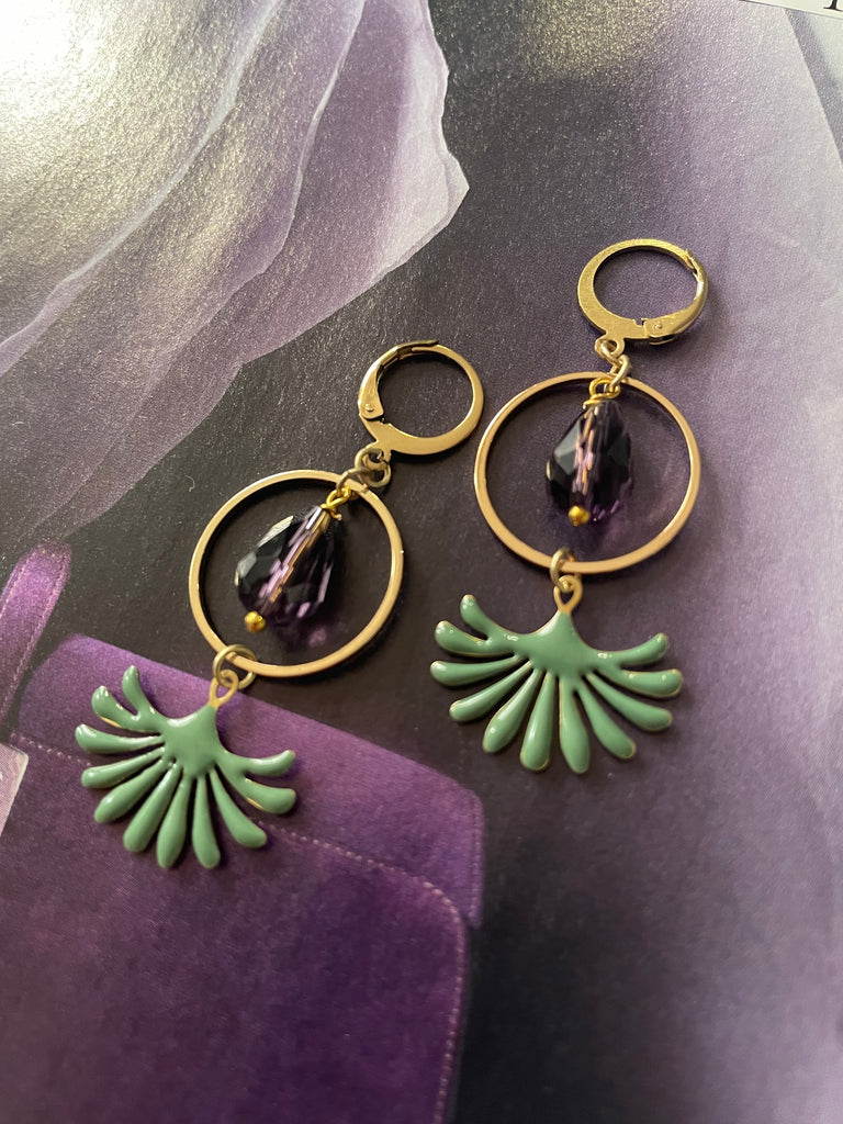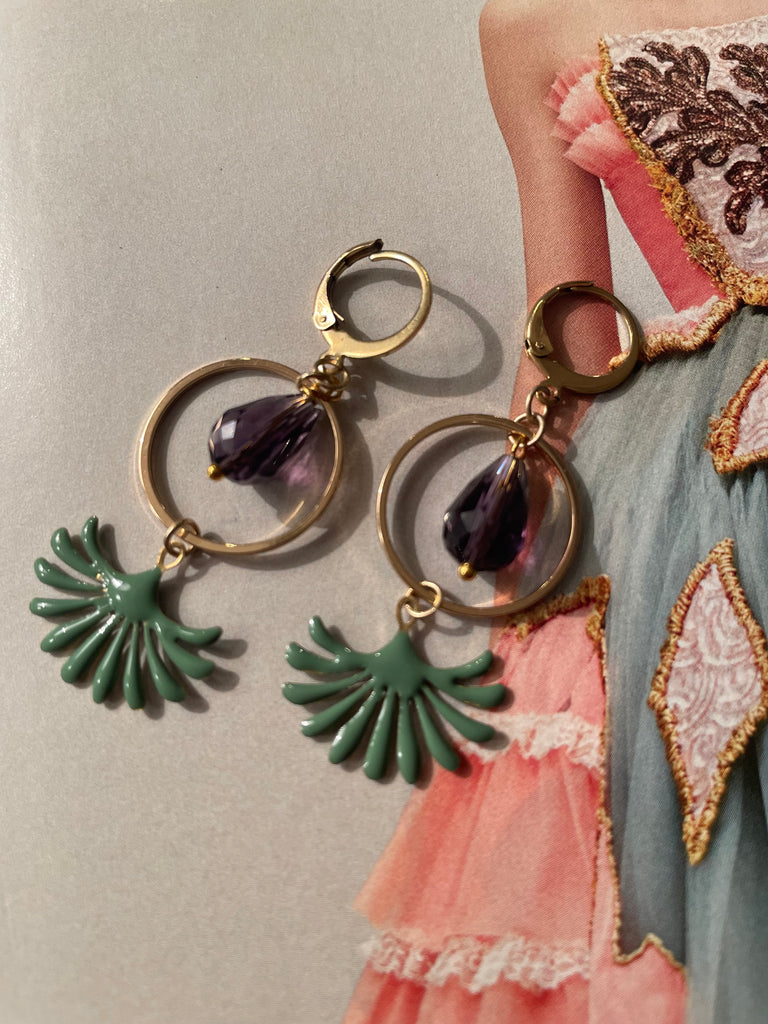 Orecchini con cerchio in metallo dorato, goccia in vetro sfaccettato viola e motivo smaltato a fontanella. Misurano circa 4 cm di lunghezza e sono rigorosamente anallergici.