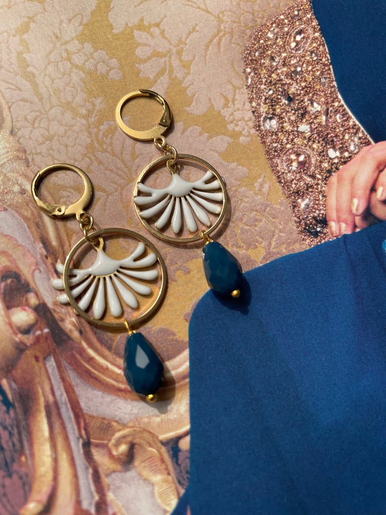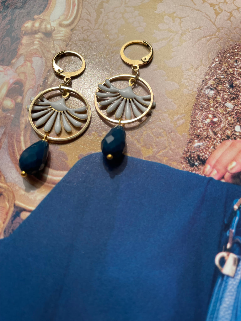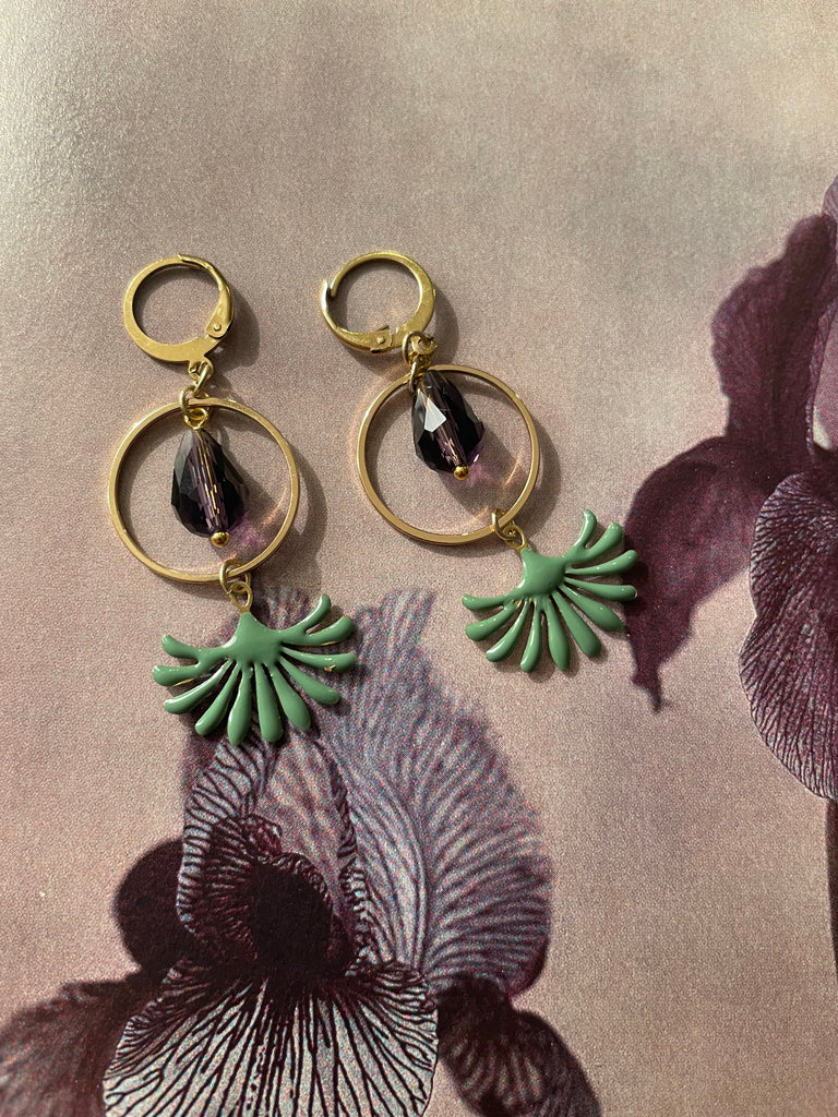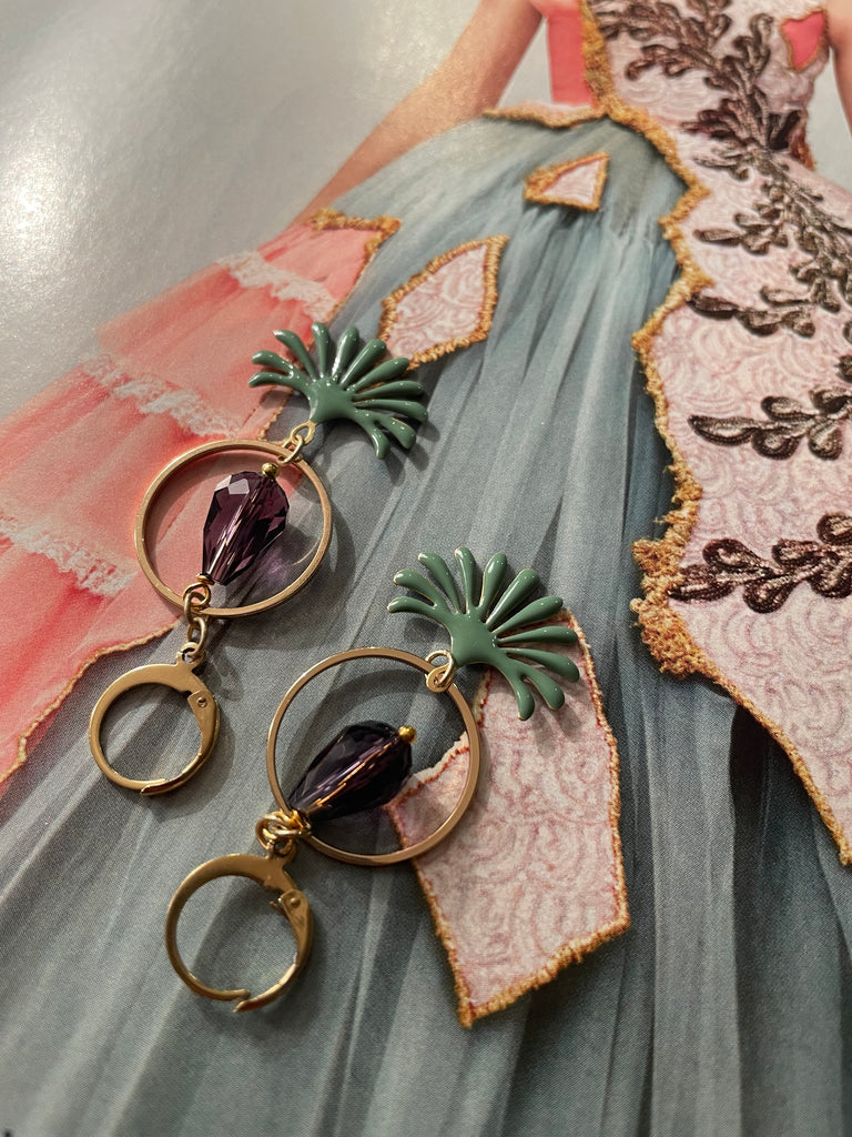 Orecchini con cerchio in metallo dorato, goccia in vetro sfaccettato viola e motivo smaltato a fontanella. Misurano circa 4 cm di lunghezza e sono rigorosamente anallergici.