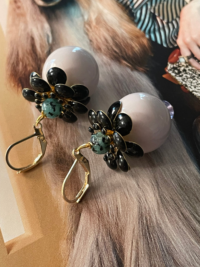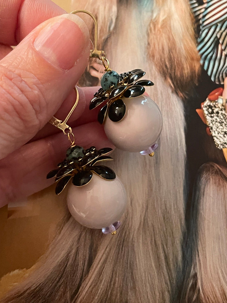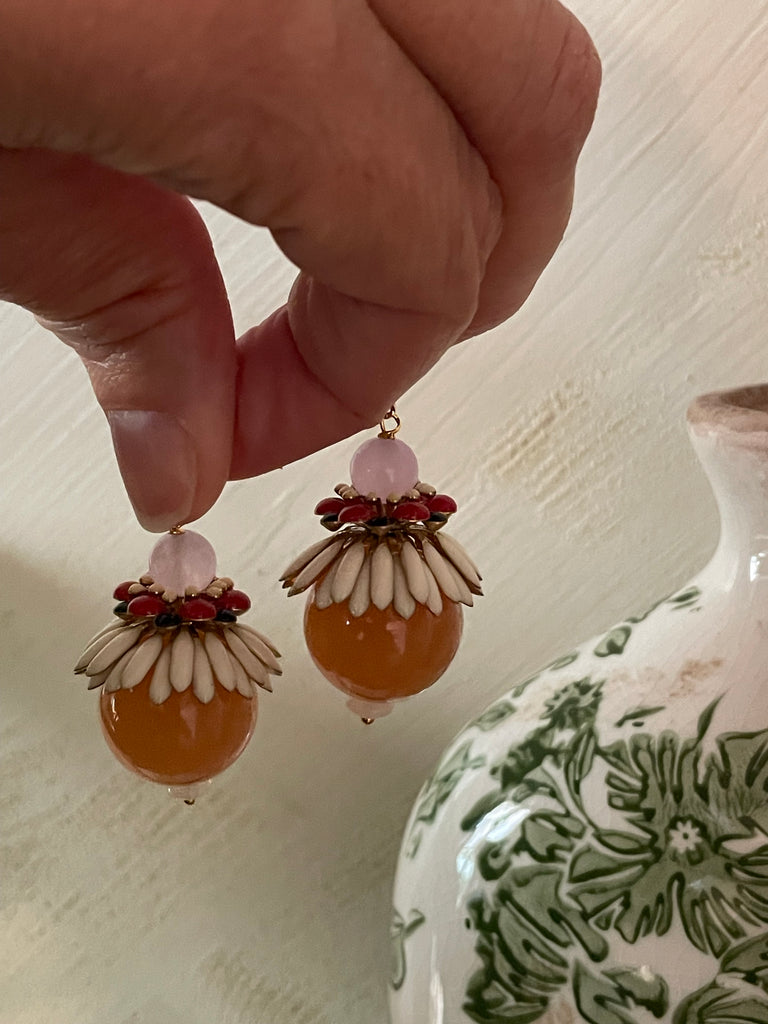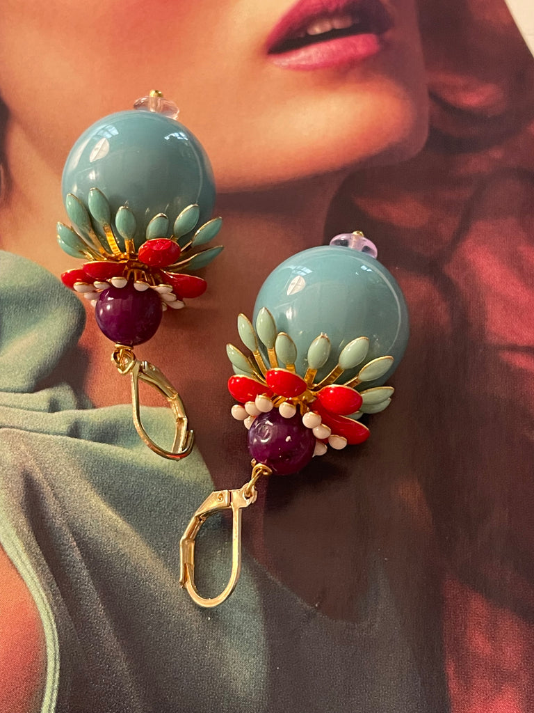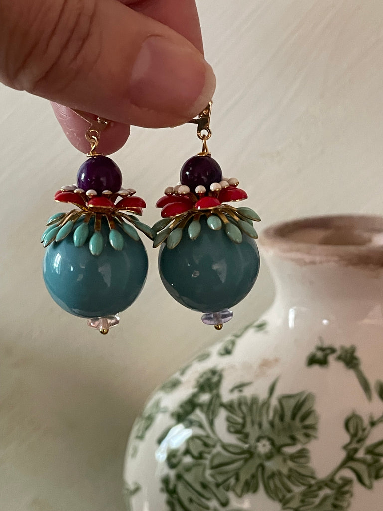 Orecchini corti e leggeri, seppur leggermente pendenti. Sono composti da una pallina in resina colorata del diametro di circa 2 cm nella parte sotto, a cui si aggiunge un fiore grande in metallo smaltato, tridimensionale e lavorato a mano e una seconda pallina in pietra dura, più piccola, nella parte alta. Il fiore smaltato viene lavorato e modellato con le mani in modo da risultare aperto e ampio. Gli orecchini misurano circa 4 cm e sono rigorosamente anallergici e, naturalmente, leggerissimi.