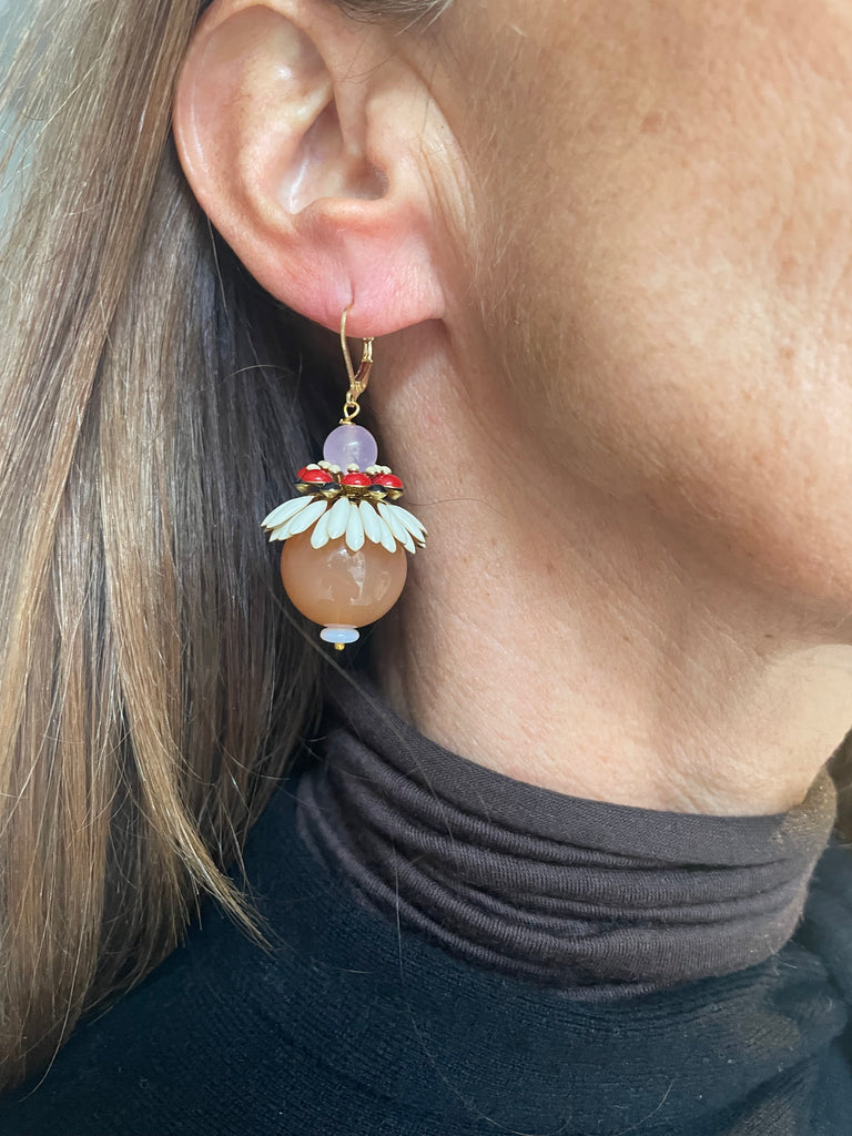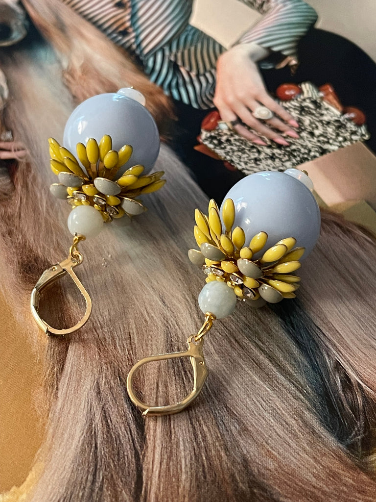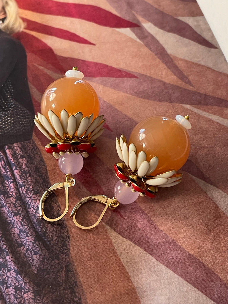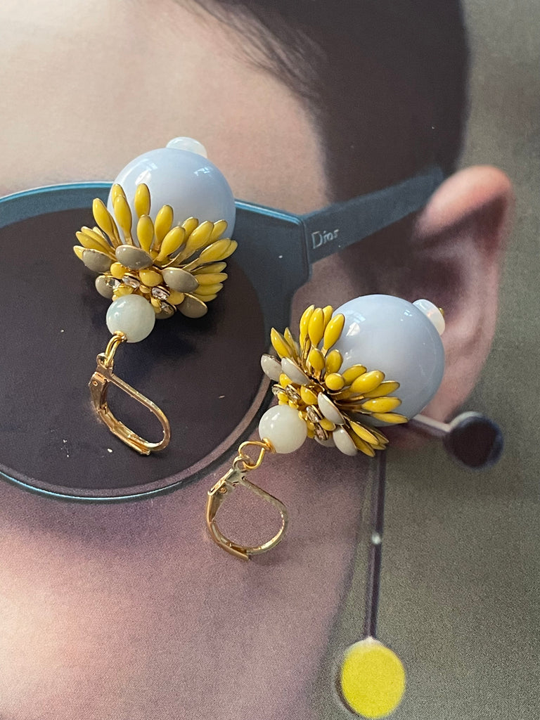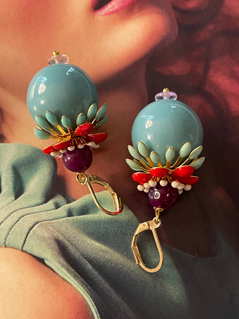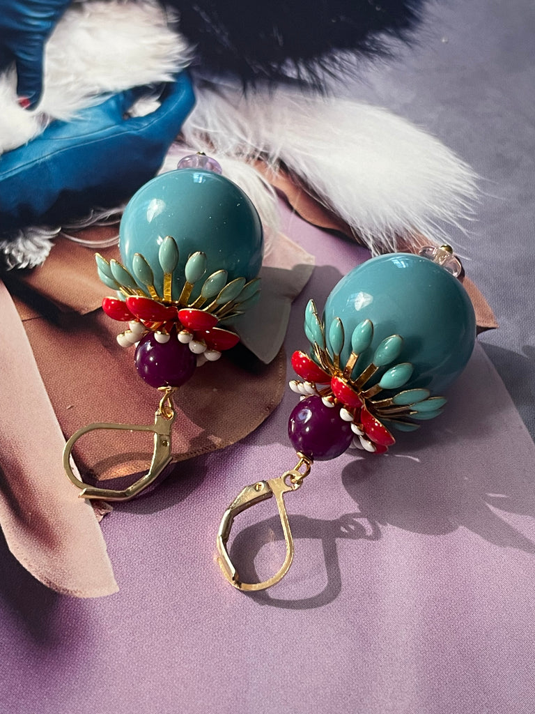 Orecchini corti e leggeri, seppur leggermente pendenti. Sono composti da una pallina in resina colorata del diametro di circa 2 cm nella parte sotto, a cui si aggiunge un fiore grande in metallo smaltato, tridimensionale e lavorato a mano e una seconda pallina in pietra dura, più piccola, nella parte alta. Il fiore smaltato viene lavorato e modellato con le mani in modo da risultare aperto e ampio. Gli orecchini misurano circa 4 cm e sono rigorosamente anallergici e, naturalmente, leggerissimi.