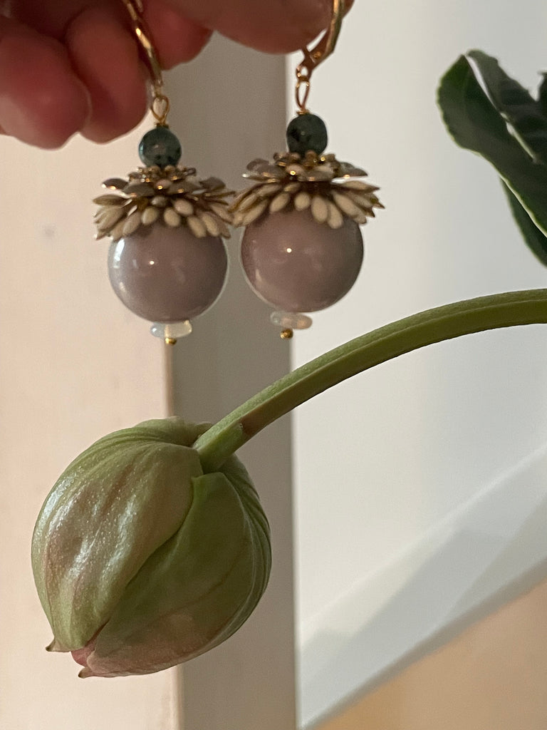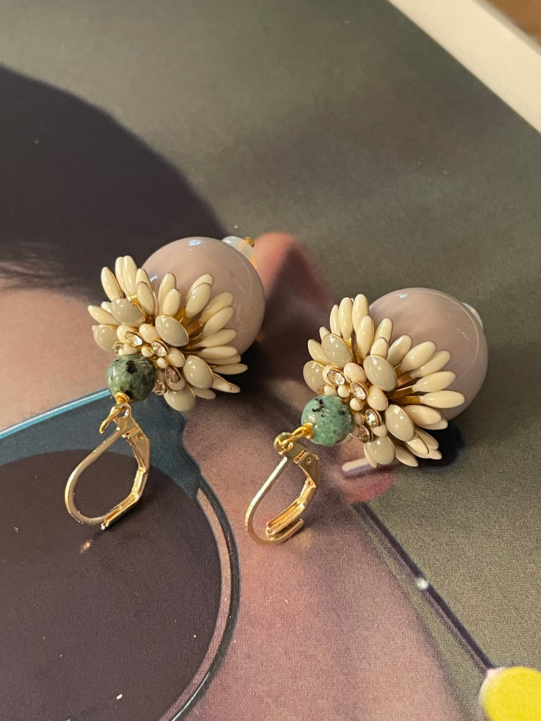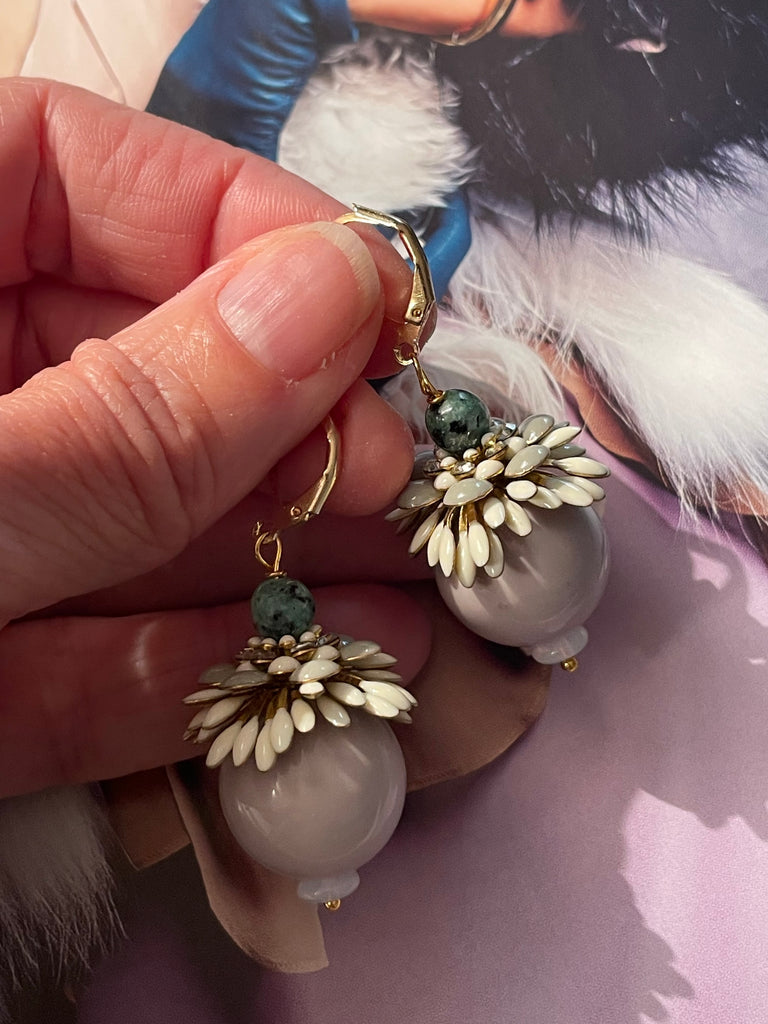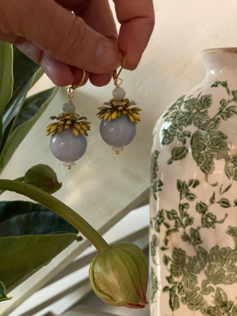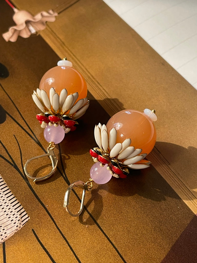 Orecchini corti e leggeri, seppur leggermente pendenti. Sono composti da una pallina in resina colorata del diametro di circa 2 cm nella parte sotto, a cui si aggiunge un fiore grande in metallo smaltato, tridimensionale e lavorato a mano e una seconda pallina in pietra dura, più piccola, nella parte alta. Il fiore smaltato viene lavorato e modellato con le mani in modo da risultare aperto e ampio. Gli orecchini misurano circa 4 cm e sono rigorosamente anallergici e, naturalmente, leggerissimi.