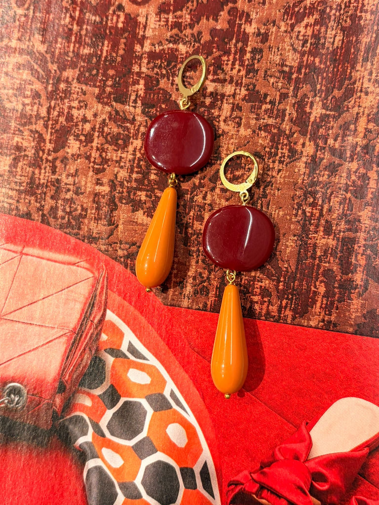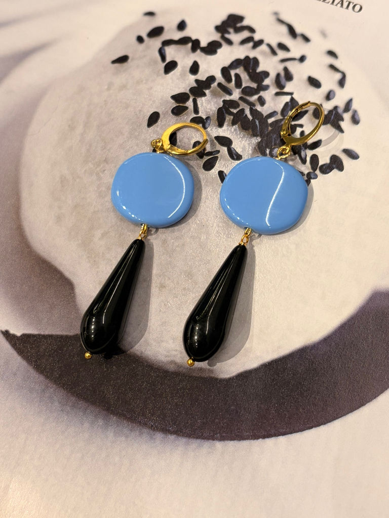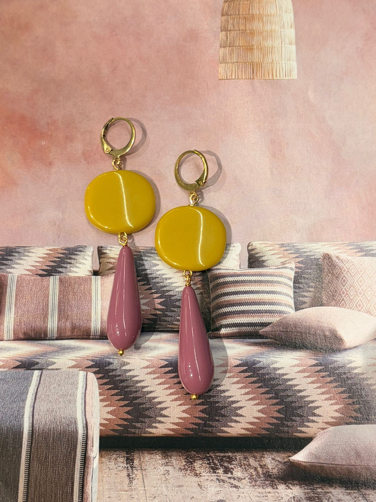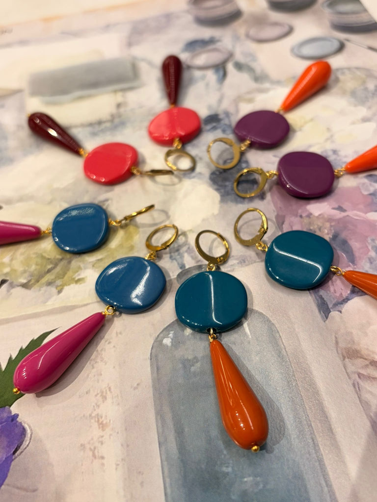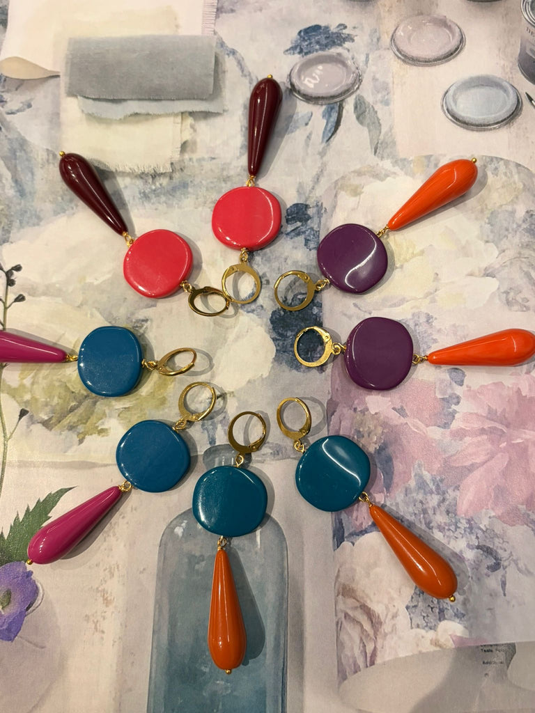 Fratelli minori degli orecchini Penelope, sono totalmente in resina, leggerissimi, ma molto colorati. Uniscono la forma classica della goccia a una forma più moderna di piastra piatta, creando dei bellissimi accostamenti cromatici. Misurano circa 7 cm e sono rigorosamente anallergici. Sbizzarritevi con i colori!