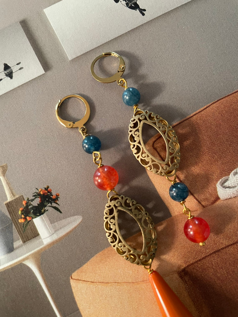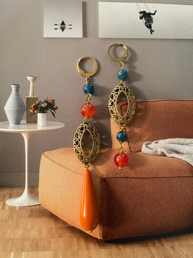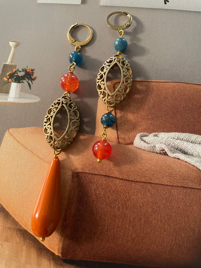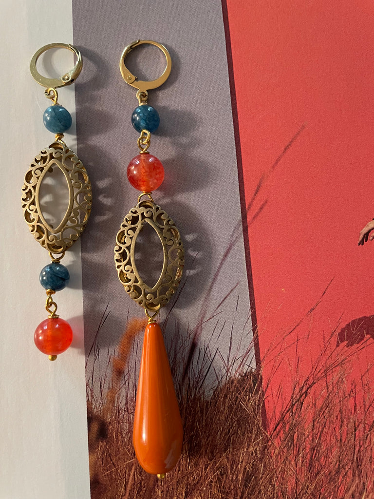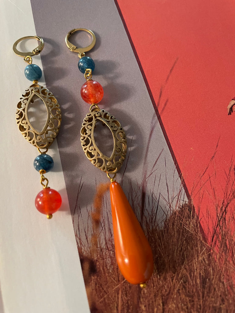 Coppia di orecchini della collezione gemelli diversi, caratterizzati da un motivo dal sapore antico. Attorno al motivo in ottone vi sono delle pietre in agata arancio e avio, nonché una goccia in resina arancione. Gli orecchini misurano rispettivamente 9 e 7 centimetri di lunghezza e sono rigorosamente anallergici.