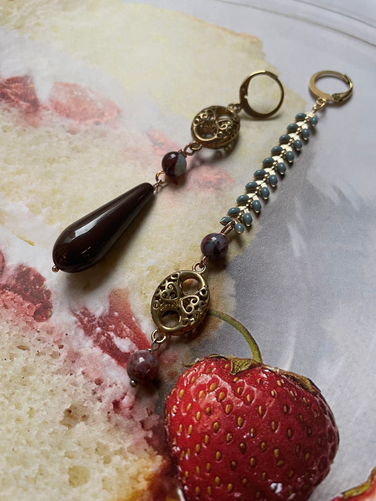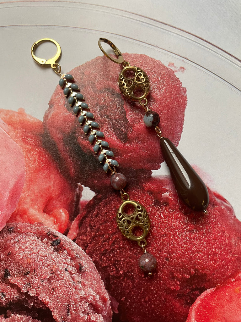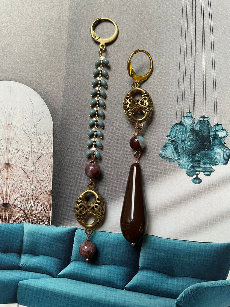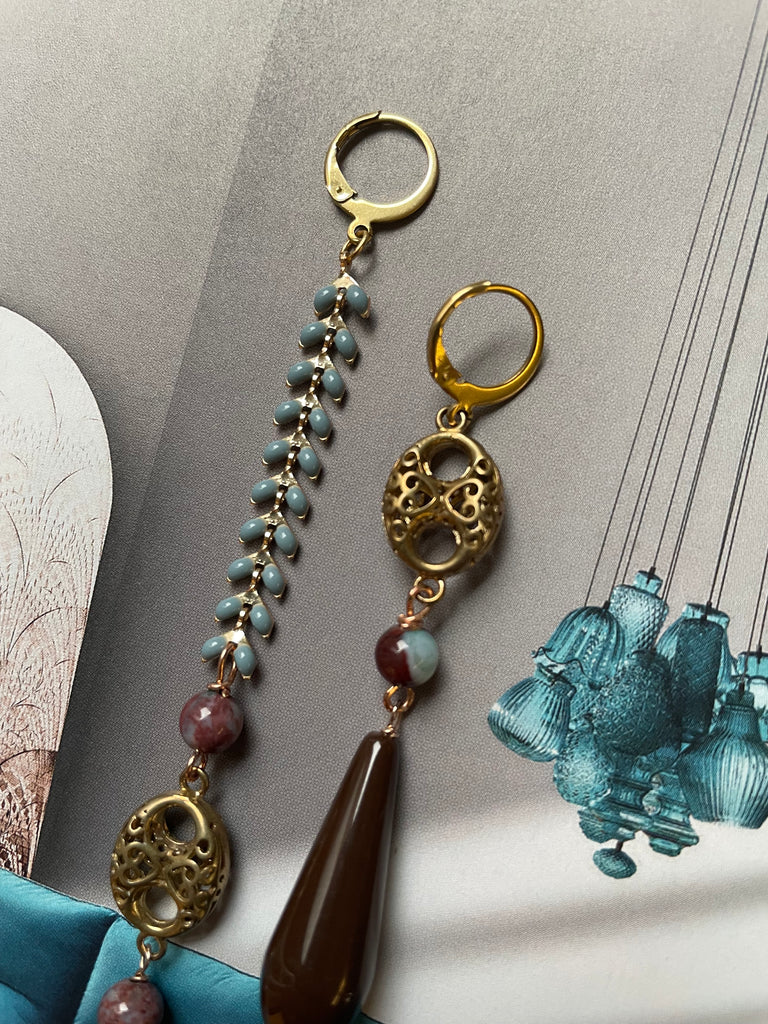 Coppia di orecchini della collezione gemelli diversi, sui toni del grigio azzurro e del marrone. L’orecchino più corto ha un motivo a 8, in metallo anticato, da cui pende una pietra azzurra e marrone e una goccia in resina marrone. L’altro orecchino, quello più lungo, ha lo stesso motivo anticato ma preceduto da una catena a spina di pesce smaltata in grigio azzurro. Gli orecchini misurano rispettivamente 10 e 8 centimetri e sono rigorosamente anallergici.