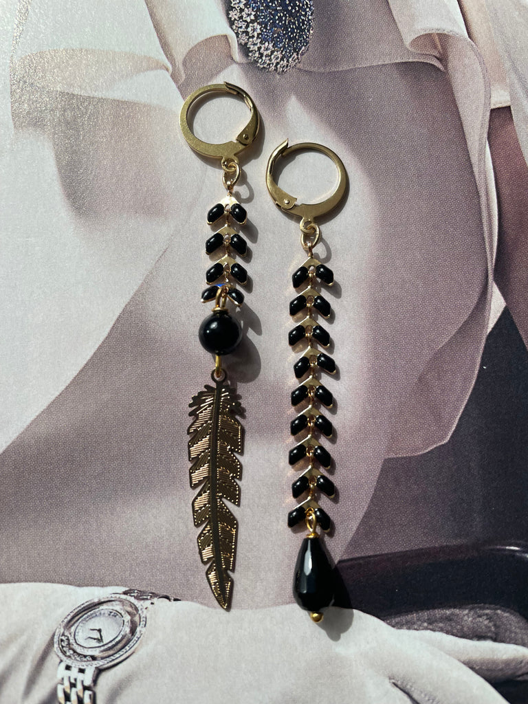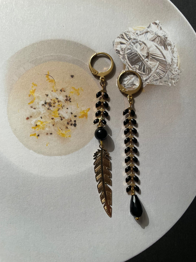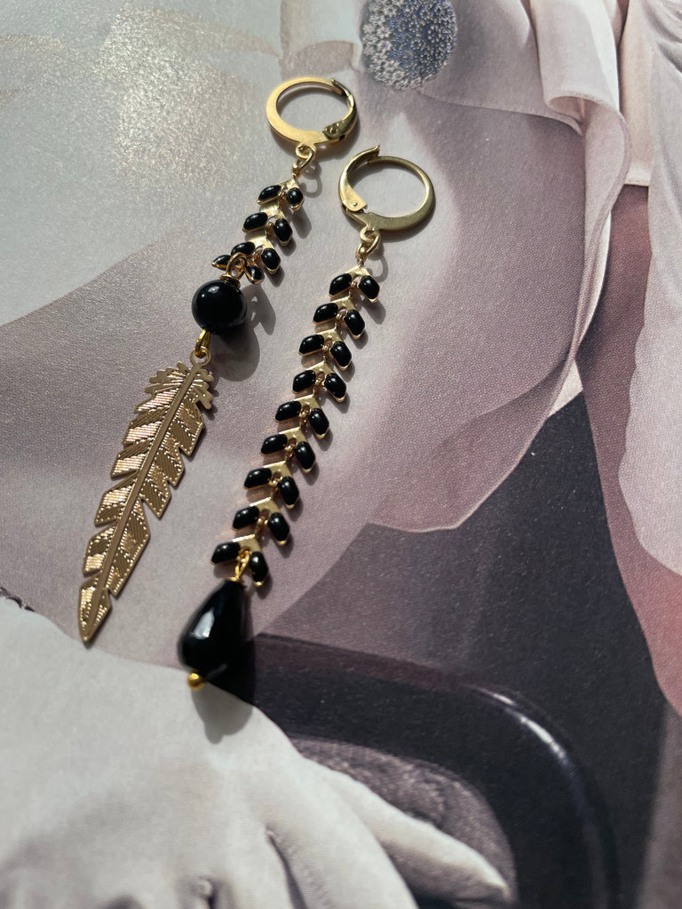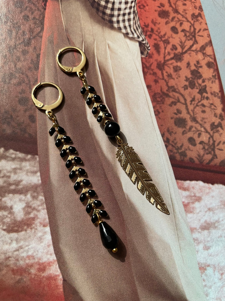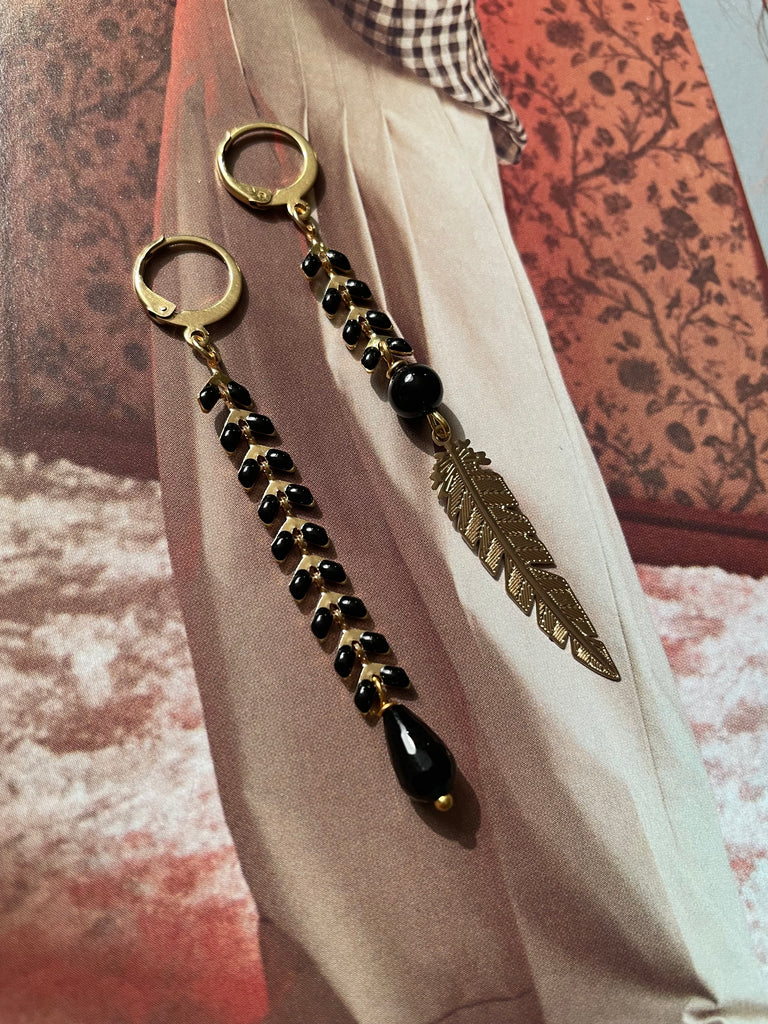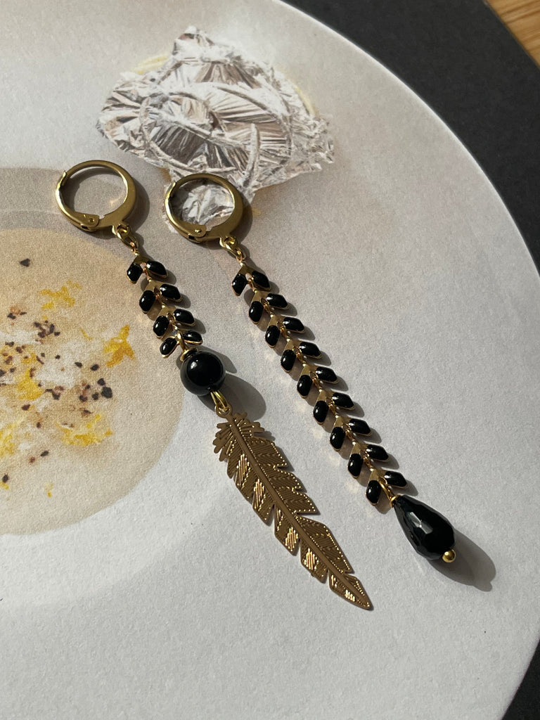 Coppia di orecchini della serie “gemelli diversi” con pietre in onice nera, catenina a spina di pesce smaltata e piumetta lavorata in metallo dorato. Sono lunghi circa 7 cm e rigorosamente anallergici.