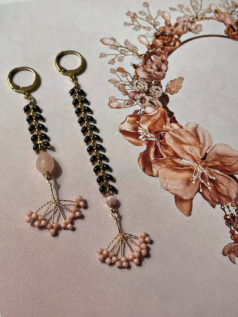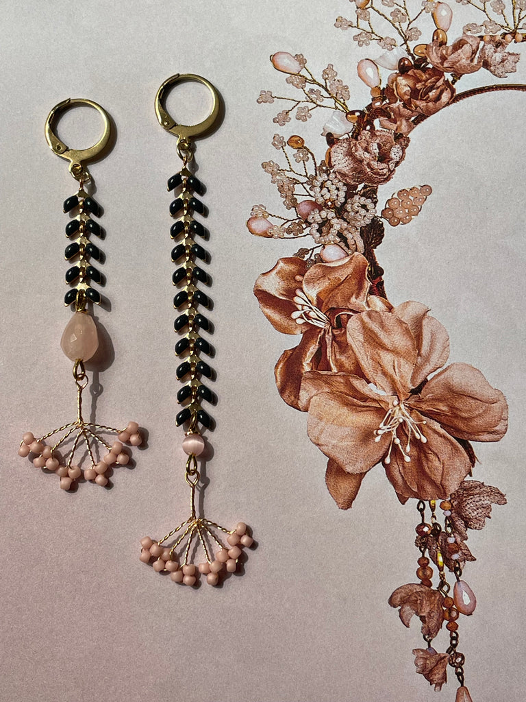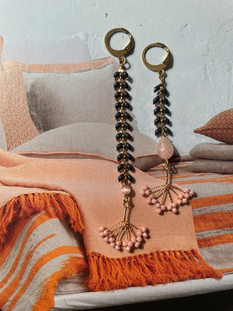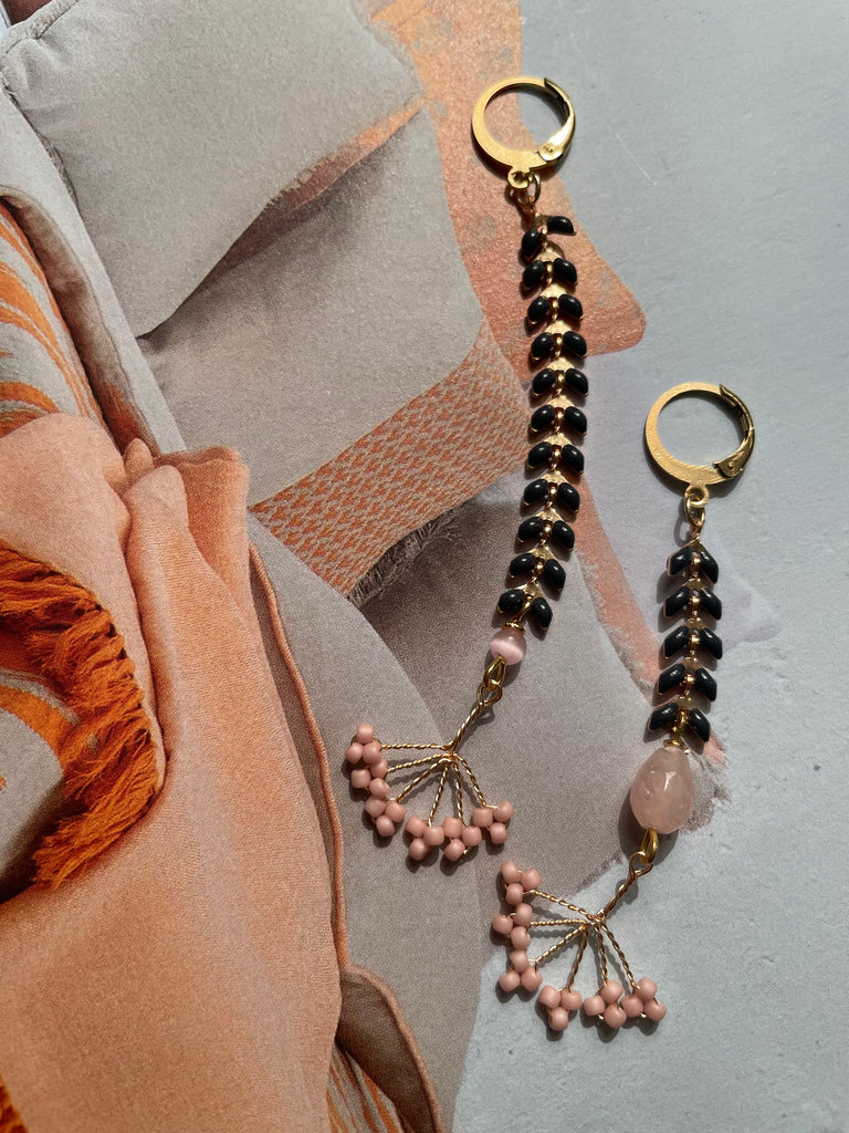 Coppia di orecchini della collezione “gemelli diversi” super leggeri e lineari, con un pizzico di originalità nel finale. Sono entrambi realizzati con una catenina piatta a lisca di pesce, smaltata in grigio piombo. Entrambi terminano con una piccola pietra rosa e un ventaglietto in conteria rosa Misurano circa 7 e 9 cm di lunghezza e sono rigorosamente anallergici.
