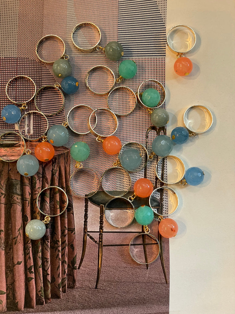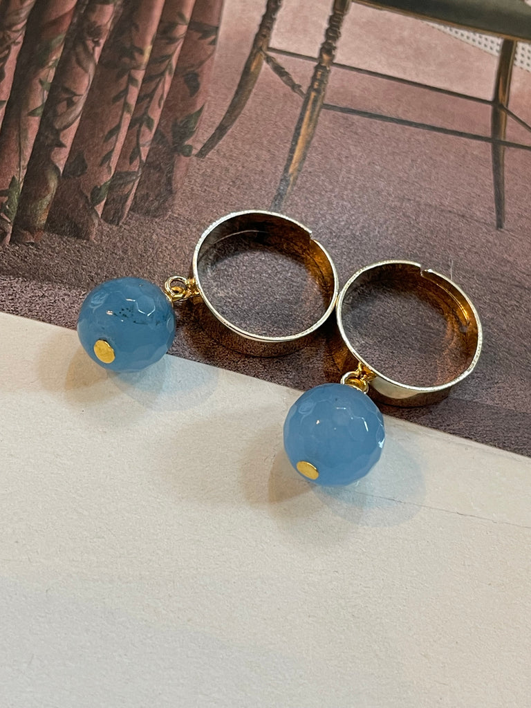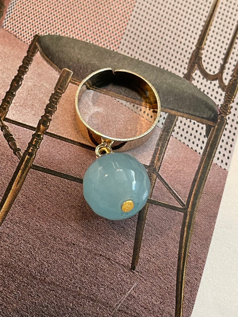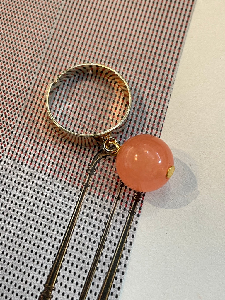 Anello di base metallica a fedina dorata, regolabile, con appesa una pallina in resina. Il diametro della pallina varia da 1,5 e 2 cm.
