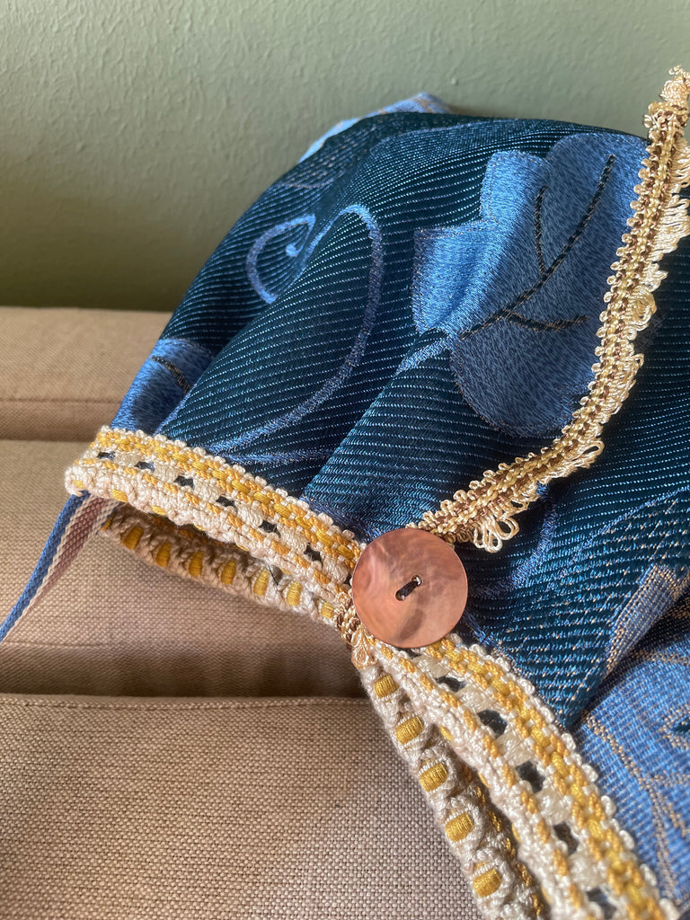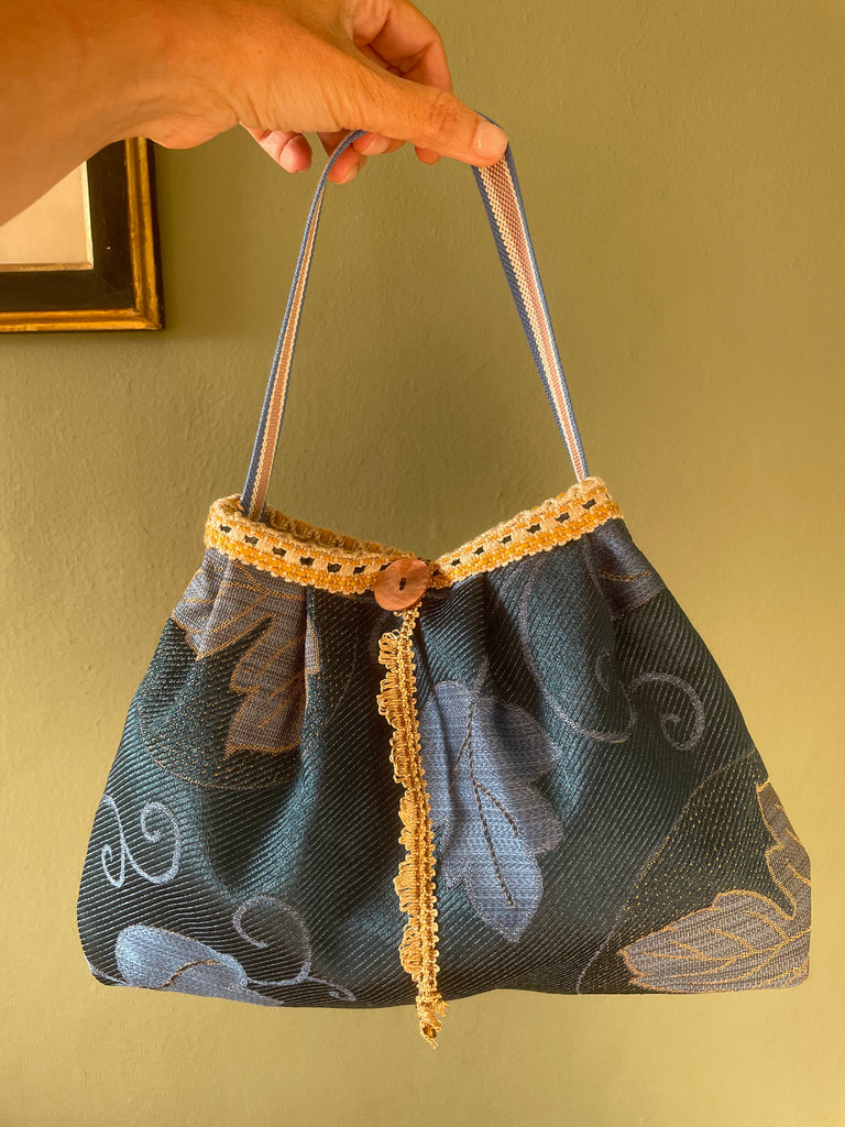 Borsa di medie dimensioni, cucita interamente a mano con tessuto da arredamento, doppiato, in modo da garantirne tenuta e consistenza. Il tessuto esterno è blu, con disegni di fiori stilizzati. La bordura della parte altra è beige-gialla, così come la sottile passamaneria che si arrotola attorno al bottone per la chiusura. Il manico è, invece, in cordone piatto bianco, bluette e bluette. La borsa misura 31 cm di larghezza per 20 di altezza. Pezzo unico.