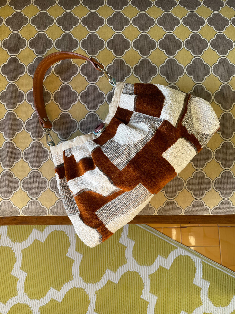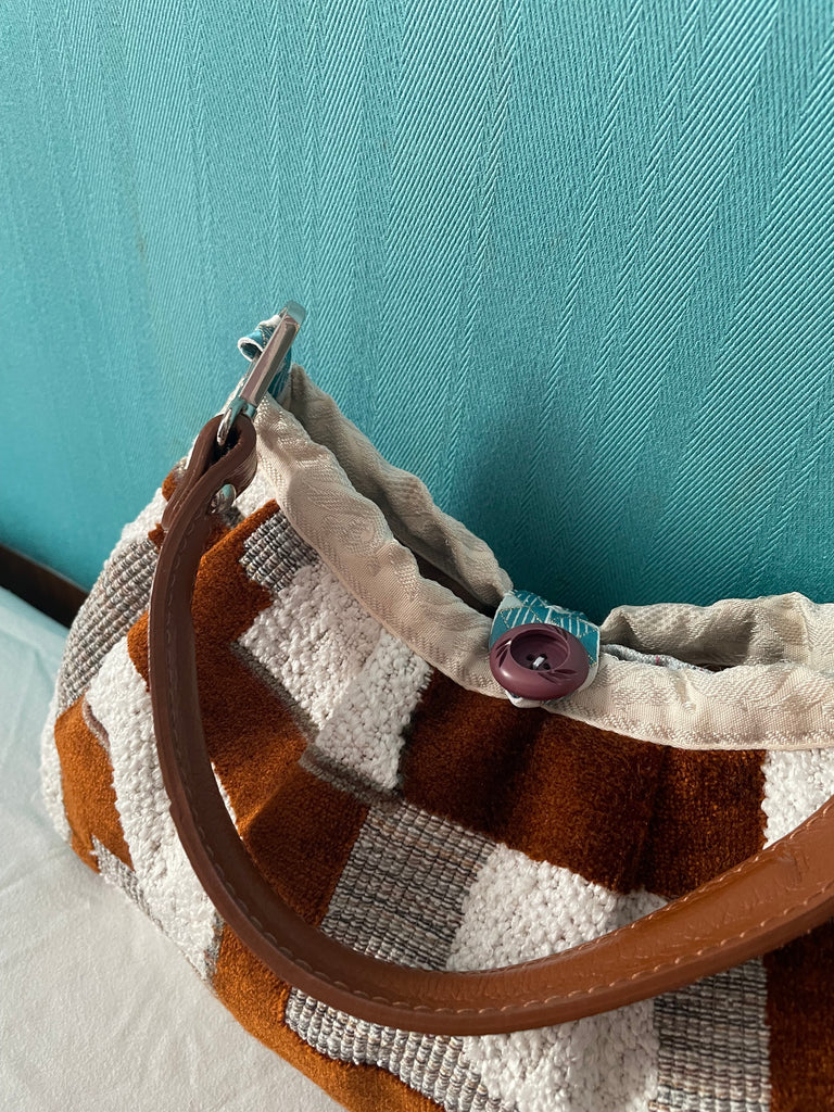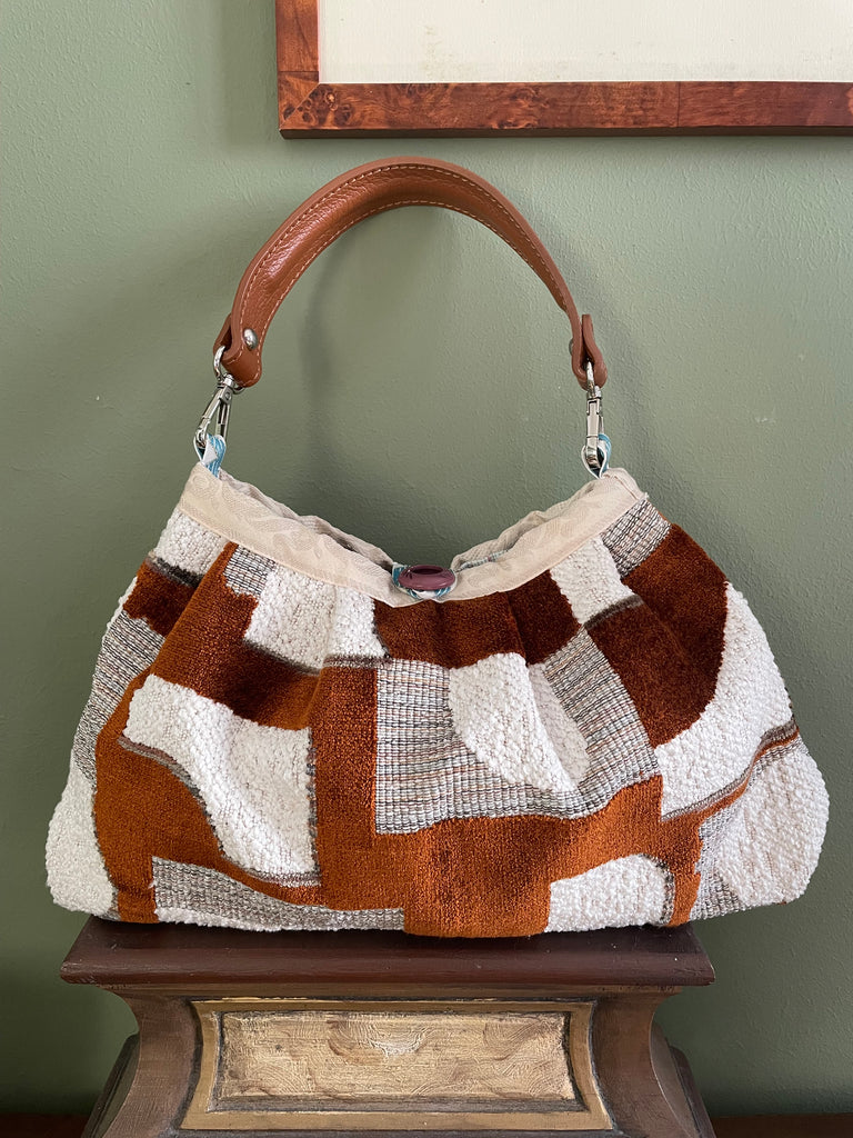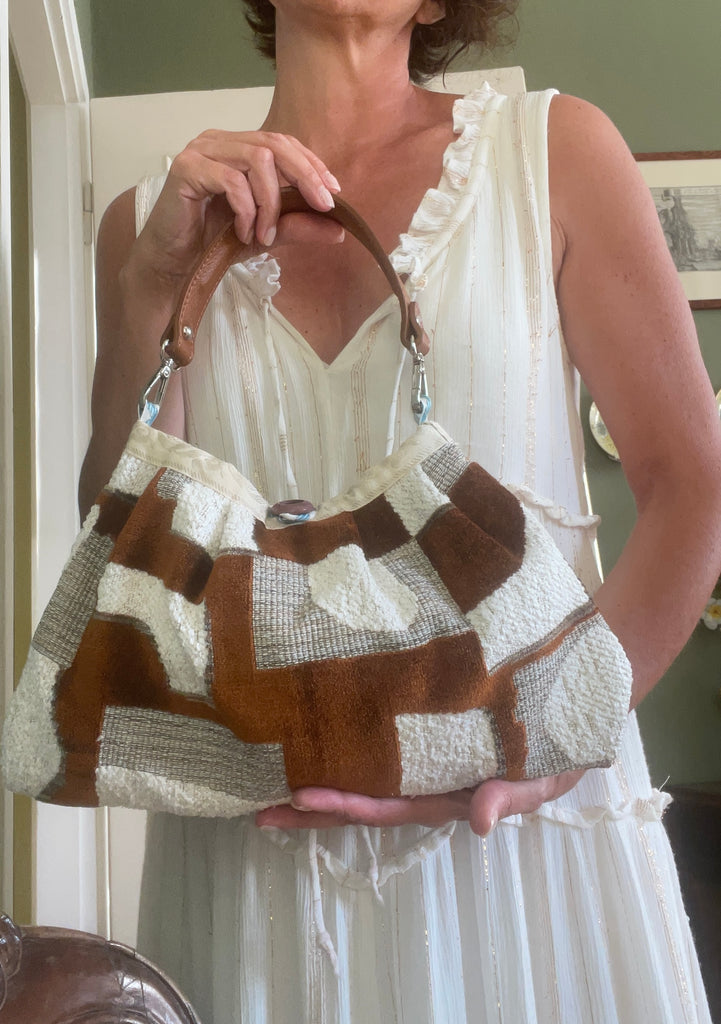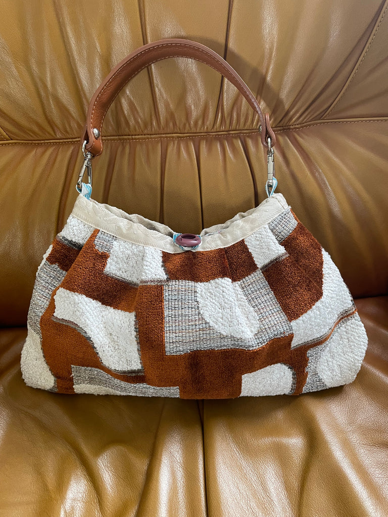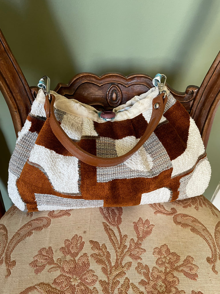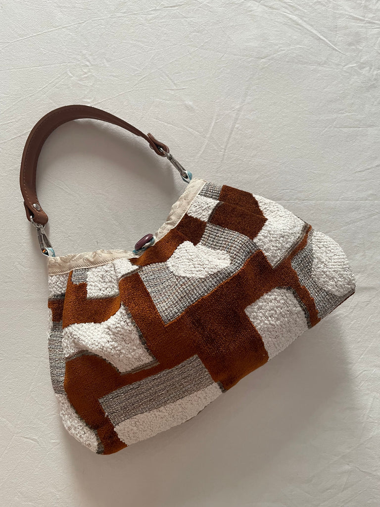 Borsa di medie dimensioni, cucita interamente a mano con tessuto da arredamento, doppiato, in modo da garantirne tenuta e consistenza. Il tessuto esterno è  in velluto a disegni irregolari, tra il bianco il marrone e il grigio. La passamaneria al bordo in alto è di un beige tenue, mentre il manico, staccabile, è color biscotto. La borsa misura 35 cm di larghezza per 22 di altezza. Pezzo unico.