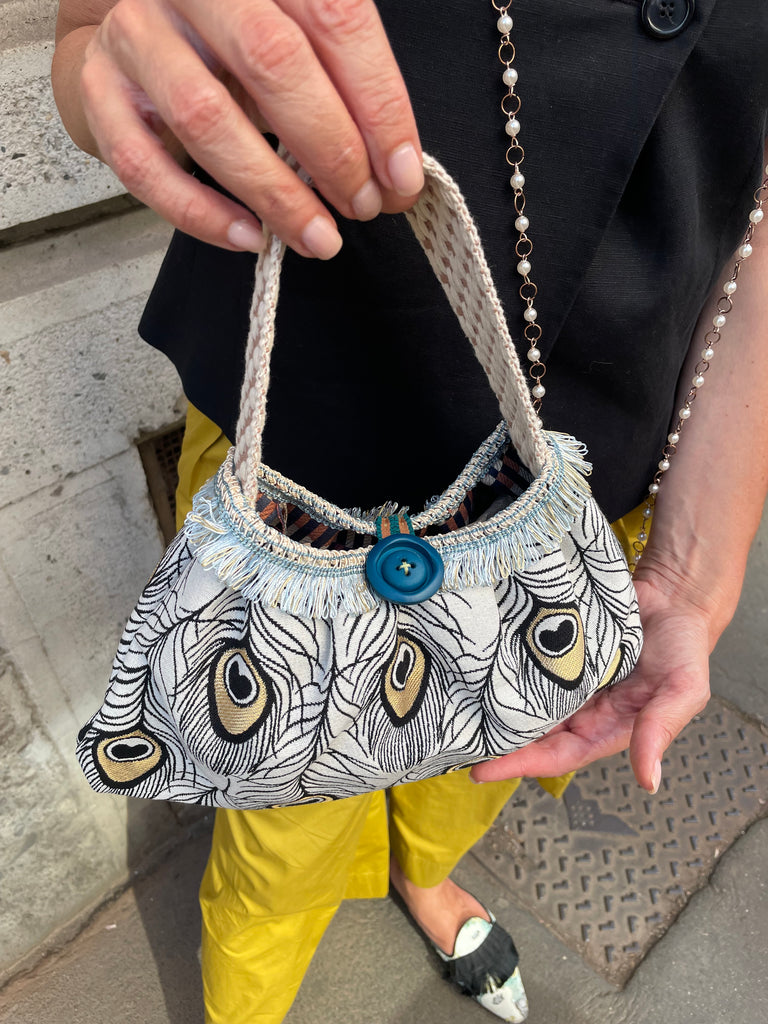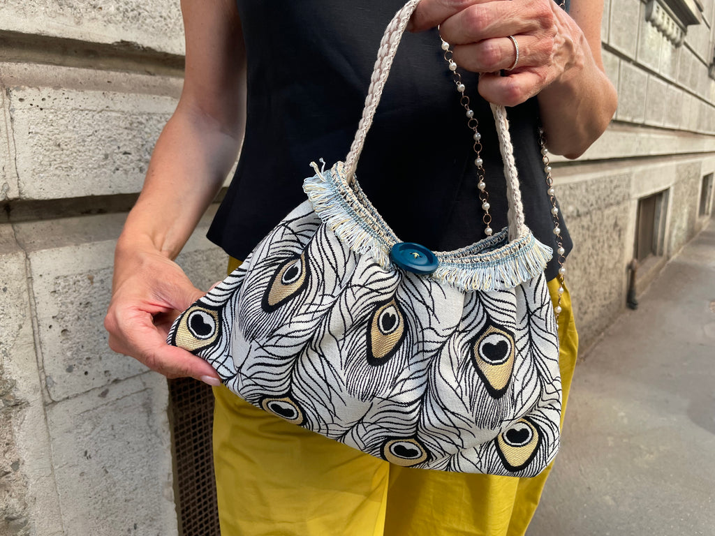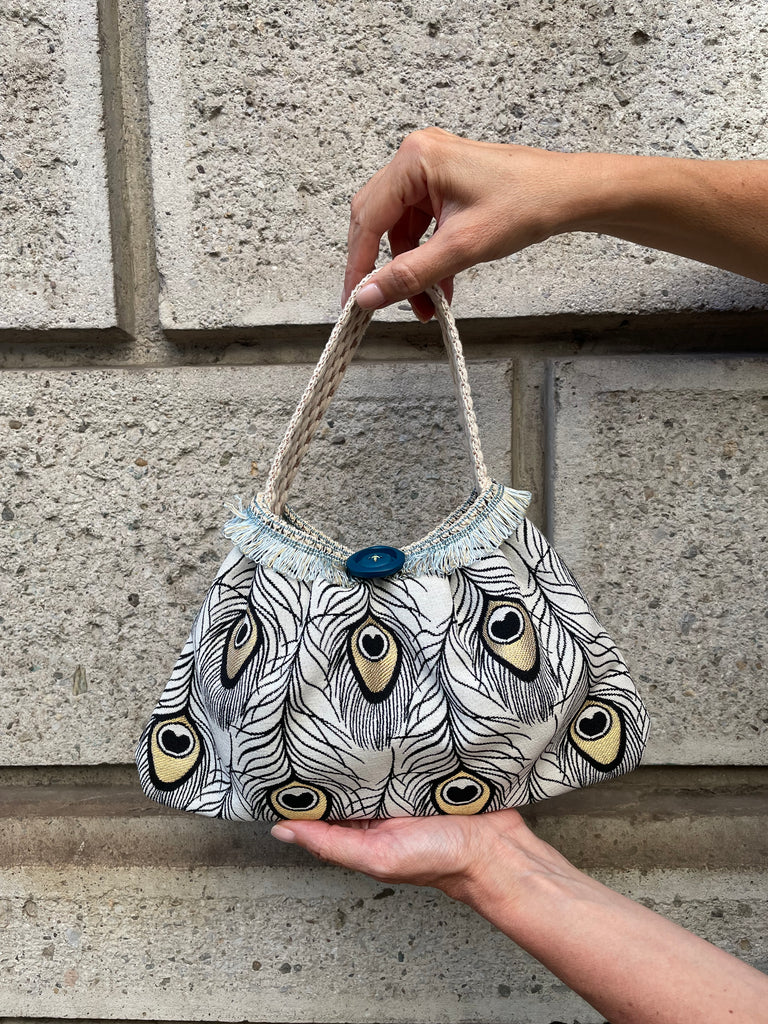 Borsa di medio-piccole dimensioni, cucita interamente a mano con tessuto da arredamento, doppiato, in modo da garantirne tenuta e consistenza. Il tessuto esterno è un cotone robusto a base bianca, con disegni neri e giallo pallido, che rappresentano delle piume di pavone. La bordura di passamaneria è bianca e azzurra con frange, mentre il manico, che misura 29 cm ed è anch’esso in tessuto, è a pois bianco-beige. La borsa misura 35 cm di larghezza per 25 di altezza.