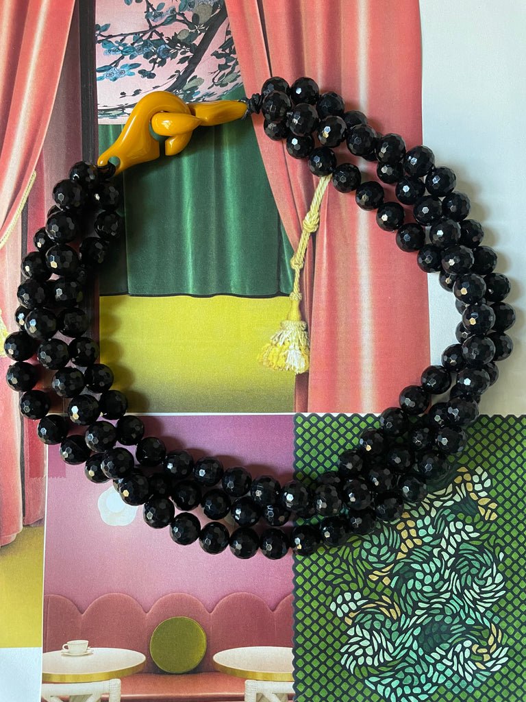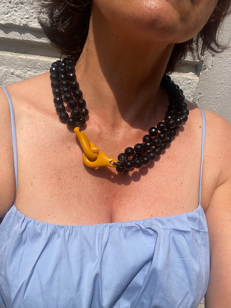 Collana girocollo morbida, totalmente in resina, con tre giri di perle in resina semilucide e doppio fermaglio ad uncino in giallo ocra. Il fermaglio può anche essere messo lateralmente in modo da far vedere il contrasto cromatico. Lunghezza 58 cm circa.