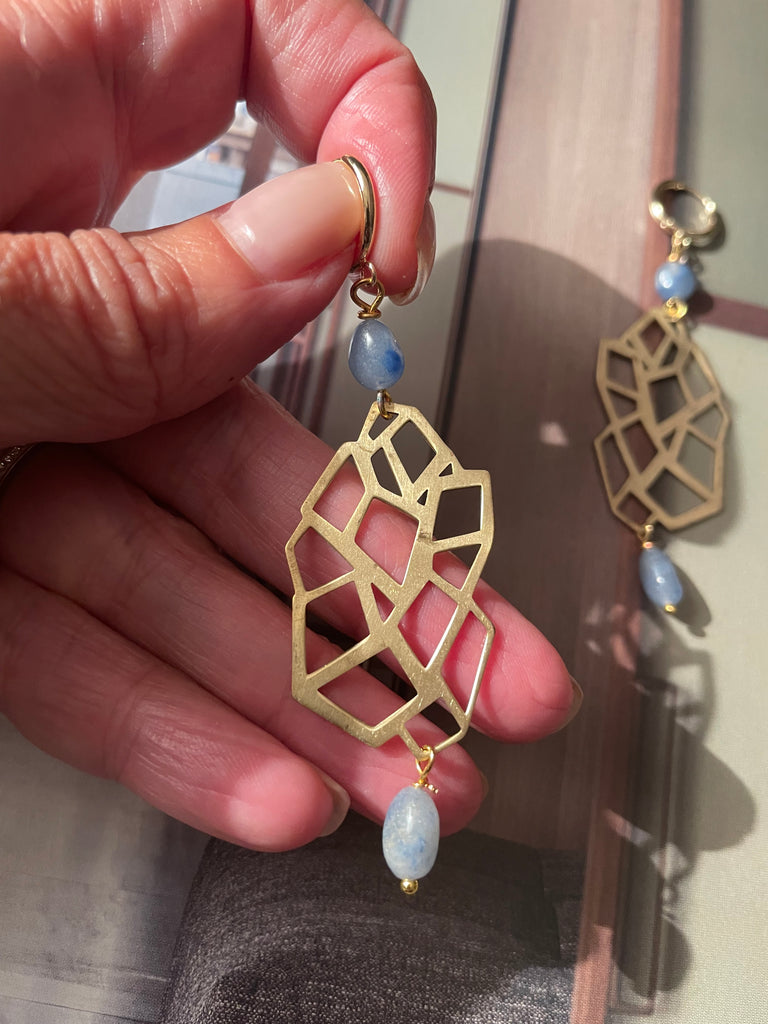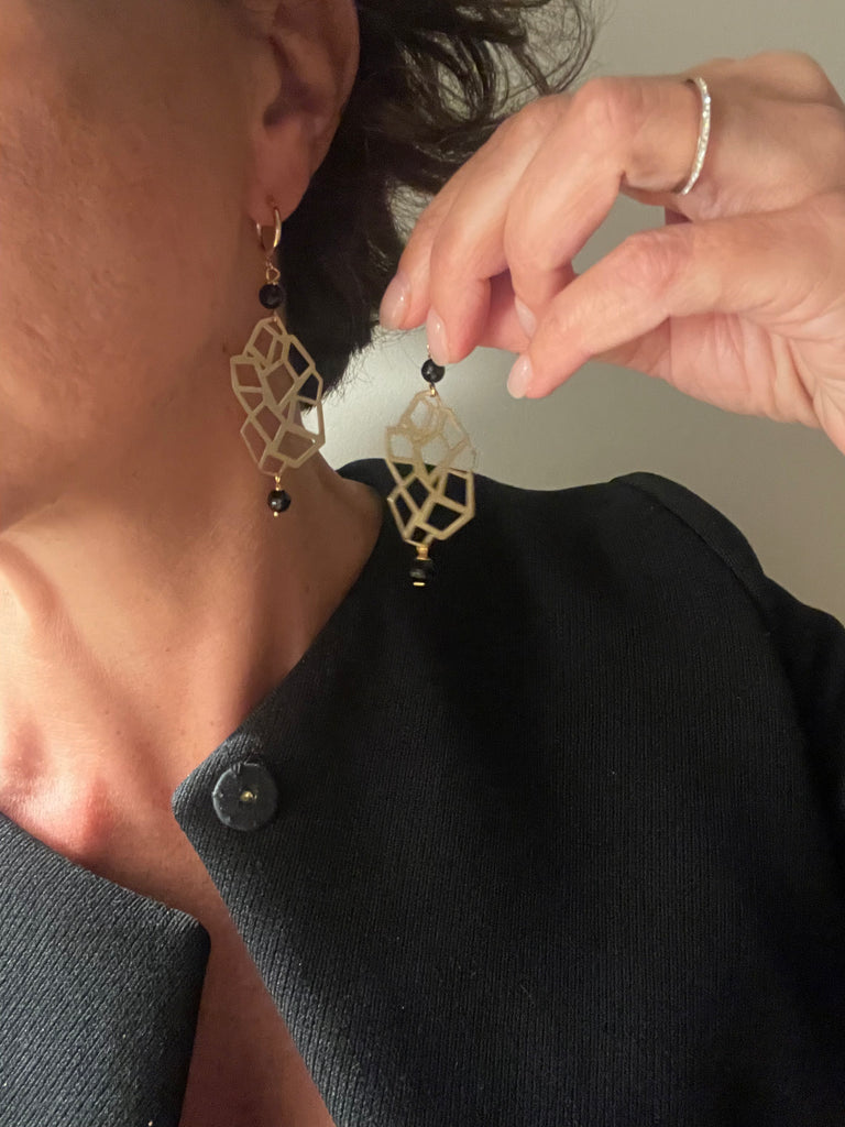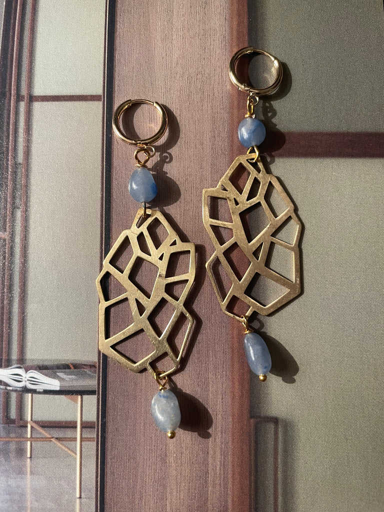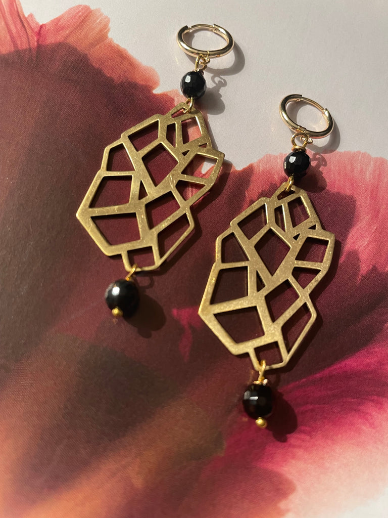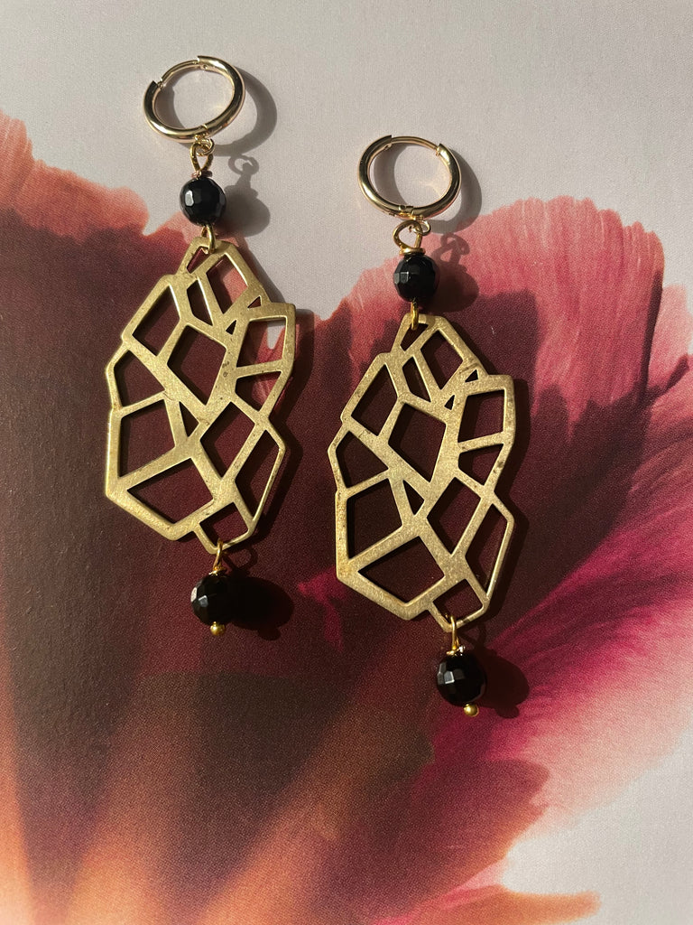 Orecchini geometrici, ultra piatti, con motivo geometrico in ottone, arricchito da sue piccole pietre dure. Misurano circa 7 cm di lunghezza e sono rigorosamente anallergici.