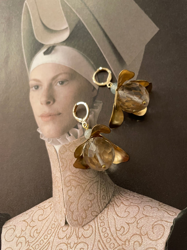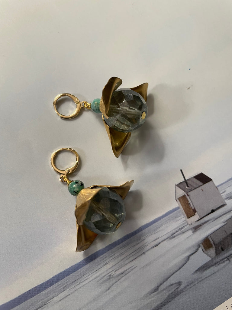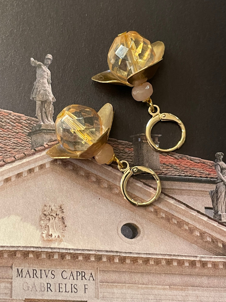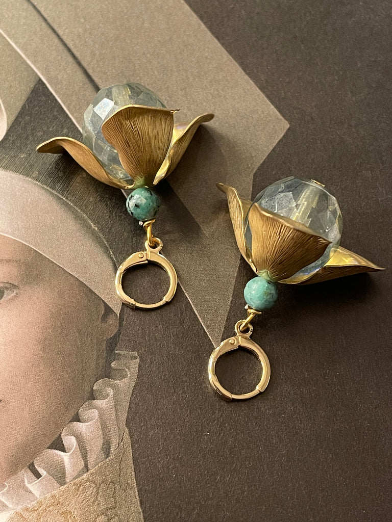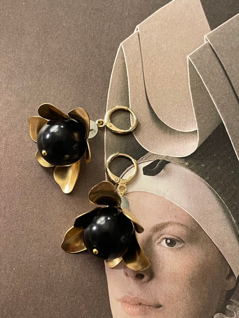 Orecchini corti e compatti ma di grandissimo effetto grazie a questo grande fiore in ottone anticato, i cui petali si aprono su grandi perle di cristallo o resina. Misurano circa 3/4 cm e sono rigorosamente anallergici.