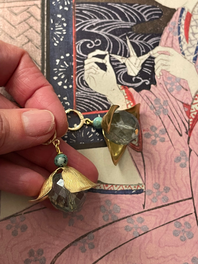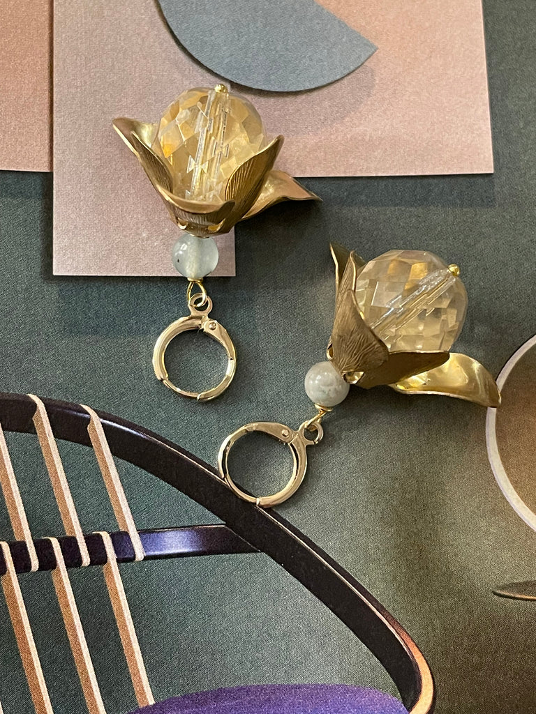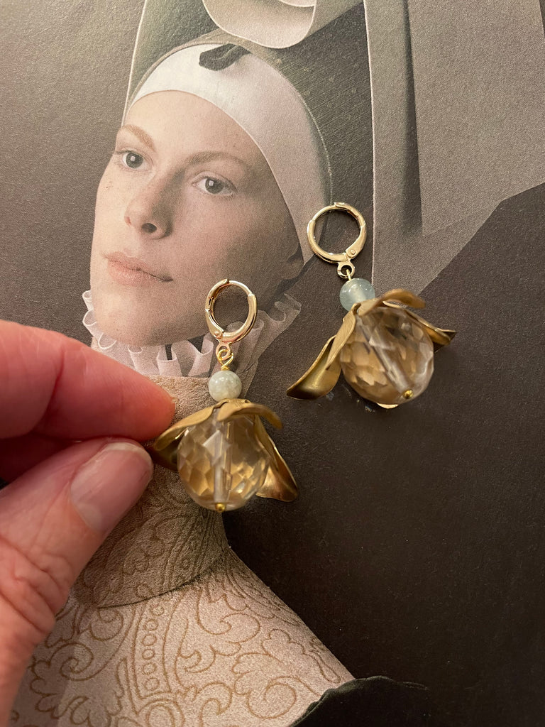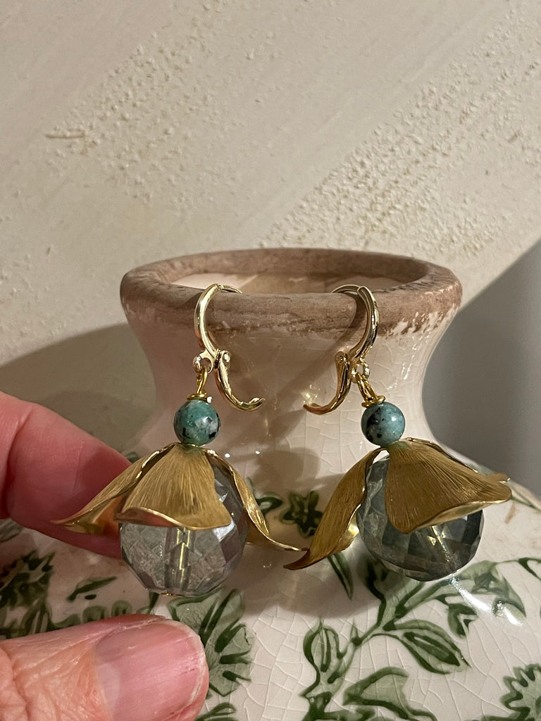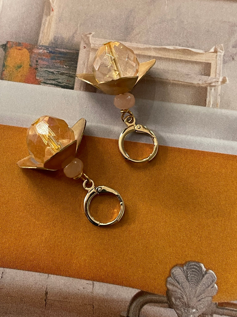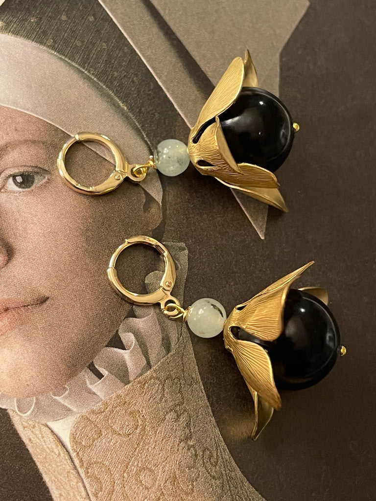 Orecchini corti e compatti ma di grandissimo effetto grazie a questo grande fiore in ottone anticato, i cui petali si aprono su grandi perle di cristallo o resina. Misurano circa 3/4 cm e sono rigorosamente anallergici.