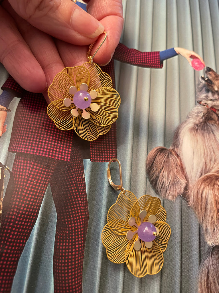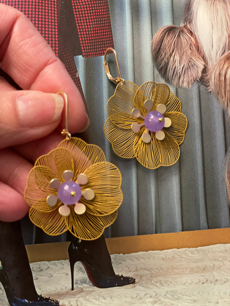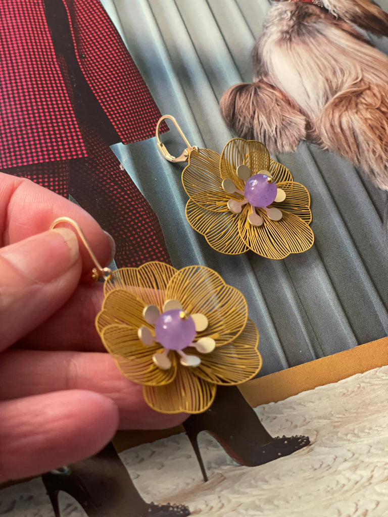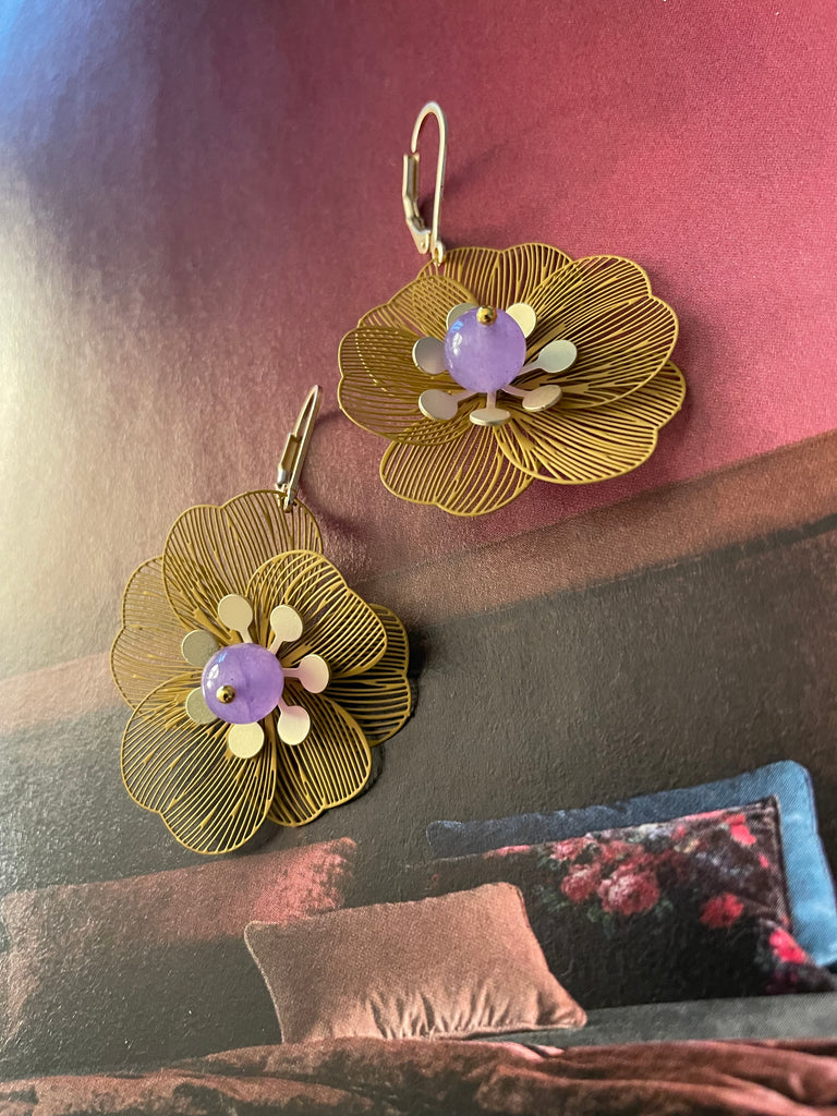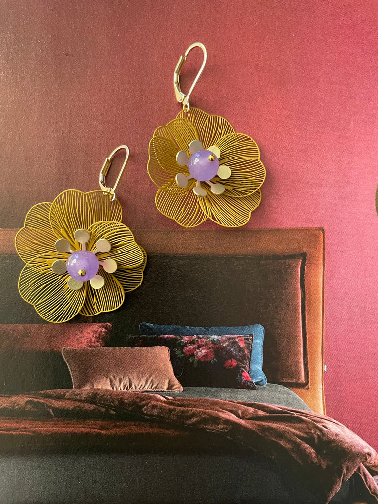 Leggeri come piume ma con grande personalità, anche se piccoli di dimensione, questi orecchini sono una semplice filigrana giallo ocra, completati da un motivo dorato tridimensionale e da una pietra in agata viola. Sono grandi circa 4 cm e rigorosamente anallergici.