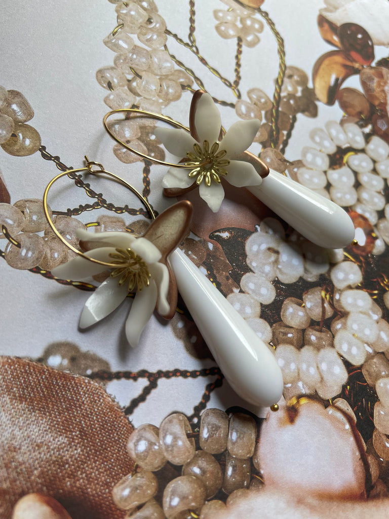 Orecchini fioriti nel perfetto stile arzigogolo, nei quali la goccia in resina bianca si abbina al fiore anch’esso in resina bianca. In centro, una leggera corolla dorata, per dare ulteriore luminosità. Misurano circa 7 cm di lunghezza e sono rigorosamente anallergici .