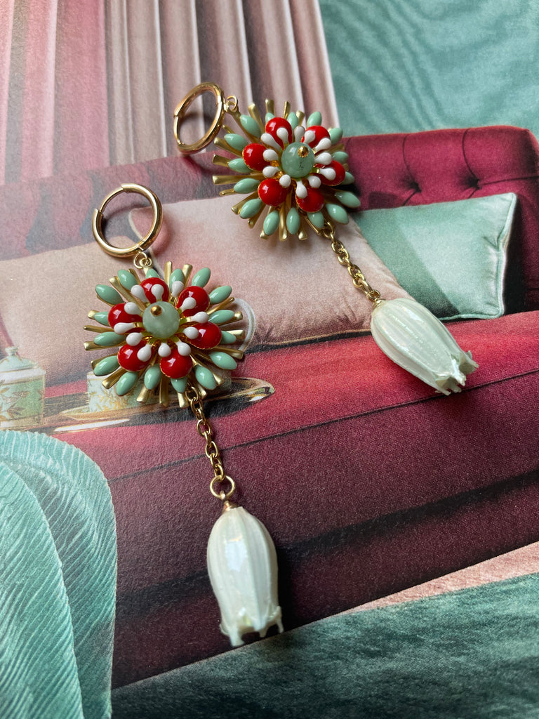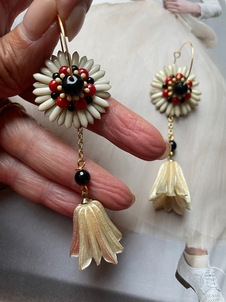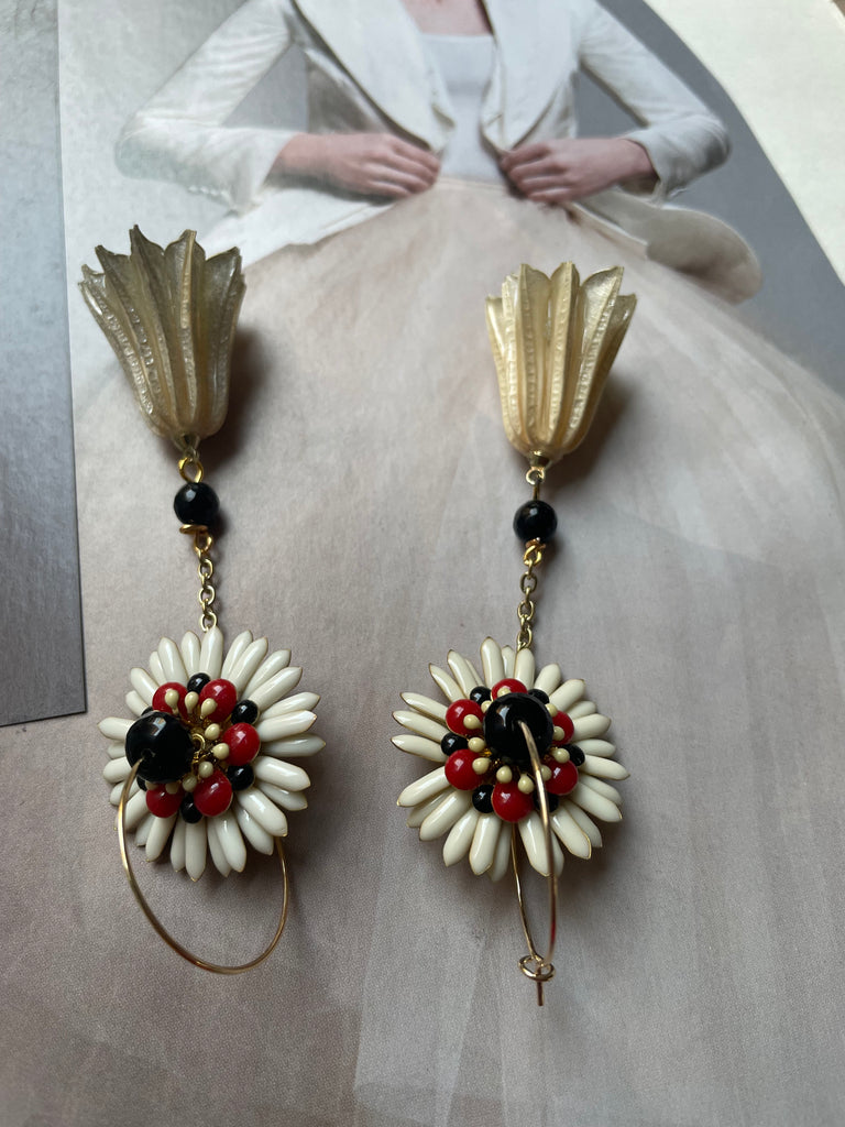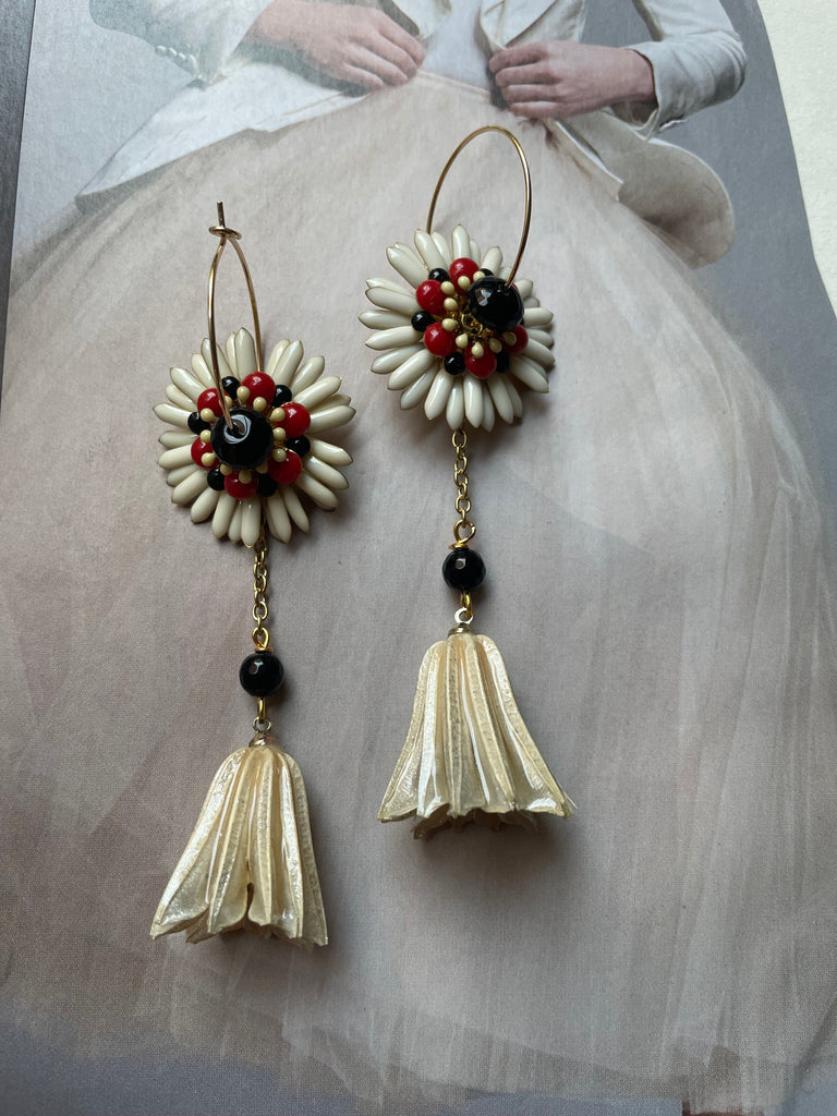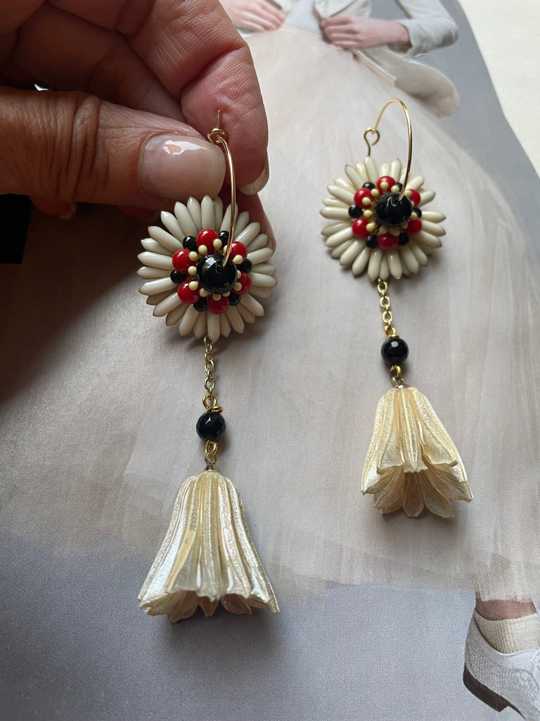 Orecchini spettacolari che mescolano il fiore in metallo smaltato, tridimensionale e lavorato, alle pietre dure di dettaglio e, soprattutto, a fiori veri messi sotto resina. L’effetto è meraviglioso! Misurano circa 10/12 cm di lunghezza e sono rigorosamente anallergici.