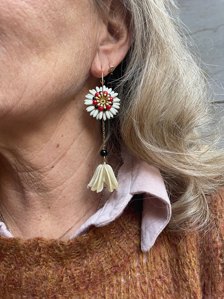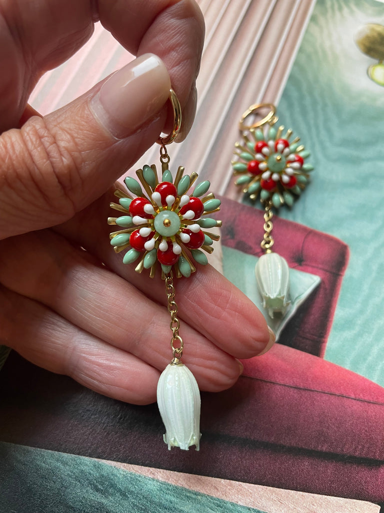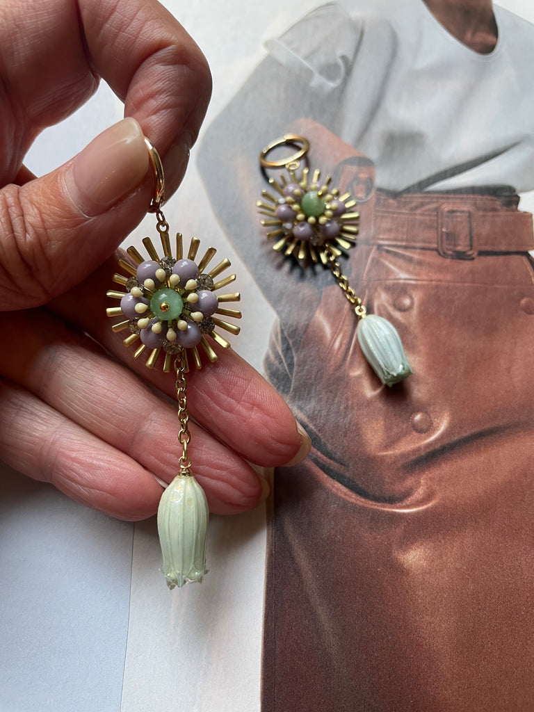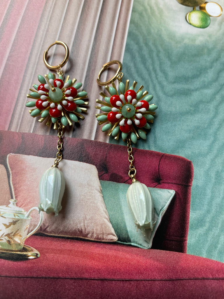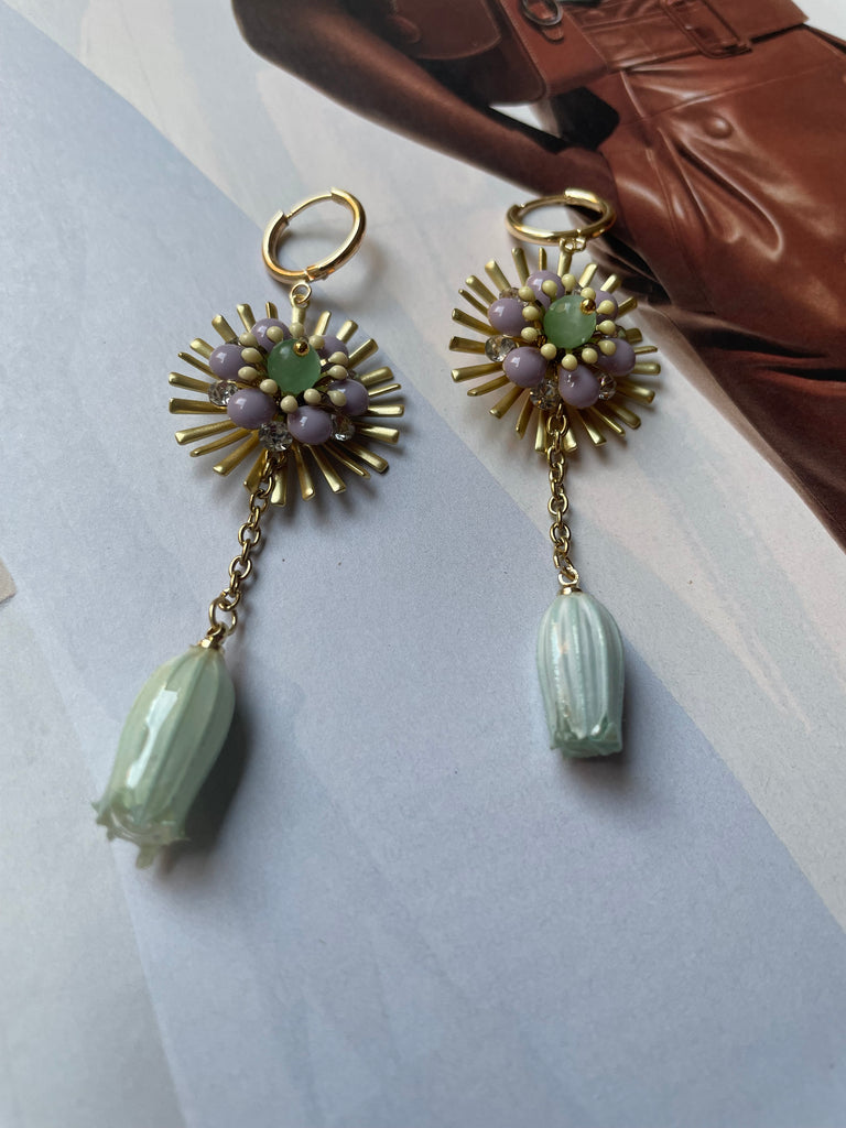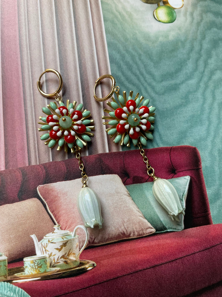 Orecchini spettacolari che mescolano il fiore in metallo smaltato, tridimensionale e lavorato, alle pietre dure di dettaglio e, soprattutto, a fiori veri messi sotto resina. L’effetto è meraviglioso! Misurano circa 10/12 cm di lunghezza e sono rigorosamente anallergici.
