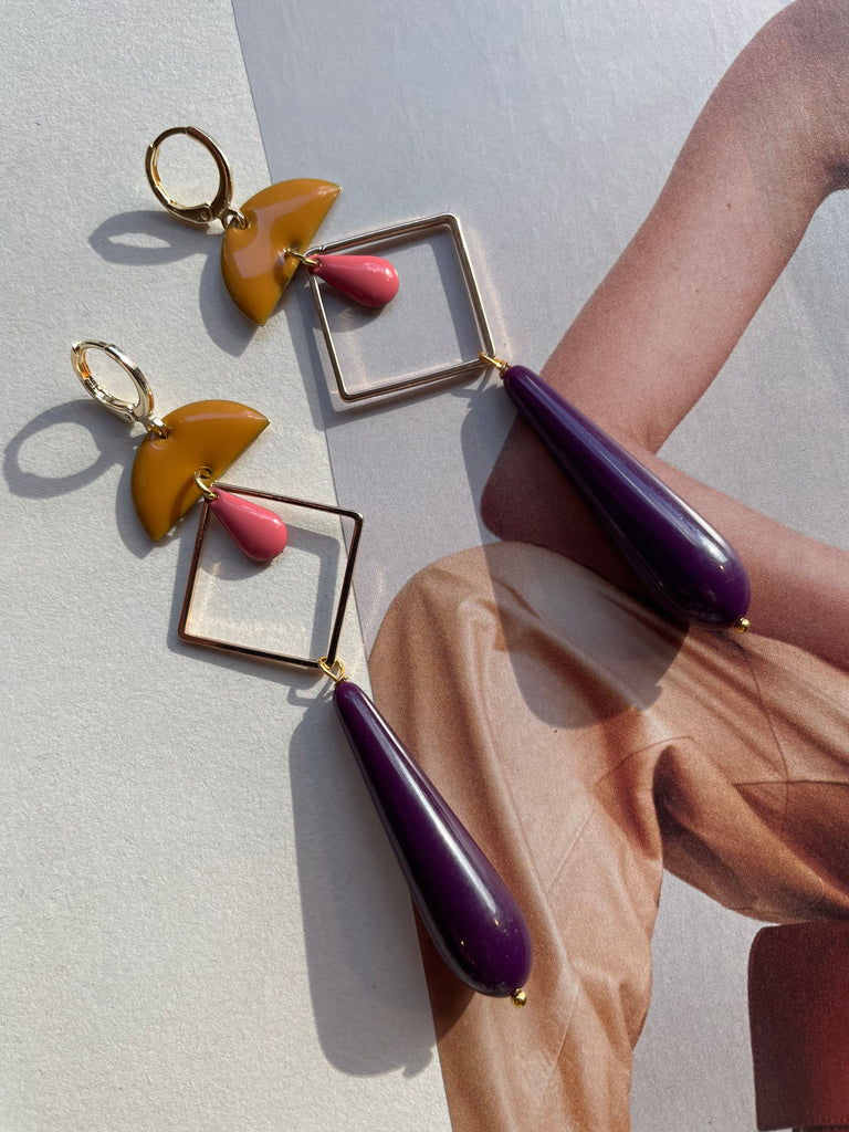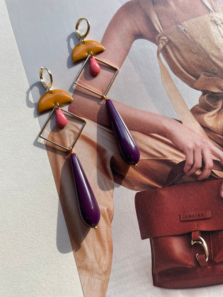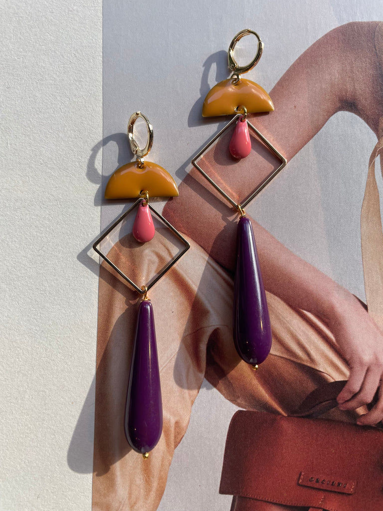 Orecchini lunghi con motivo geometrico e smalto. Una lunga goccia in resina viola pende da un motivo in metallo a forma di rombo. Nella parte alta, uno smalto a mezzaluna color ocra e un secondo, a goccia, in rosa antico. Misurano quasi 10 cm di lunghezza e sono rigorosamente anallergici.