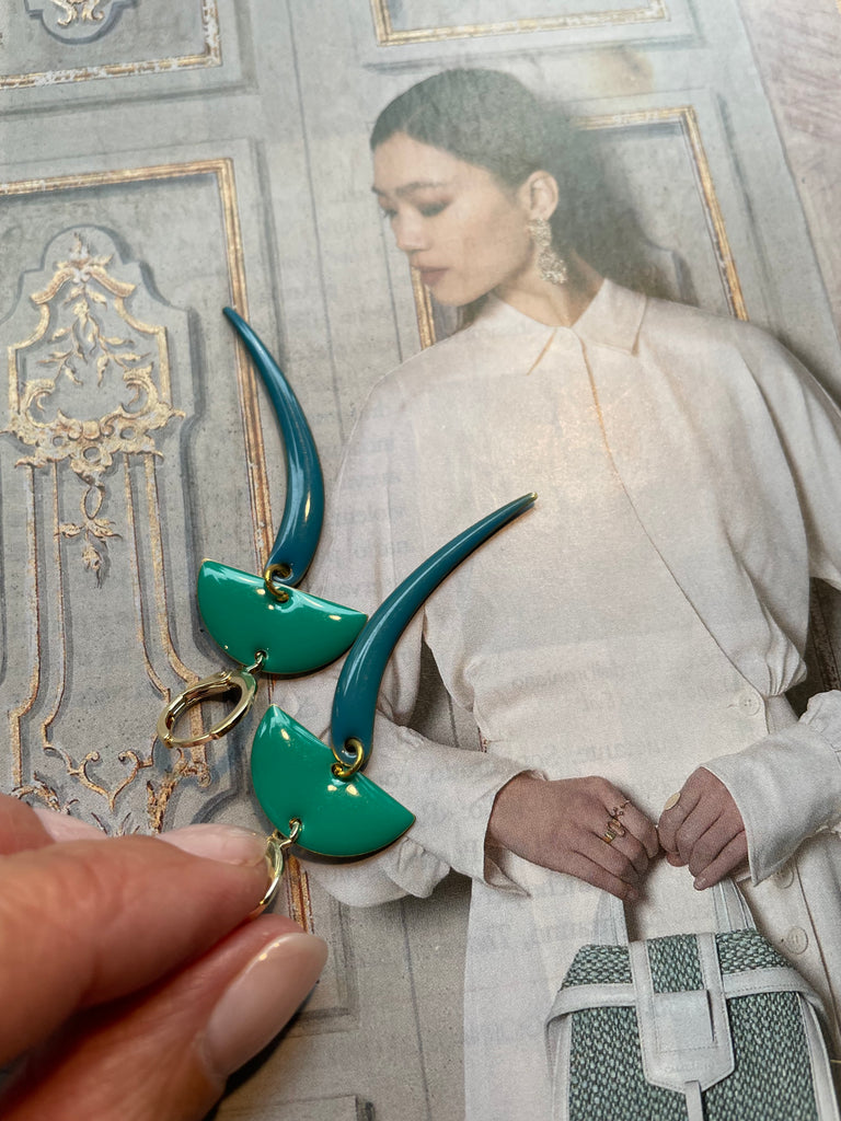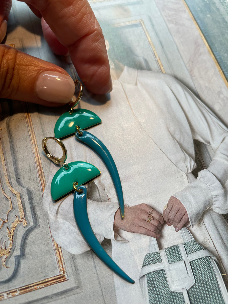 Orecchini semplici e lineari formati da una mezzaluna in metallo smaltato e molto luminoso, dalla quale pende un motivo, anch’esso smaltato, simile ad una virgola o a una codina. Misurano circa 6 cm di lunghezza e sono rigorosamente anallergici.