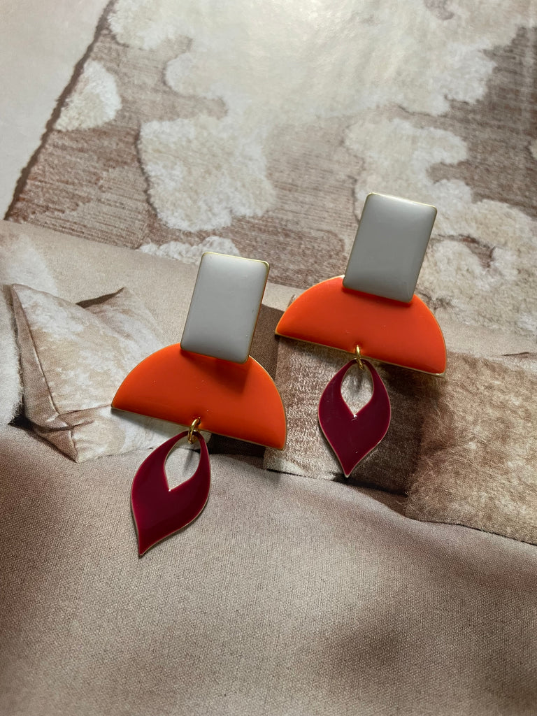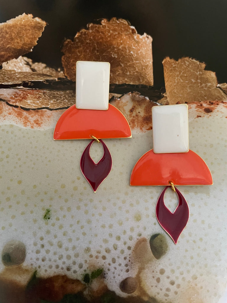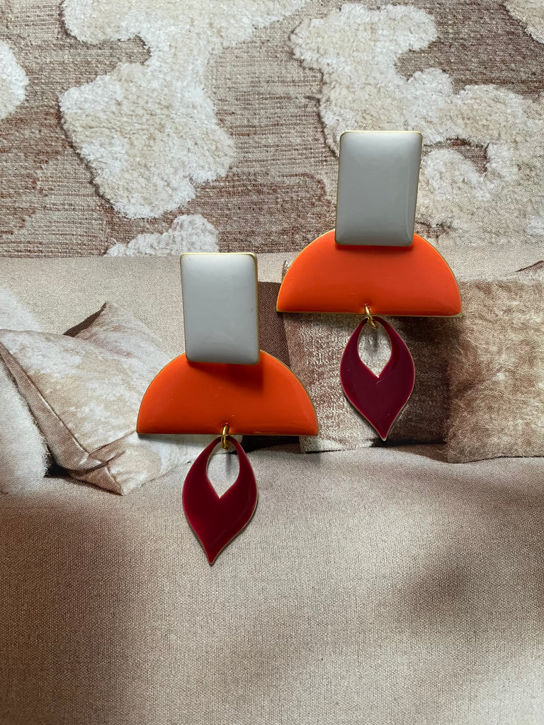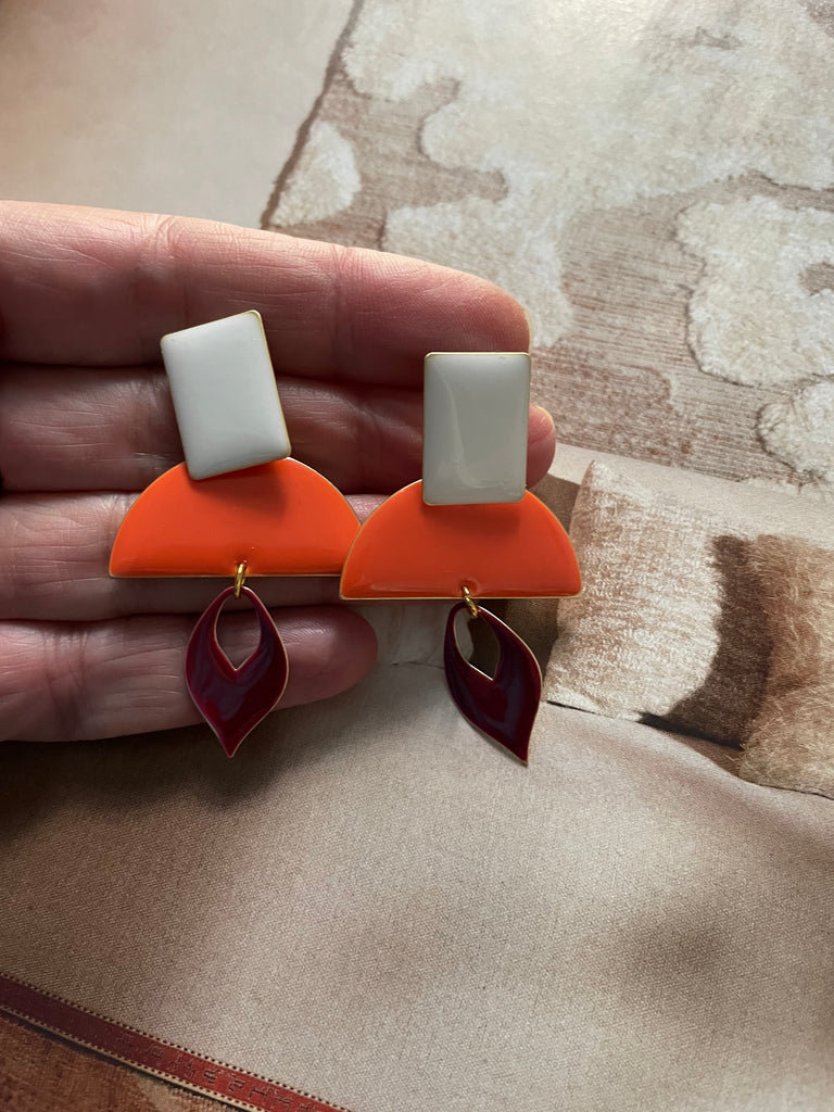 In questi orecchini risaltano la vivacità dei colori e la luminosità dello smalto! Arancio, bianco e bordeaux si mescolano e creano una insolita armonia, anche nelle forme. Misurano intorno ai 5 cm di lunghezza e sono rigorosamente anallergici.