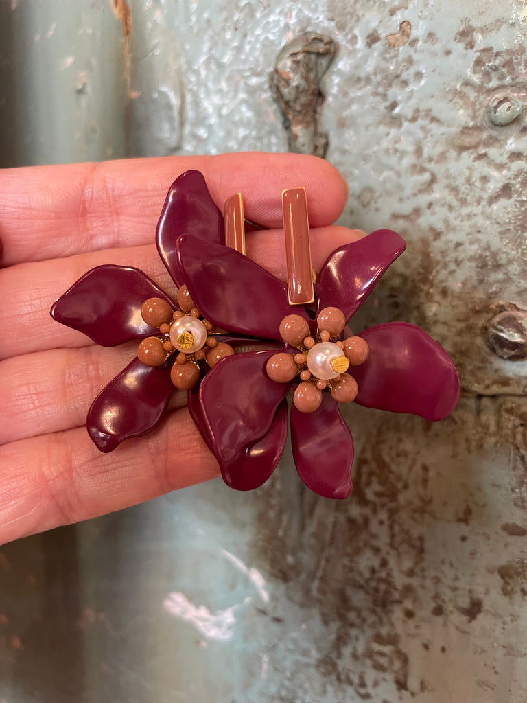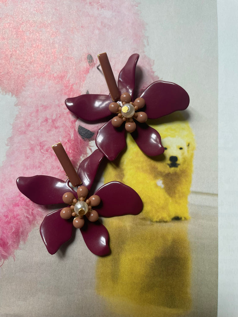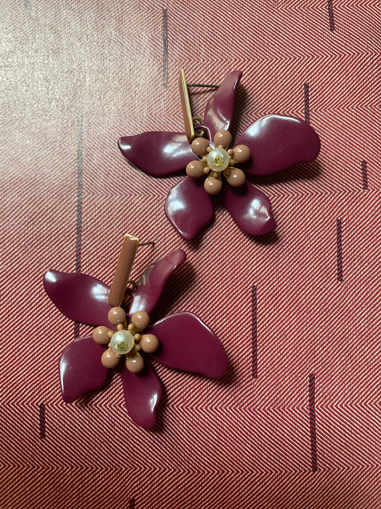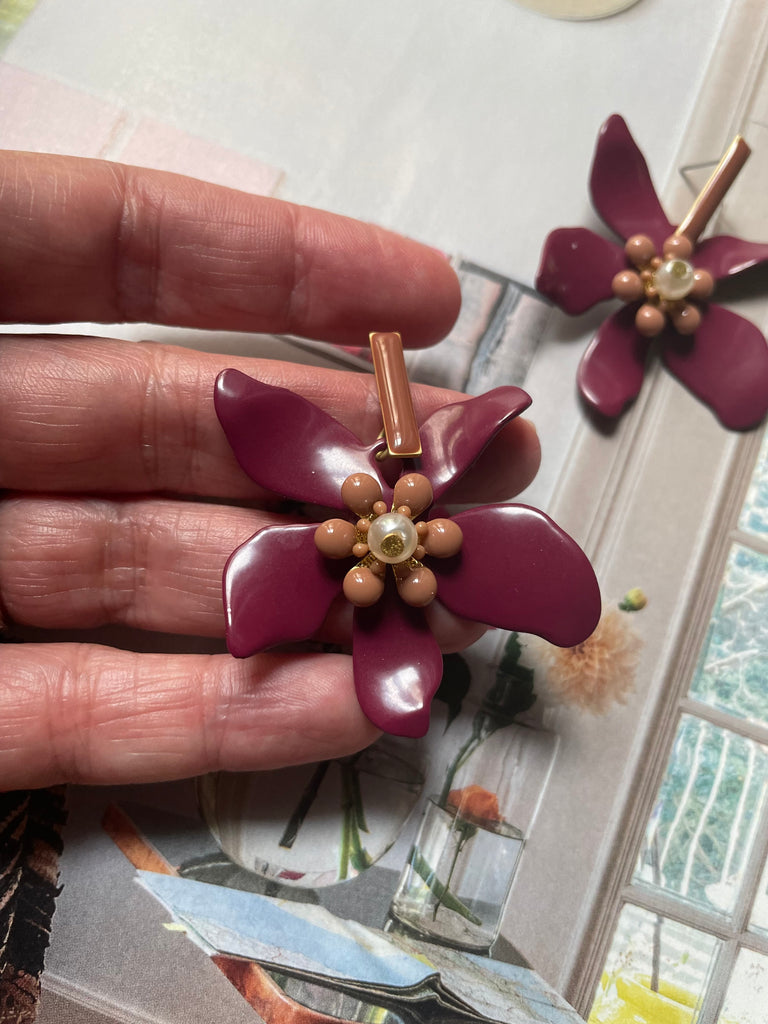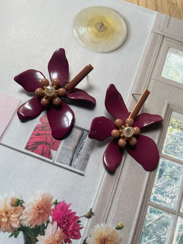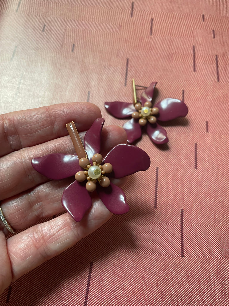 Orecchini grandi, in smalto semilucido, con piccola barretta smaltata che copre il lobo, da cui pende un grande fiore color amaranto. Al suo interno, un secondo fiore a piccoli petali smaltati, color rosa antico. Misurano circa 6 cm di grande grandezza e sono rigorosamente anallergici