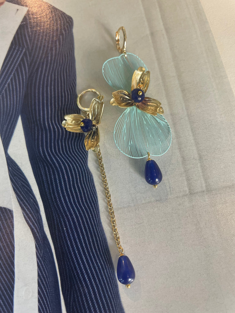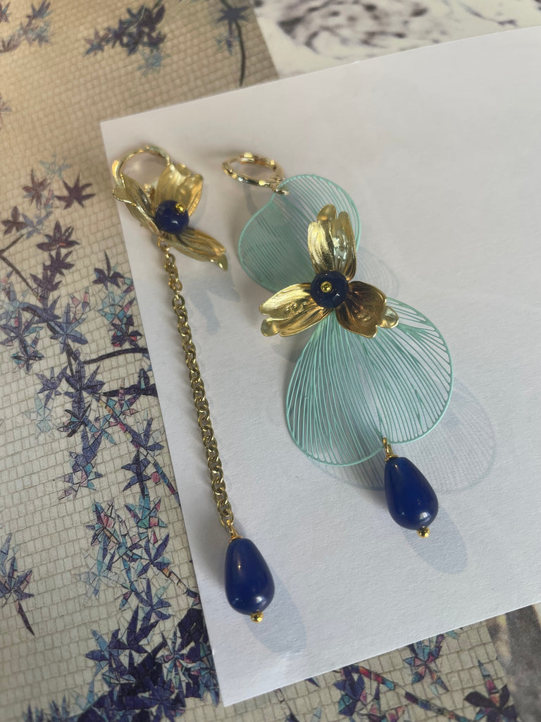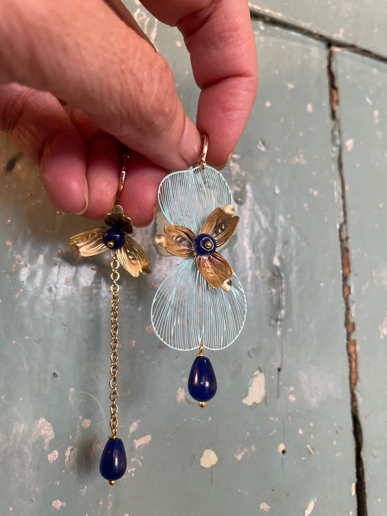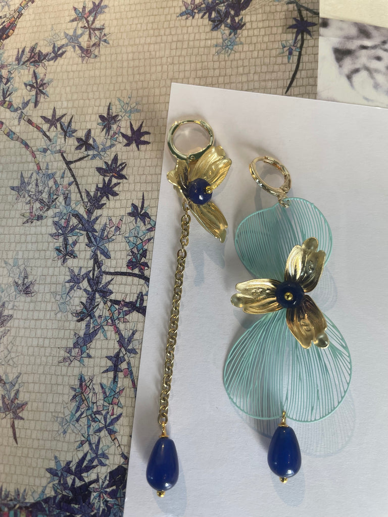 Leggerissimi e ariosi: un’ala in filigrana azzurro chiaro, due fiori dorati aperti e qualche piccola pietra in giada blu. Lunghi il giusto per essere raffinati. Misurano 8 e 6 cm di lunghezza e sono rigorosamente anallergici.