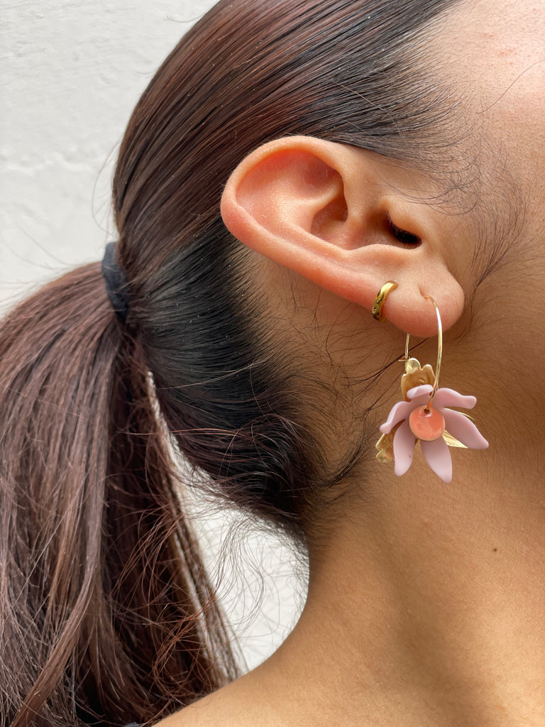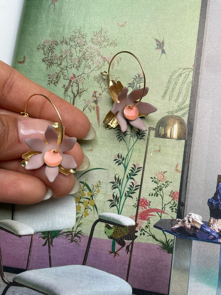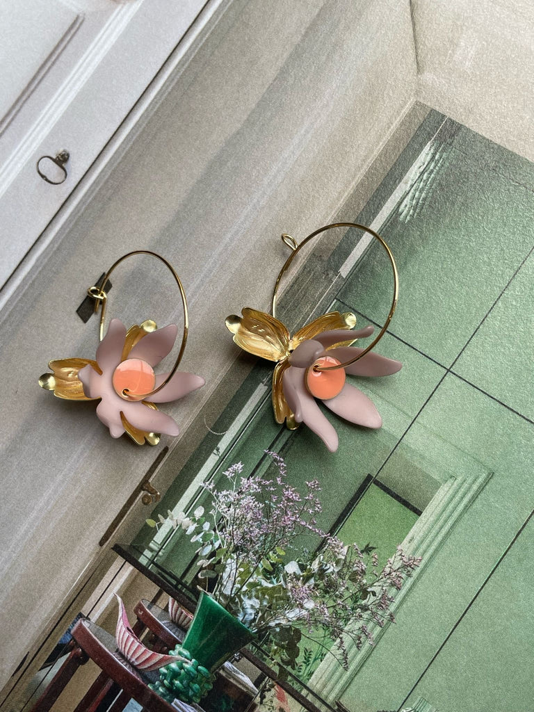 Coppie di orecchini “i piccolini” con fiore in resina rosa antico e smaltino centrale color salmone. Sul retro, come sfondo, un fiore dorato a tre petali. Lunghezza circa 4 cm.