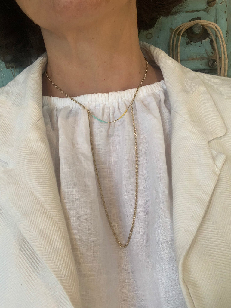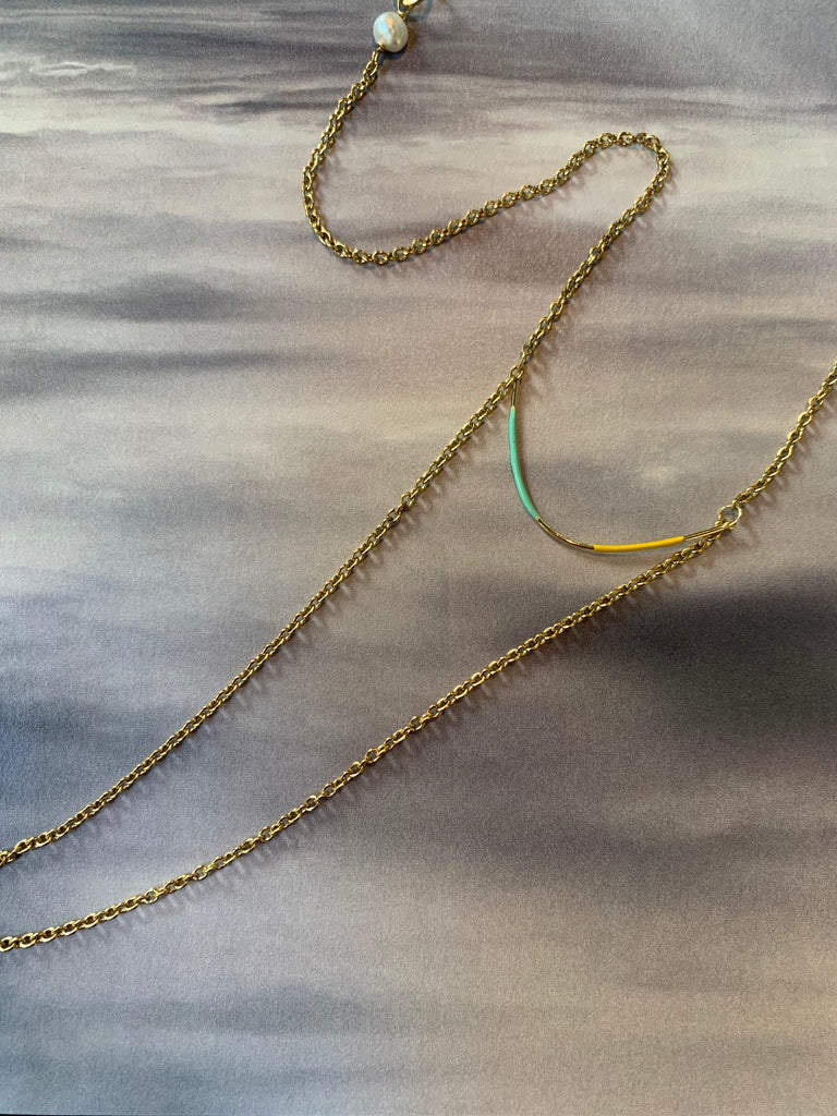 Collana dorata sottile e delicata, con un solo punto di colore, al centro. Una catenina dorata avvolge il collo, diventando una sottile curva di metallo smaltato nella parte centrale, colorandosi di azzurro e giallo. Centralmente, una seconda catenina crea un motivo allungato che sparisce nella scollatura. Il girocollo è lungo 39,5 cm.