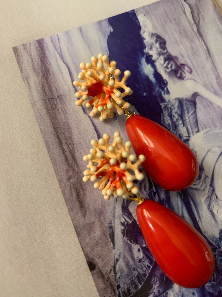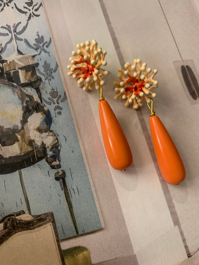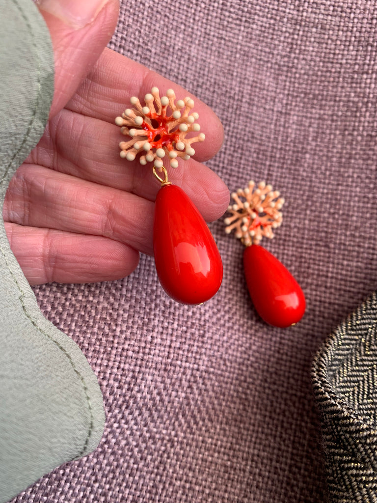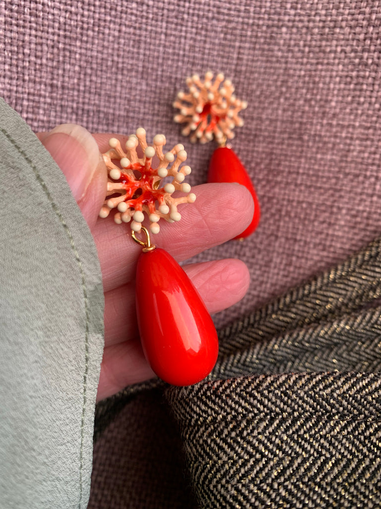 Coppia di orecchìni con monachella lavorata e smaltata, simile a un corallo, da cui pendono coloratissime gocce in resina leggera. Lunghezza totale circa 7 cm. Rigorosamente anallergici